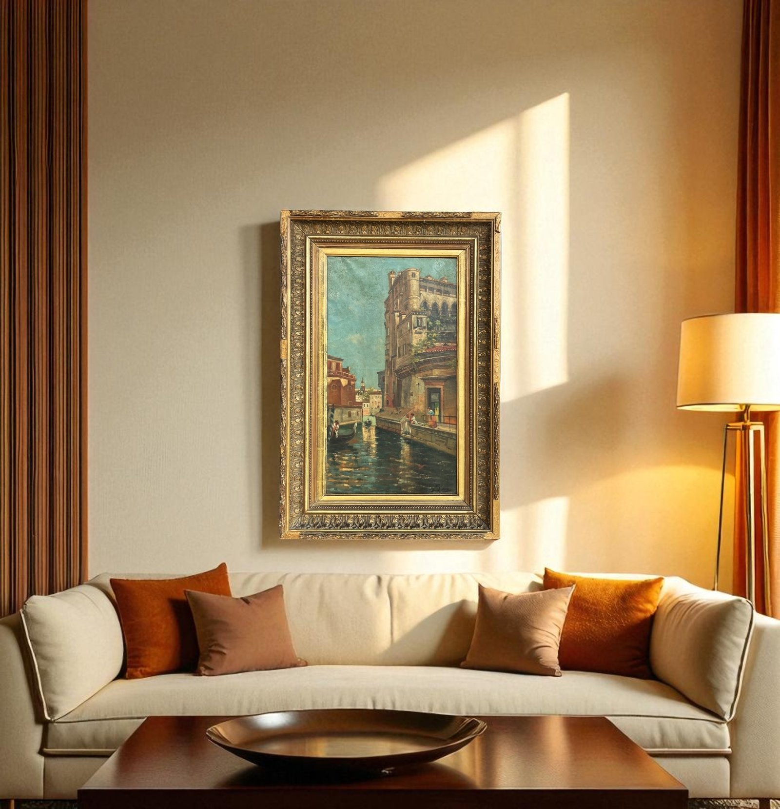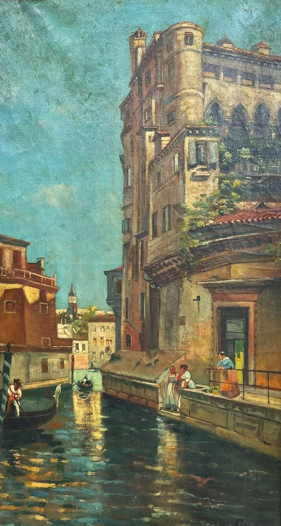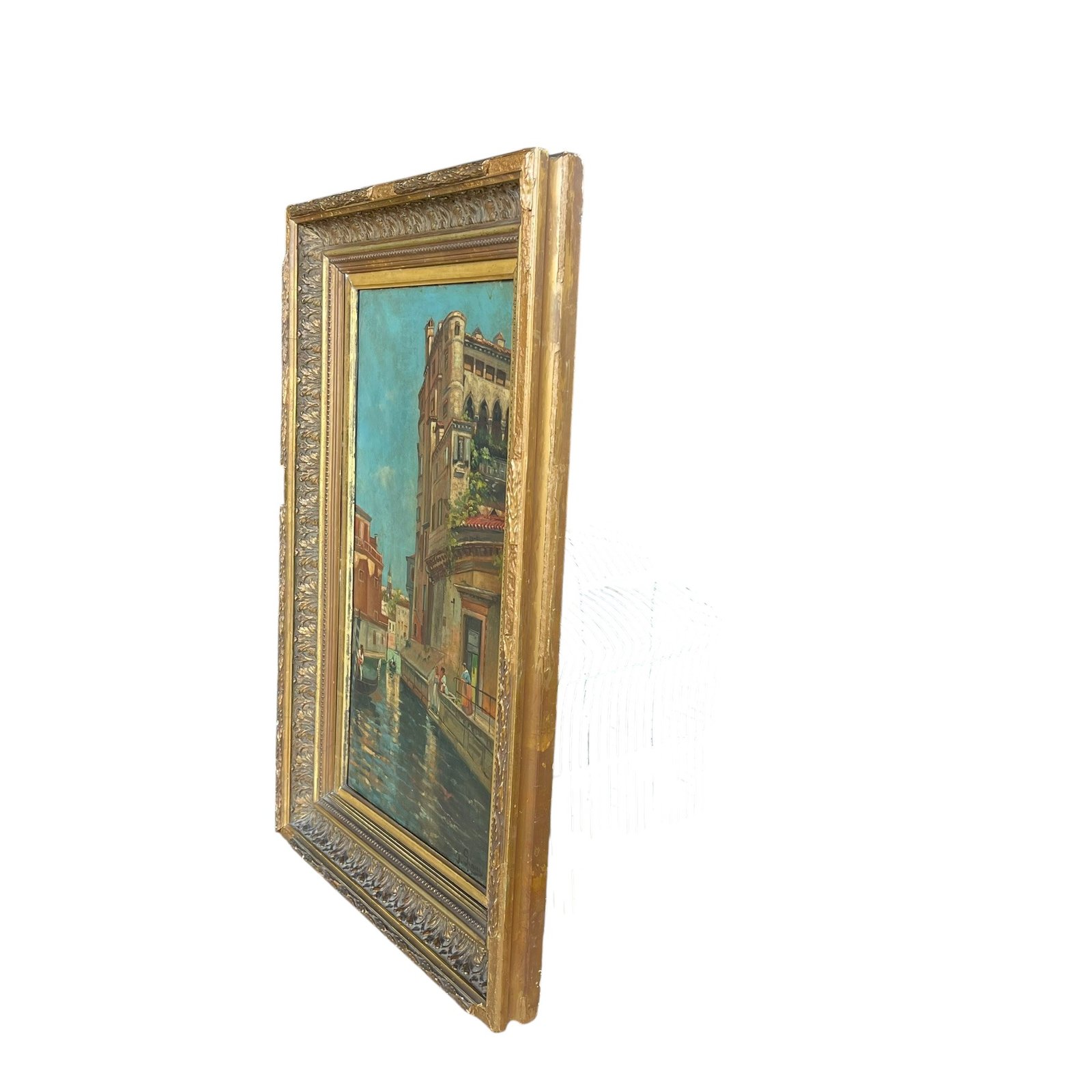 This beautiful painting is an original oil on canvas. It depicts a lovely decorative view of a canal in Venice with several gondolas sailing. The painting was created at the end of the 19th century by an Italian master.