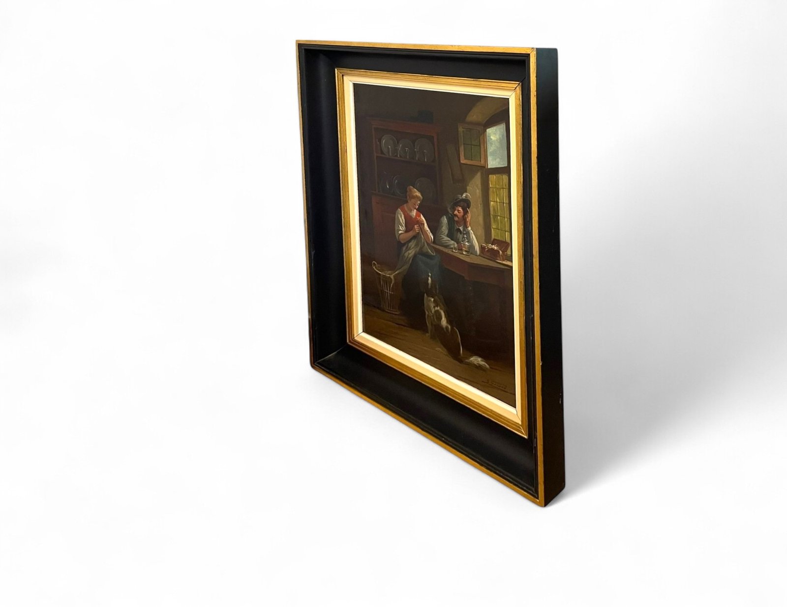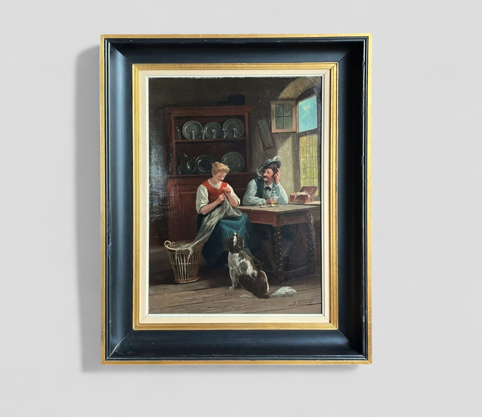 This late 19th-century, beginning 20th painting is an original oil on canvas, capturing a snapshot of a family scene in a rural interior, likely German, Swiss, or Austrian. It depicts a woman mending clothes after washing, a man chatting with his wife while enjoying a pipe and a drink, and a dog also seeking some attention. The painting is in good condition without any damage. It was completely cleaned, re-varnished, and re-stretched on a new stretcher, as you can see. All colors in this artwork are subjective and may vary on your monitor. The artist signs it in the lower right-hand corner. It comes in a beautiful wooden frame.