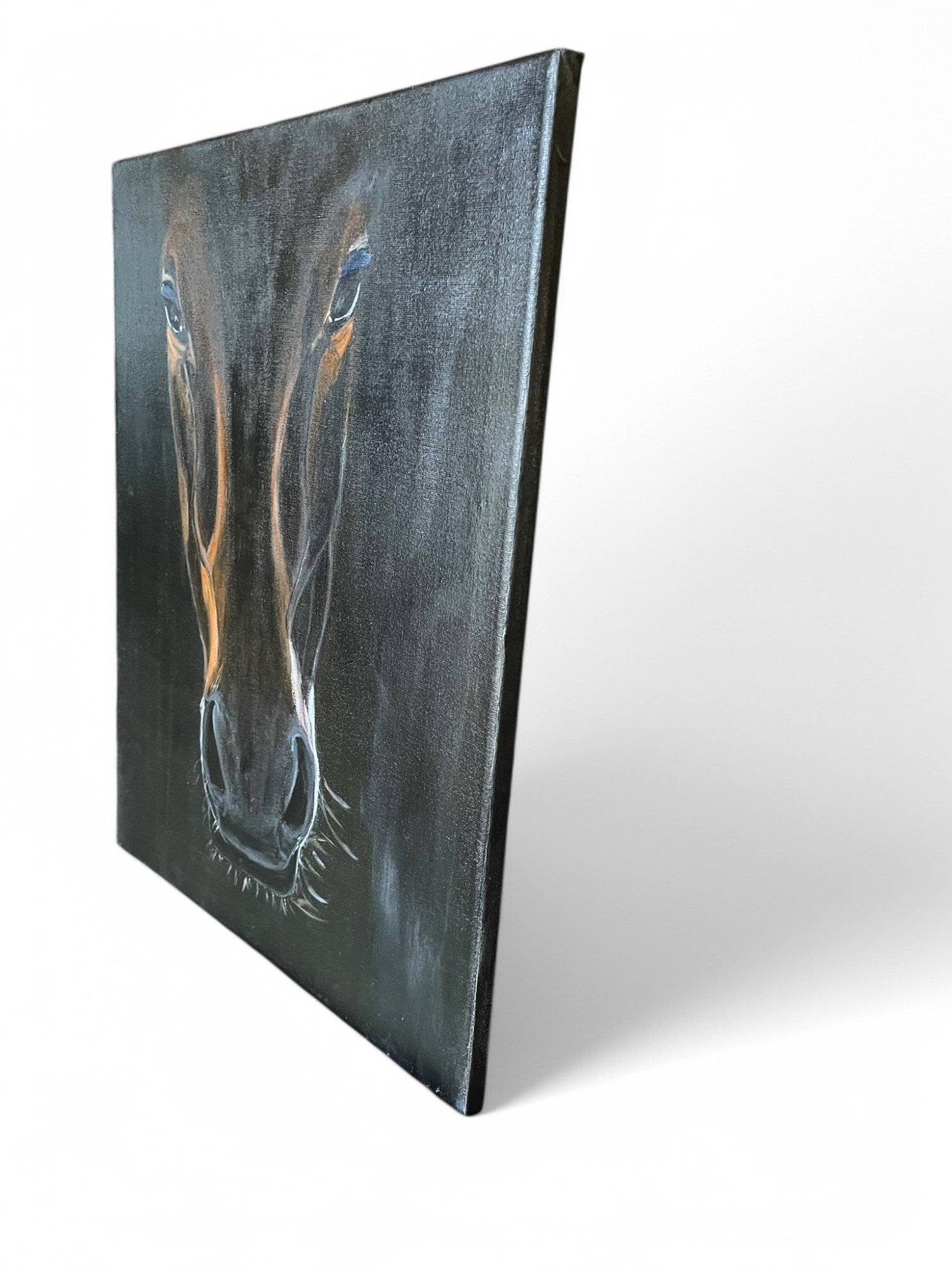A vintage painting of a front-facing horse head from the 90s, beautifully painted and very decorative.