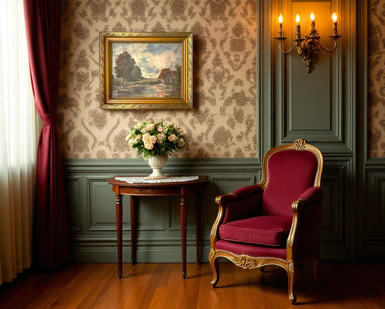 An original oil painting on canvas. A beautiful decorative view of a river with a water mill. Due to age the paint has some craquelure and looks a bit sloppy. Notwithstanding, it is still in relatively good condition and comes with the original frame. The painting is as you can see in the attached photos.