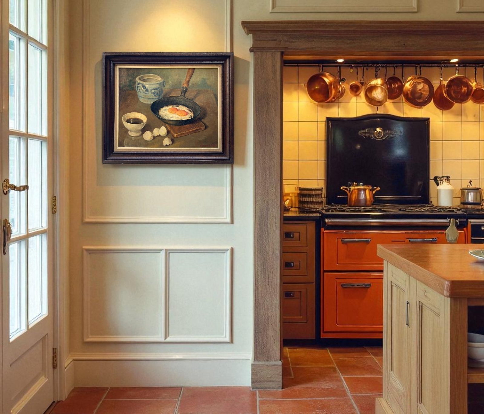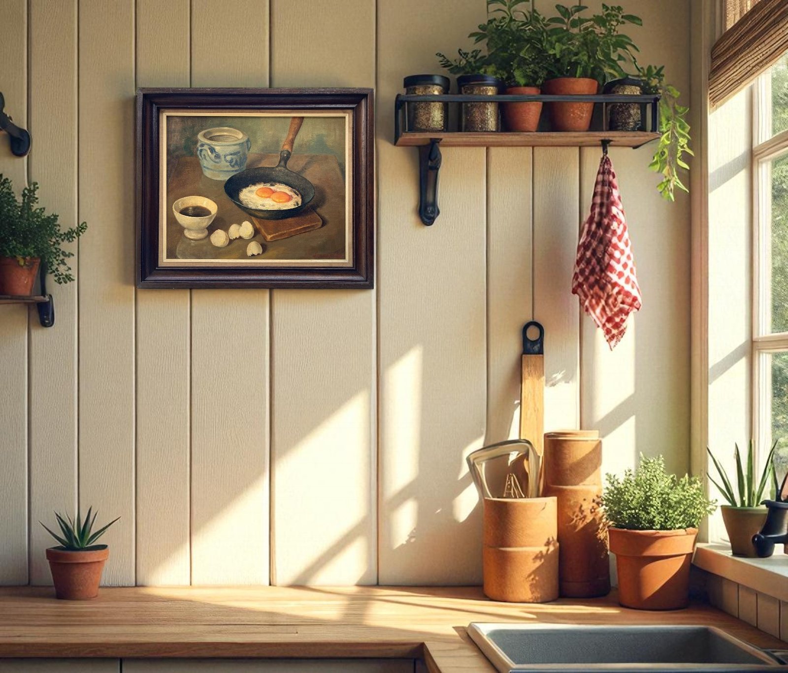 This painting is an original oil on canvas, mounted on a panel. A typical still life from the kitchen world. Something truly perfect to hang in your kitchen. The painting was created around the 1950s. All colors in this artwork are subjective and may vary on your monitor. It is signed by the artist in the lower right corner. The painting is in good condition. It comes in a beautiful wooden frame.