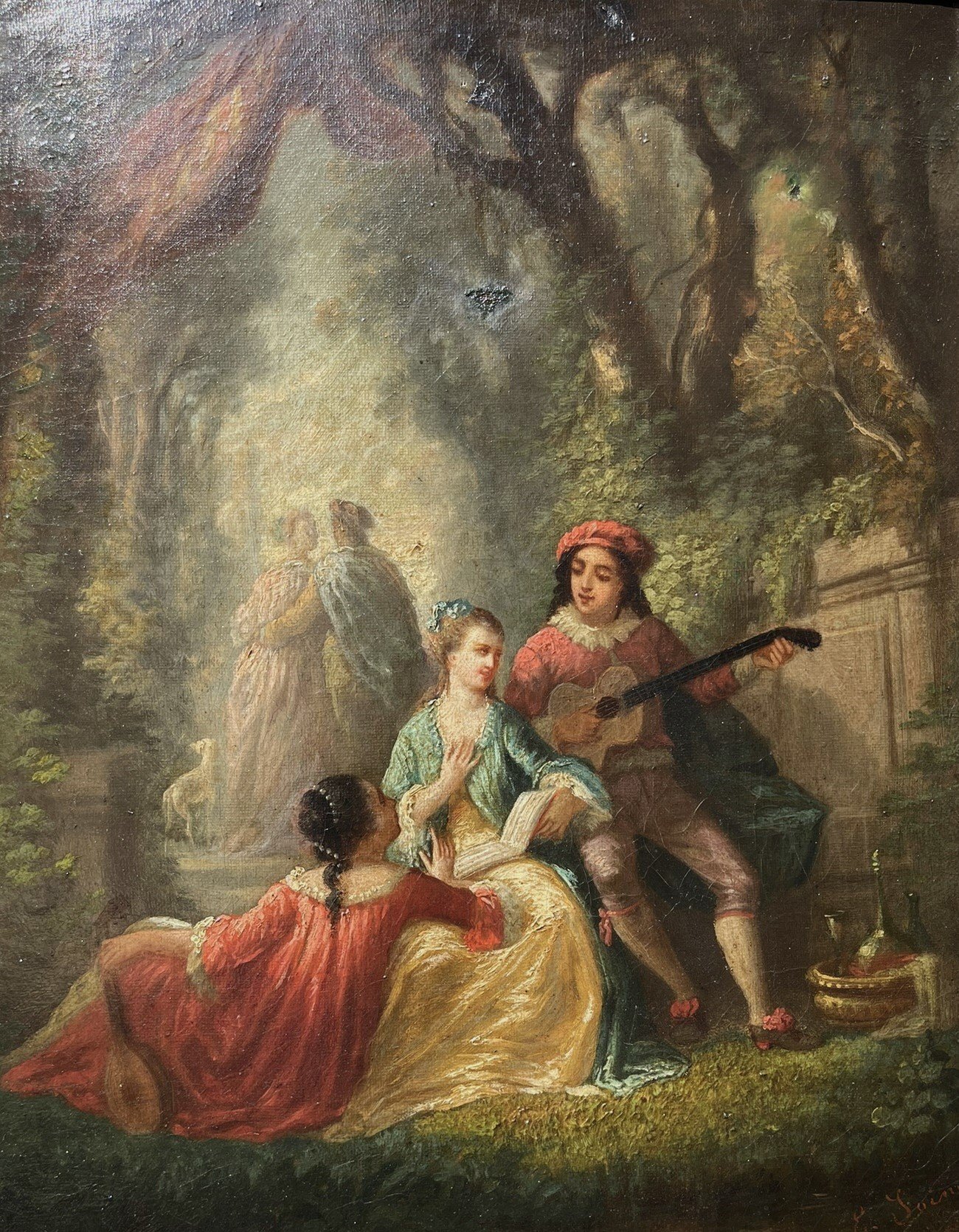 This elegant oil painting by the listed French artist Eliza Joinville (XIX) depicts a charming romantic scene in Rococo style, set in a lush, wooded garden. Central to the composition is a gentleman in historical costume serenading two ladies with a lute or guitar. The ladies, dressed in sumptuous 18th-century attire, appear amused and engaged—the first sitting on the grass in a red and gold dress, and the second on a stone bench beside the musician, leaning gently toward him.