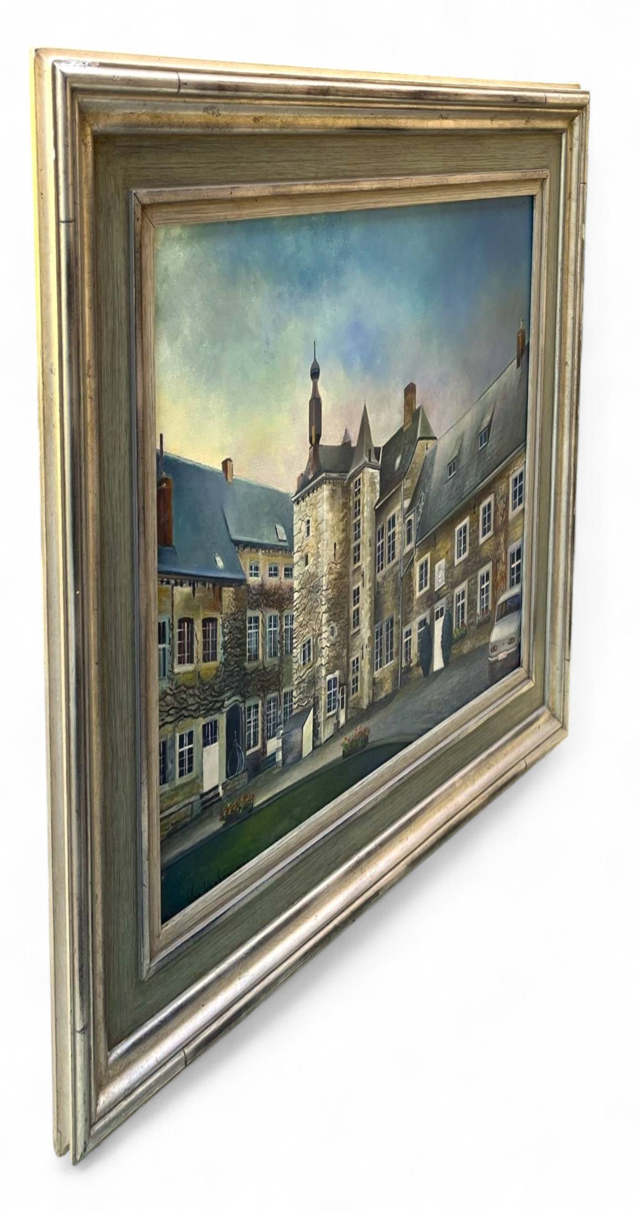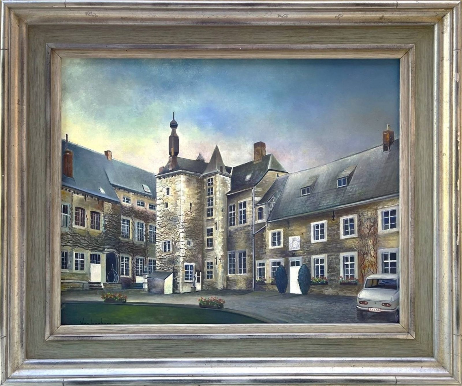 It depicts a historic castle surrounded by an inner courtyard where a classic car, a Peugeot 205, happens to be parked. It is an oil painting with soft pastel shades and an ornate frame. The artwork is characterized by an atmospheric representation, with a strong emphasis on the building's architecture. The details of the building and the artistic style contribute to the overall aesthetic of the artwork.