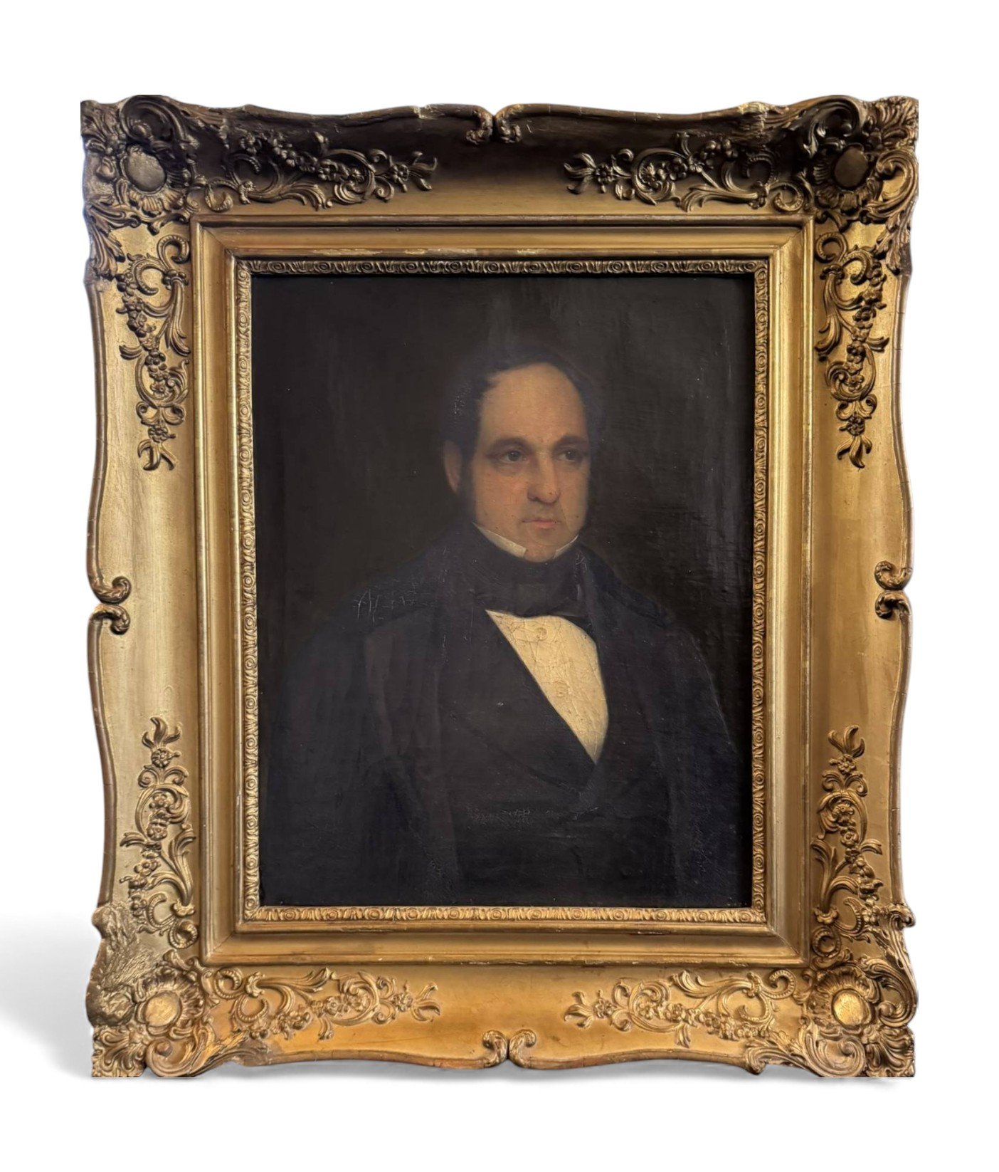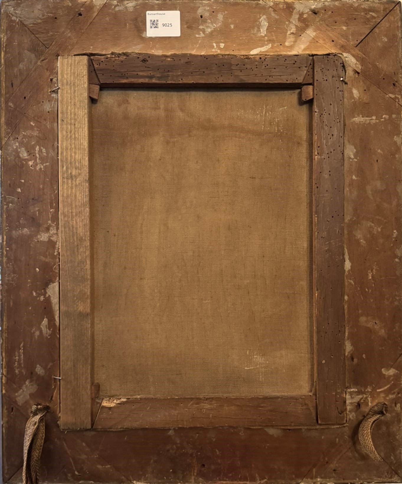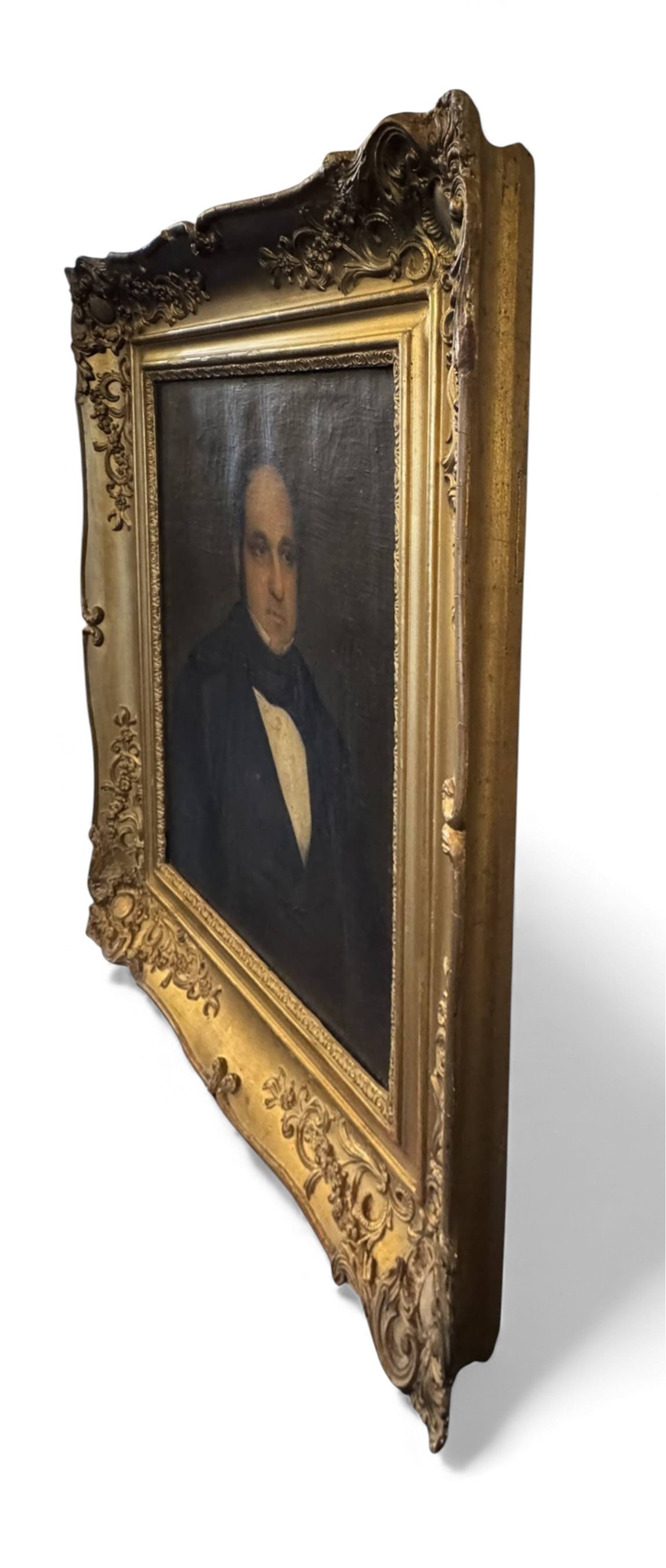 The painting is in good condition considering its age (mid-19th century). An old restoration was previously performed on the canvas on the man's hair; however, when the painting is hung, this restoration is barely visible. There is some craquelure present here and there, which is consistent with the age of the piece. The frame has undergone small repairs in the past but remains in good appearance and presents very well.