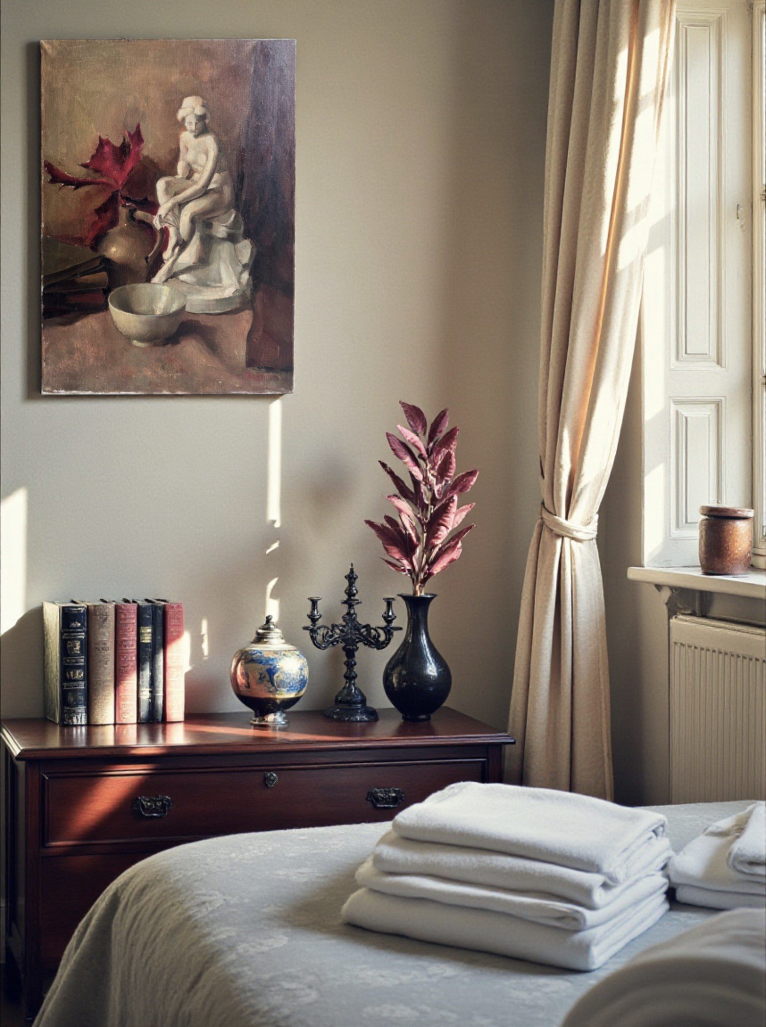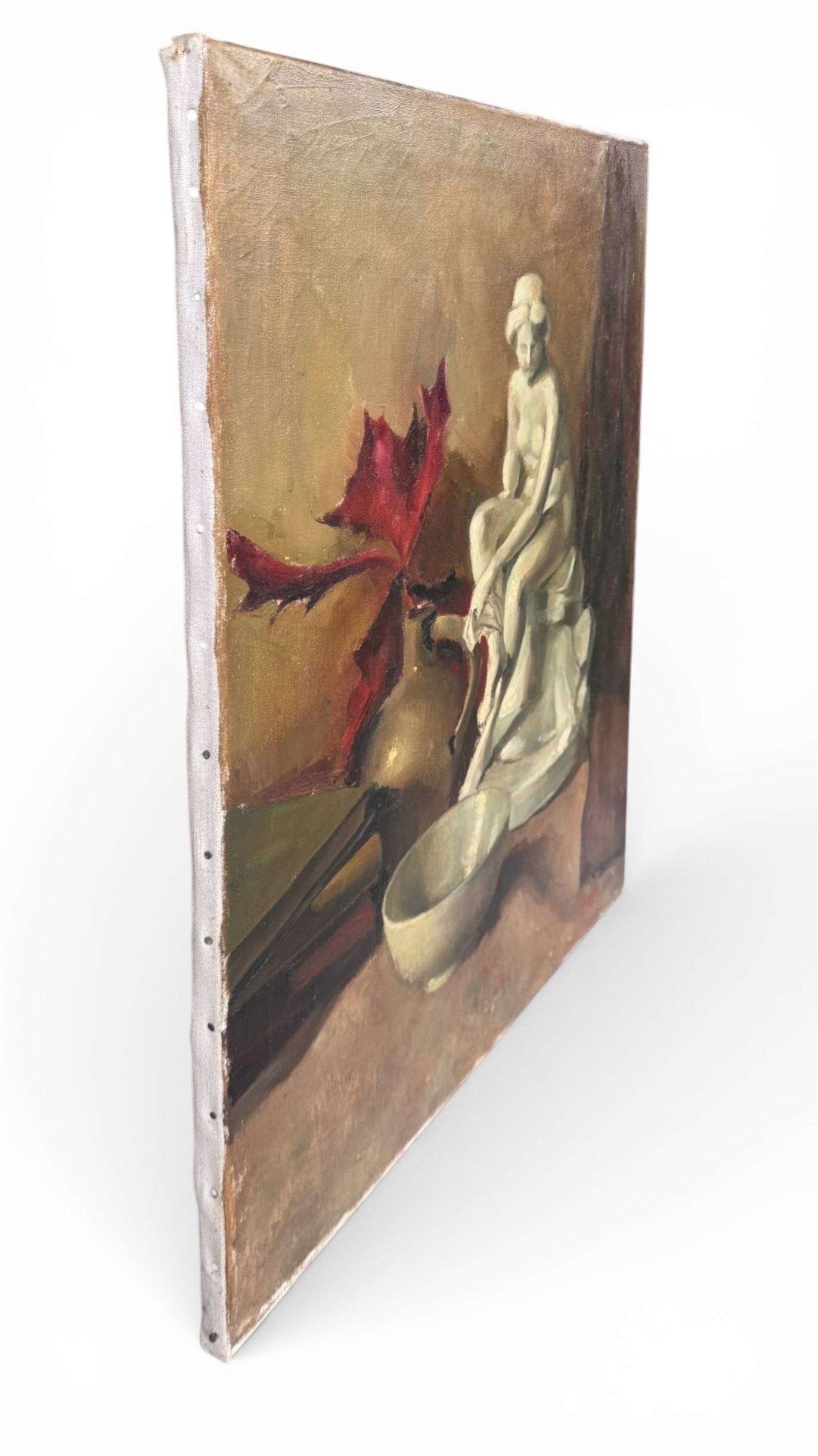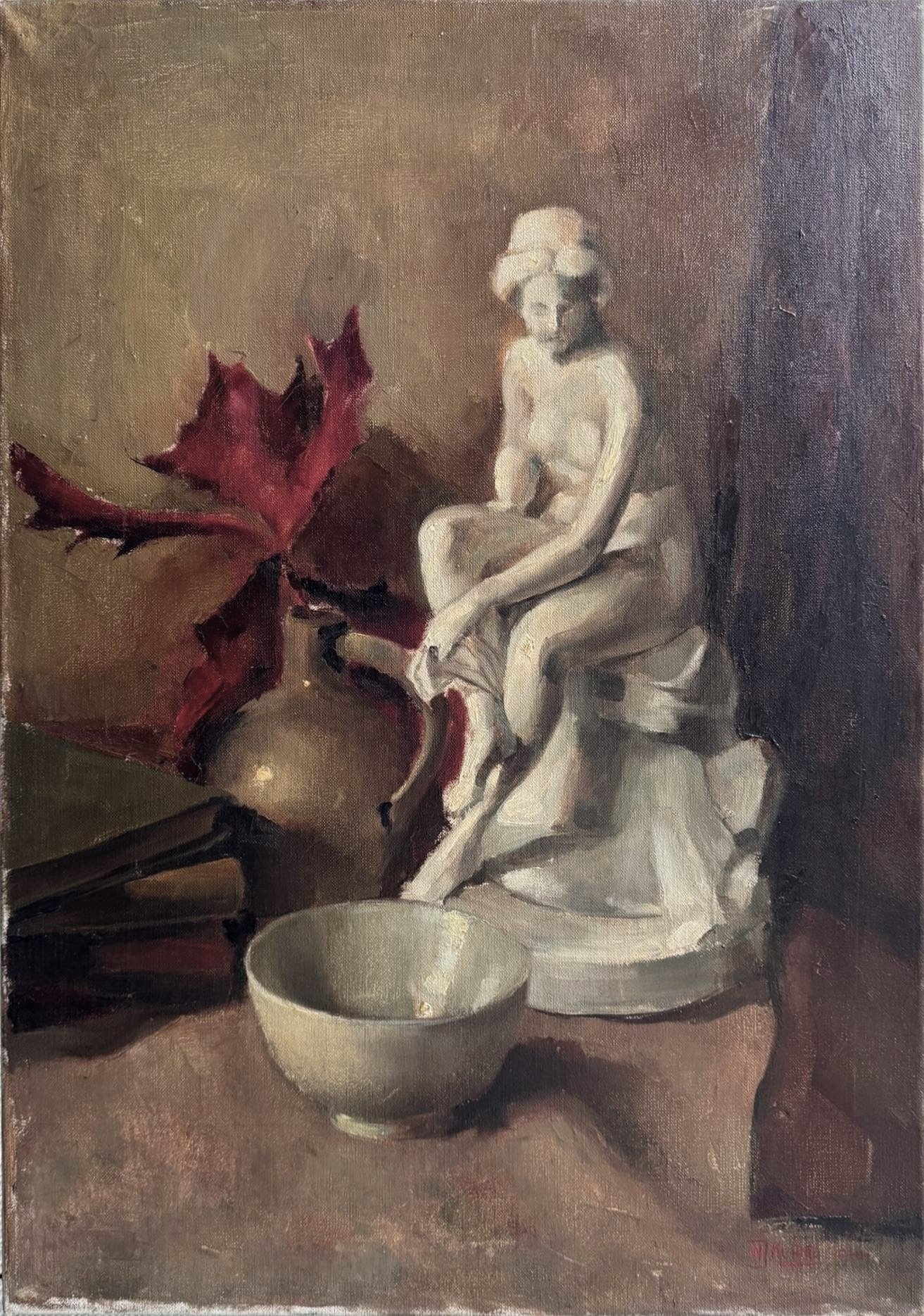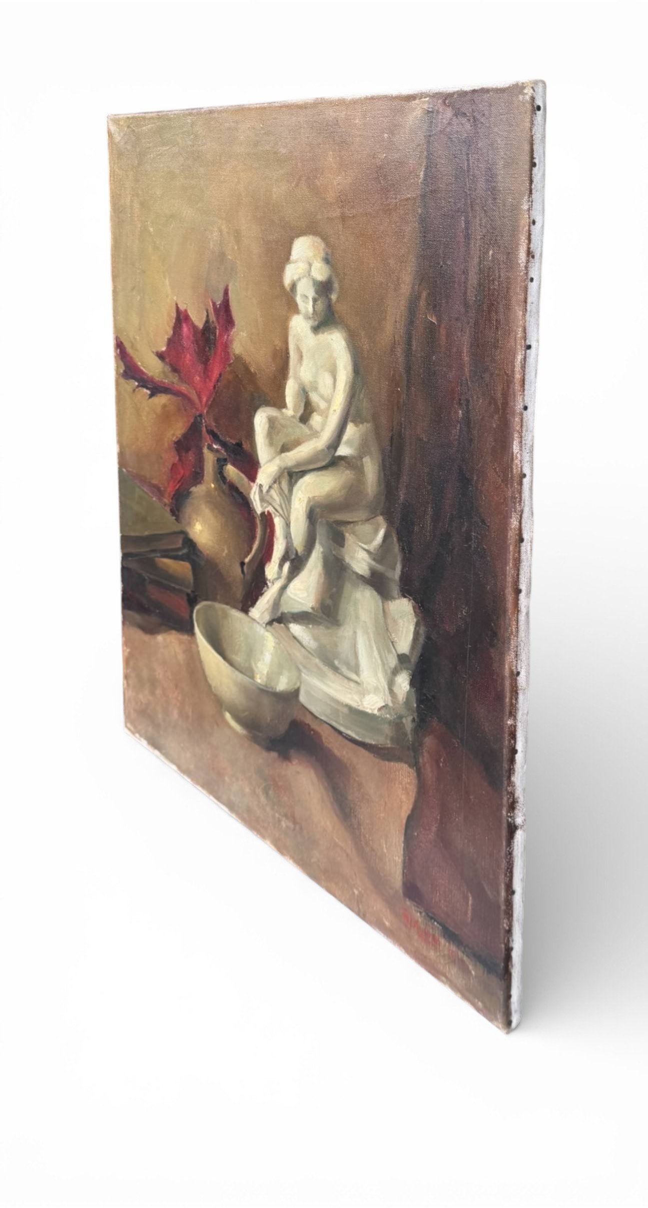 is an atmospheric mid-century still life that blends classical elegance with quiet introspection. This original oil on canvas depicts a serene classical figurine seated beside a simple bowl and books, set against a muted, painterly background with warm earthy tones and deep accents of red.