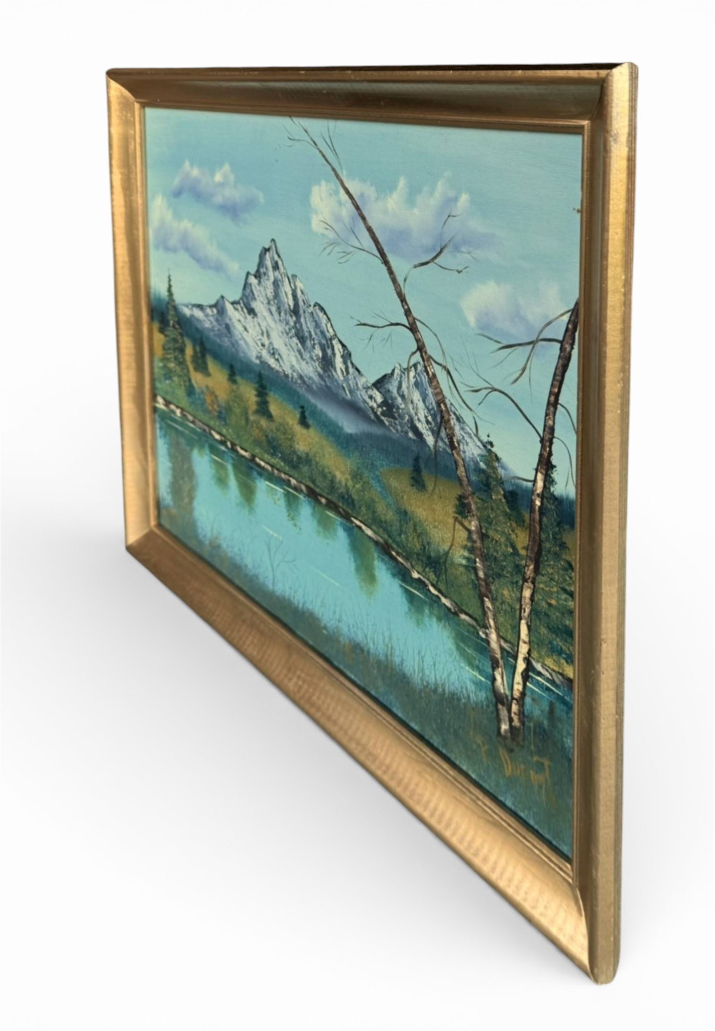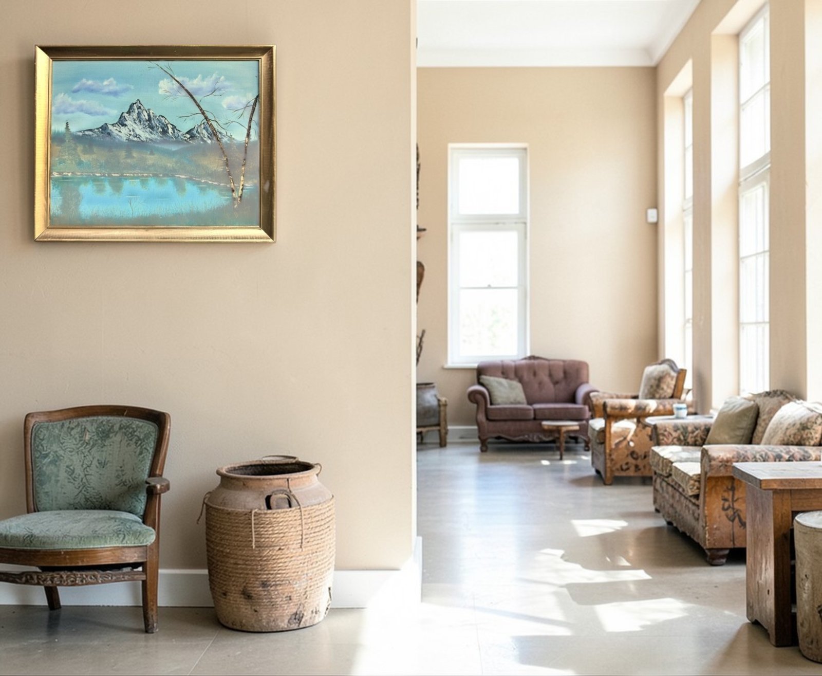 This beautiful vintage landscape painting from the 1970s captures a tranquil mountain scene with snow-covered peaks rising above a calm lake. Soft clouds drift across the sky while evergreen trees and meadow grasses frame the water, creating a peaceful and atmospheric composition.
