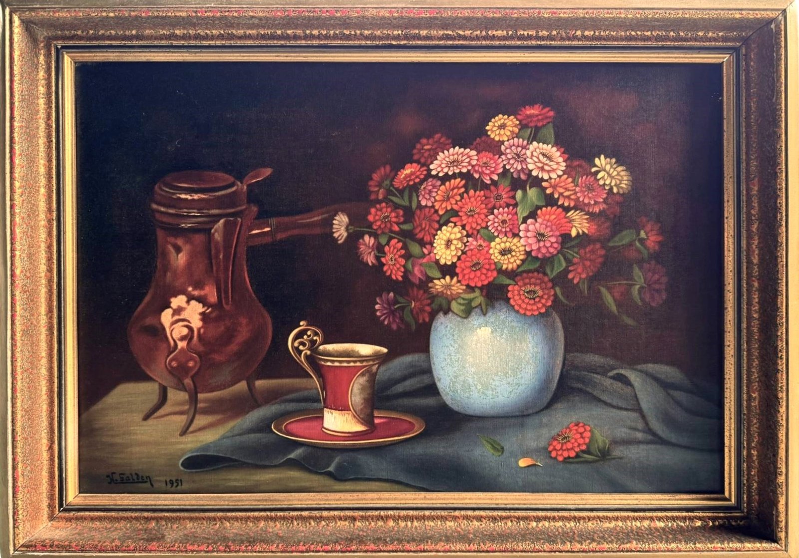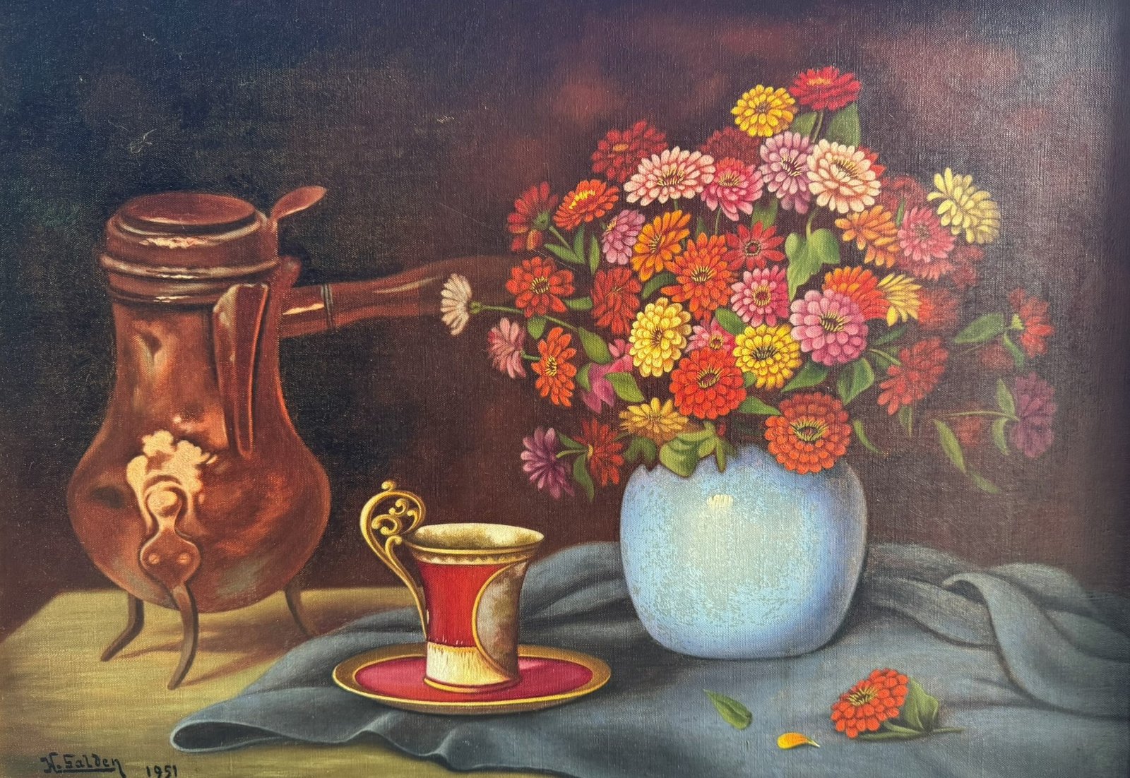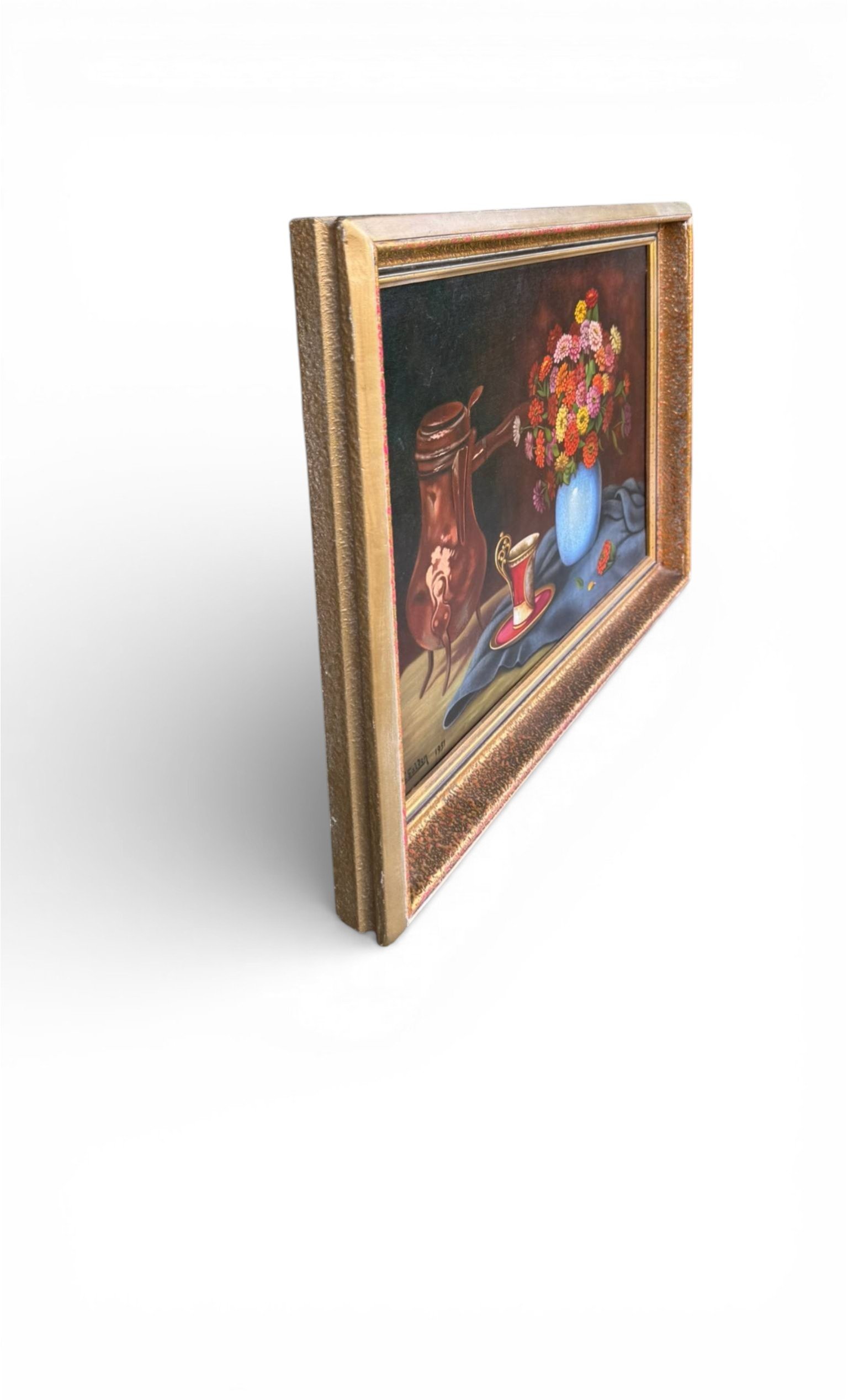 This charming mid-century still life painting from 1951 captures a warm and inviting scene: a vibrant bouquet of flowers arranged in a vase beside an elegant cup and a copper jug. The composition combines rich colors, soft lighting, and classic still-life balance, creating a timeless decorative piece perfect for traditional, vintage, or eclectic interiors.