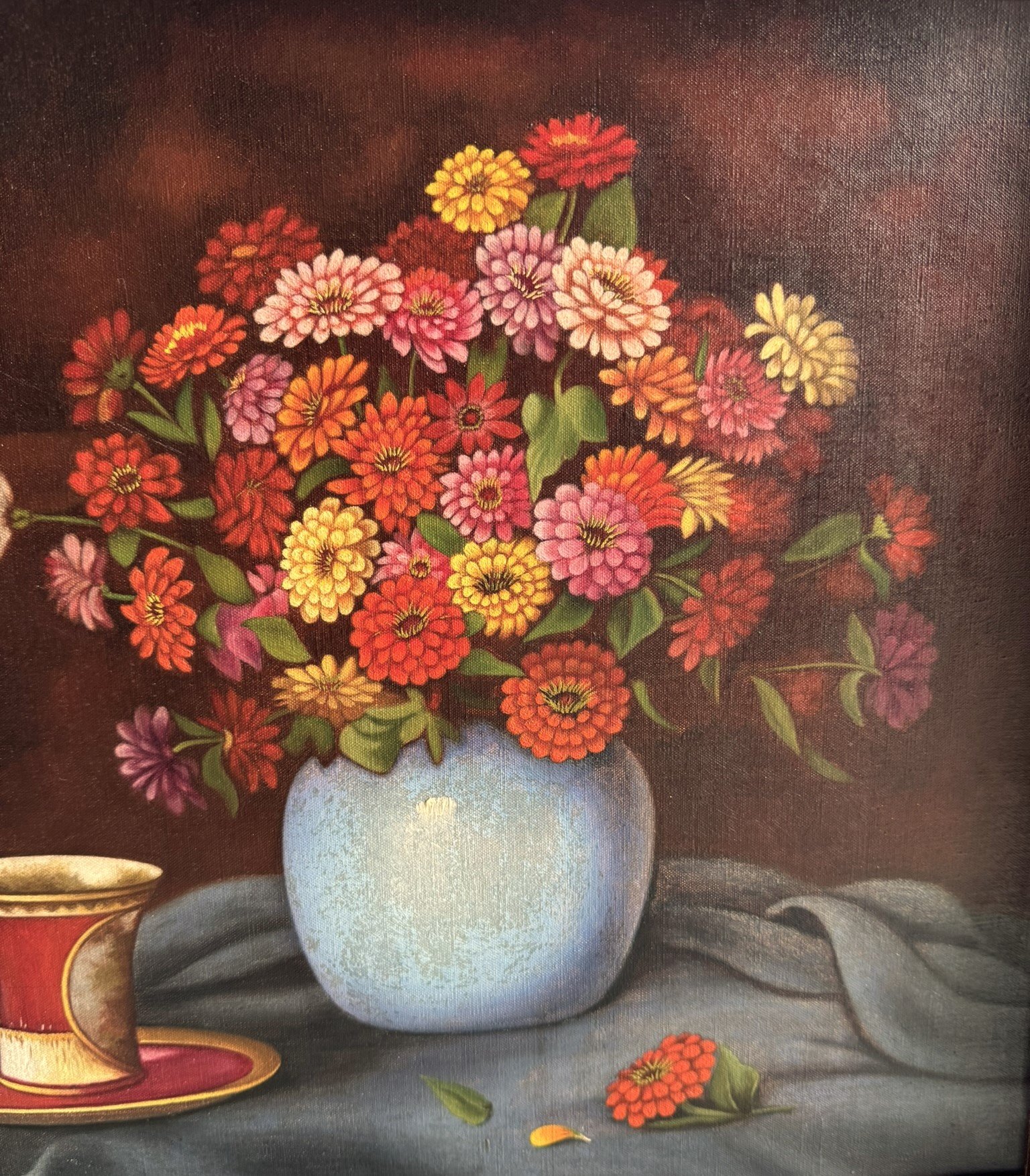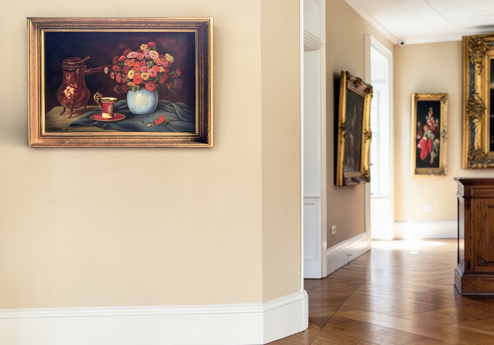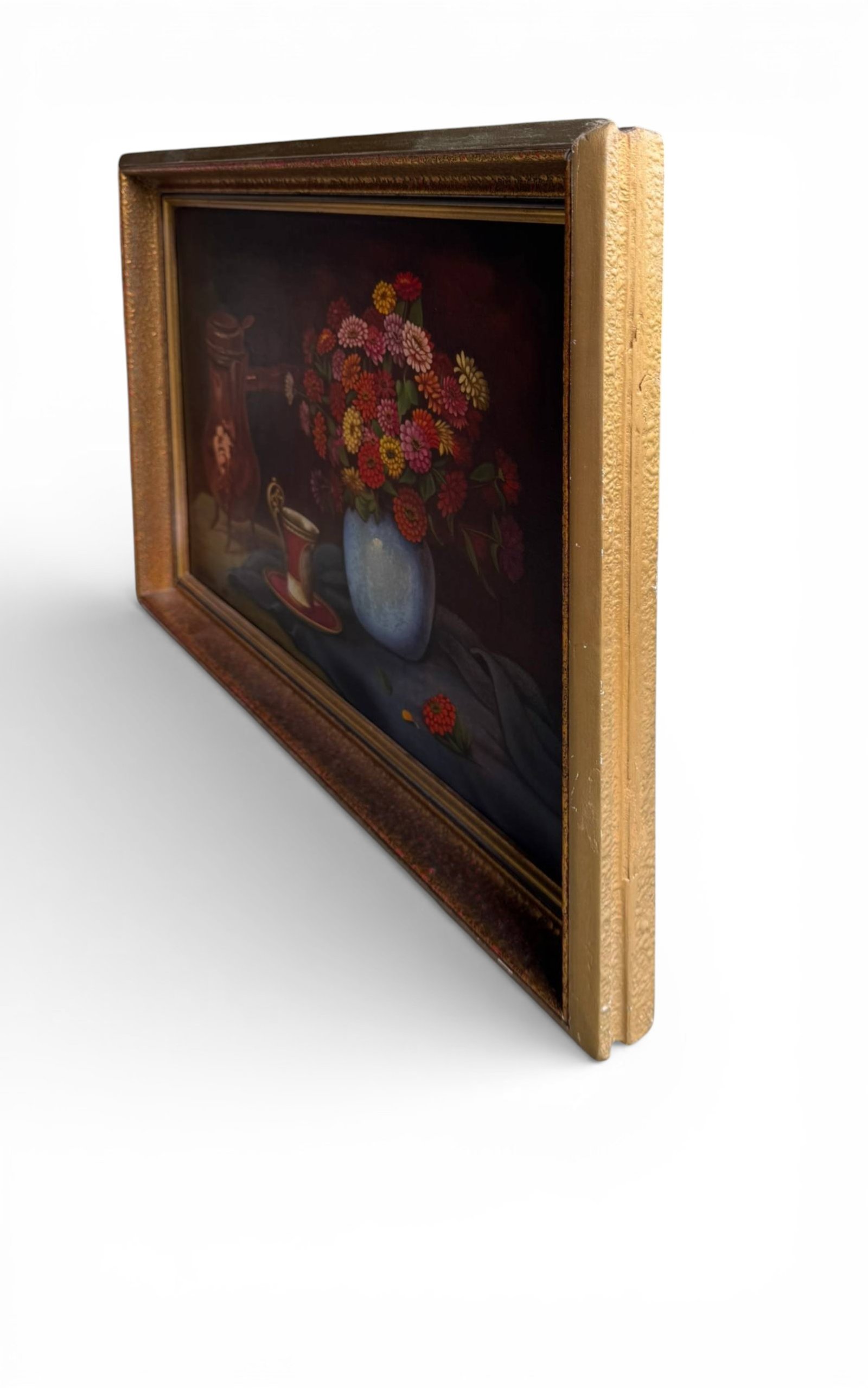 This charming mid-century still life painting from 1951 captures a warm and inviting scene: a vibrant bouquet of flowers arranged in a vase beside an elegant cup and a copper jug. The composition combines rich colors, soft lighting, and classic still-life balance, creating a timeless decorative piece perfect for traditional, vintage, or eclectic interiors.