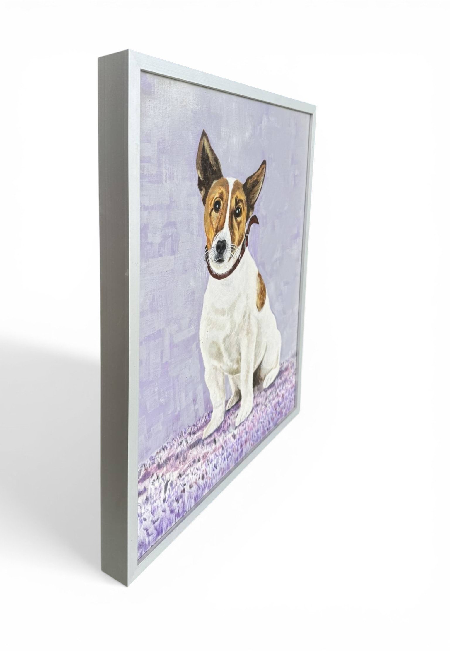Vintage painting a Jack Russell Terrier signed and dated 2001. It’s an oil on canvas laid down on board. The soft lavender background beautifully contrasts with the dog’s white and brown coat, creating a calm yet eye-catching composition that fits effortlessly into both modern and traditional interiors.
