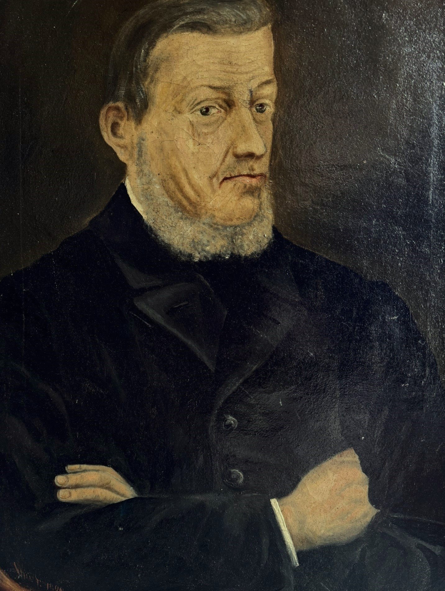 This striking 19th-century antique portrait depicts a dignified noble gentleman with a composed, introspective expression. The subject is portrayed in a half-length pose with crossed arms, wearing dark formal attire typical of the period, which conveys authority, refinement, and character. The restrained color palette and detailed facial rendering reflect the craftsmanship and elegance of traditional European portrait painting.