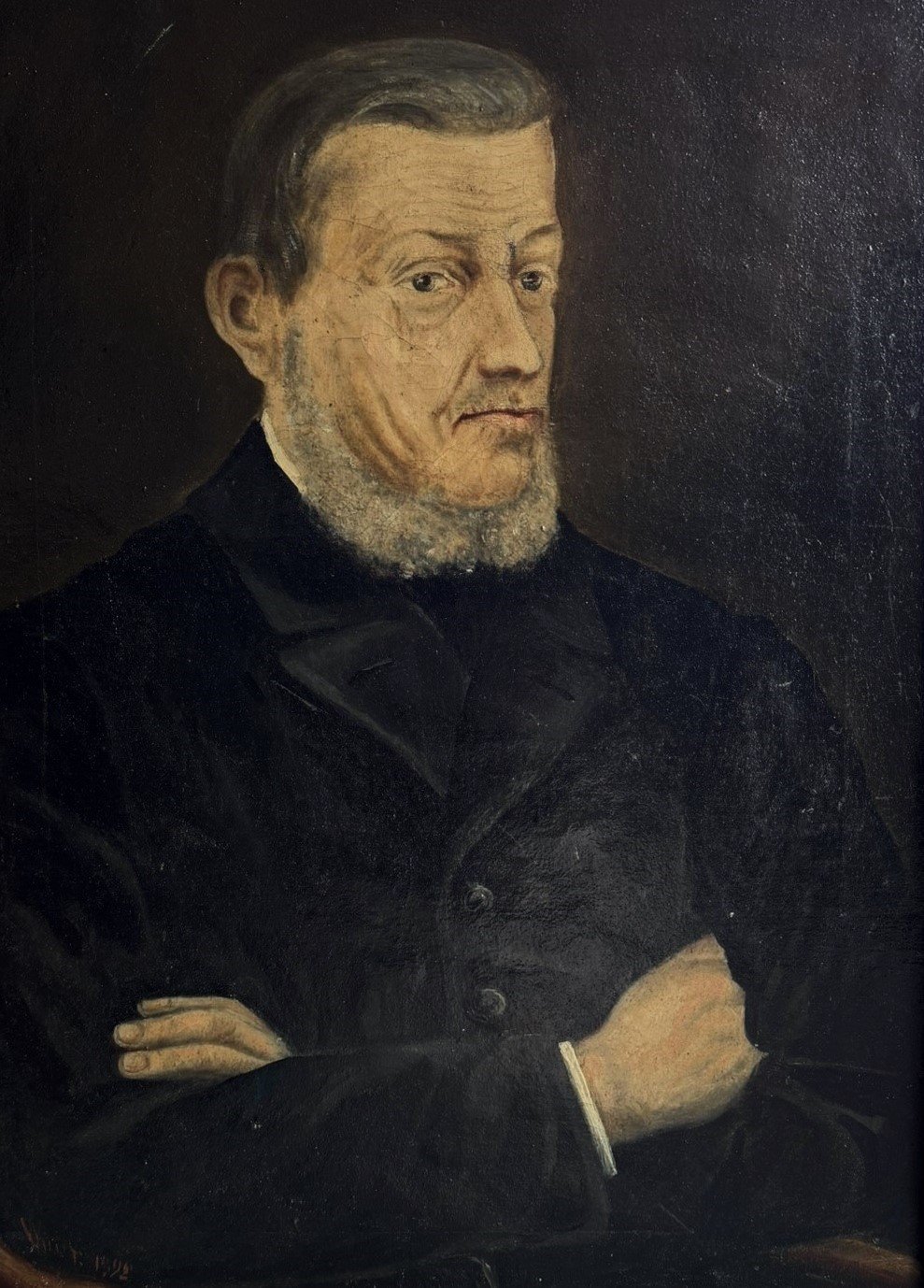 The painting is signed and dates from 1892; the signature is unfortunately illegible, making it an authentic antique artwork with historical presence. It is a timeless piece that would complement both classic and eclectic interiors, ideal for collectors of antique art, historic portraits, or European fine art.