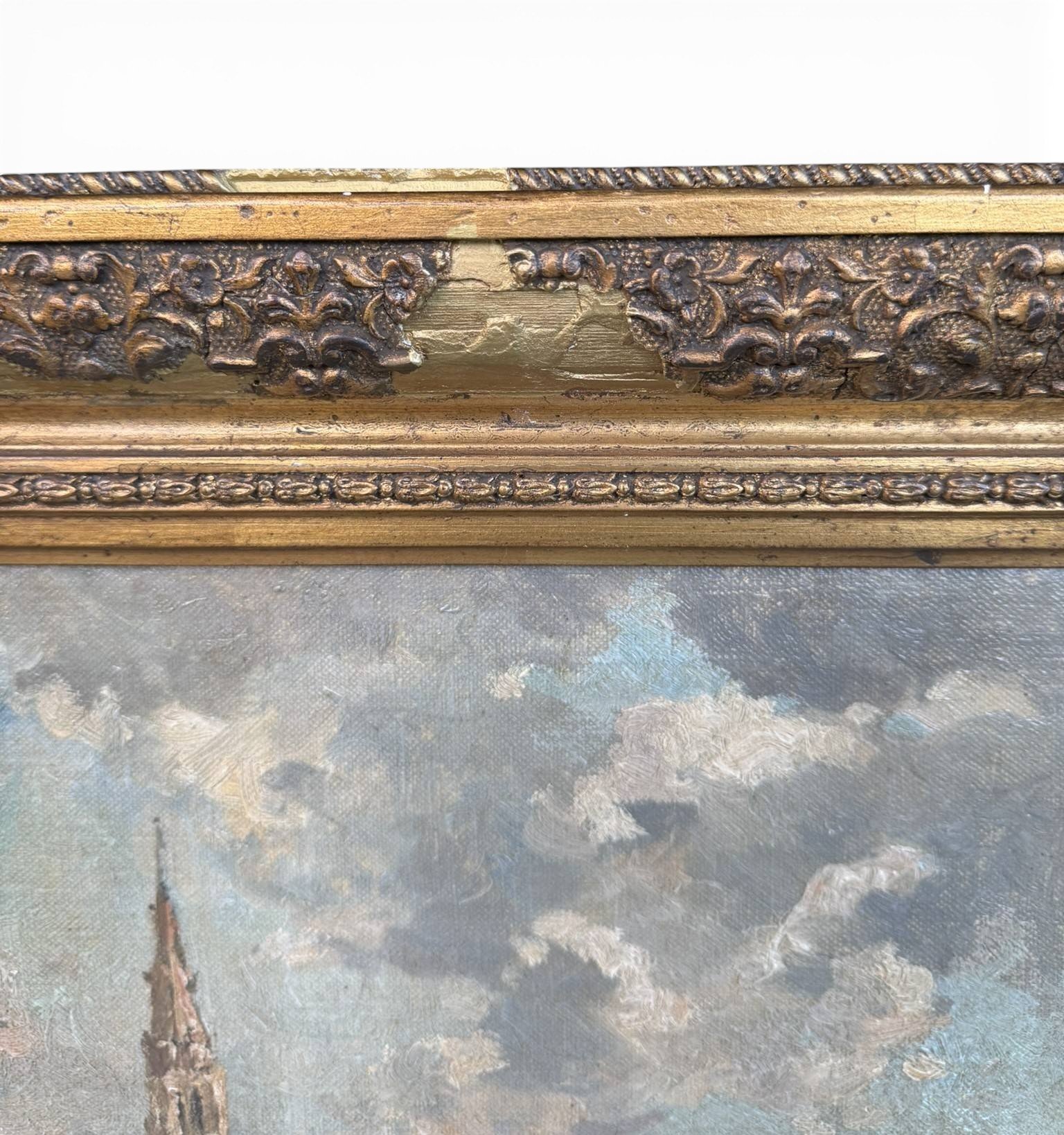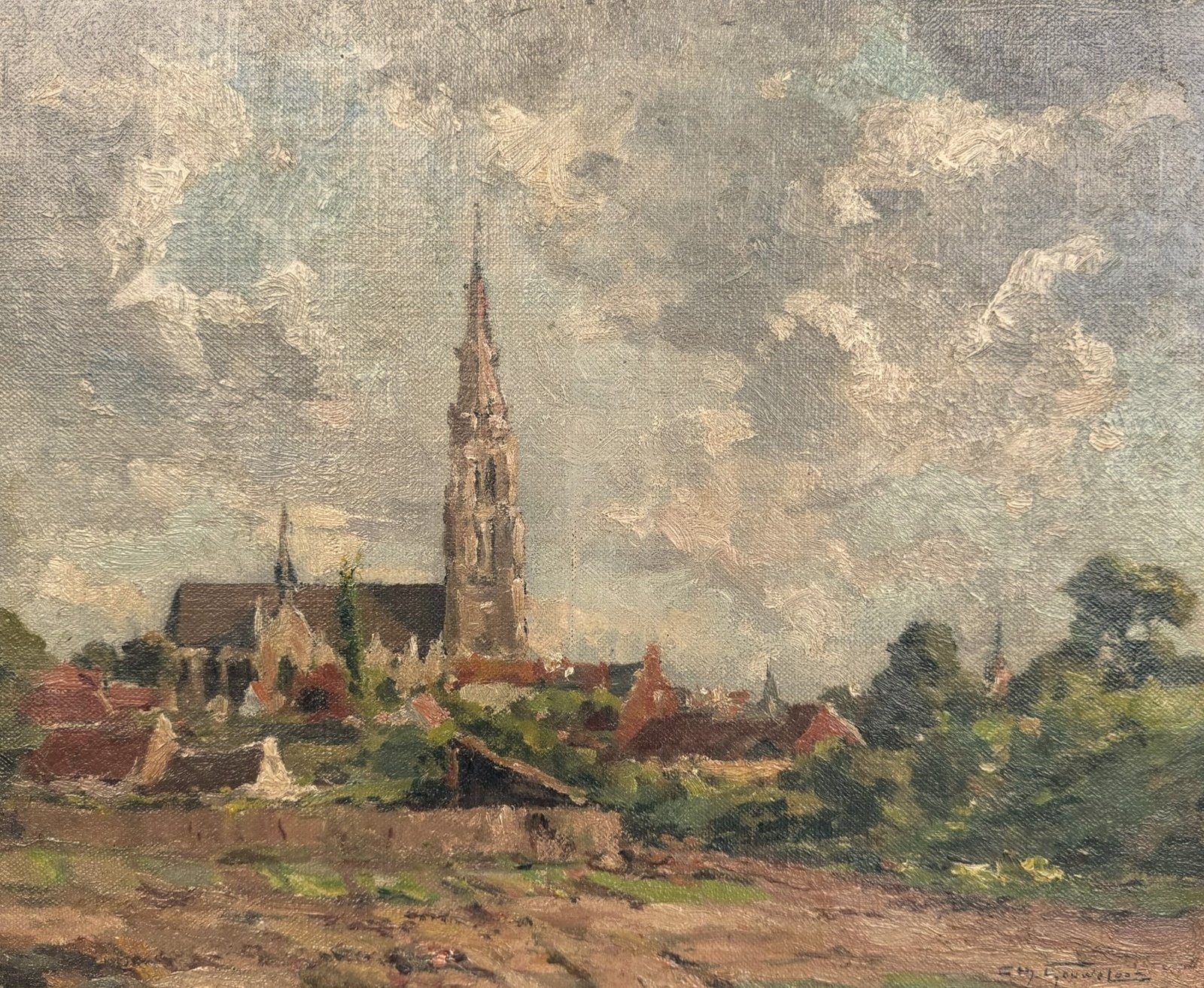 This beautiful original oil painting presents a serene European townscape dominated by a striking church tower rising above a rural landscape. Painted with expressive brushwork and a refined color palette, the artwork captures the tranquil atmosphere of early 20th-century Europe.