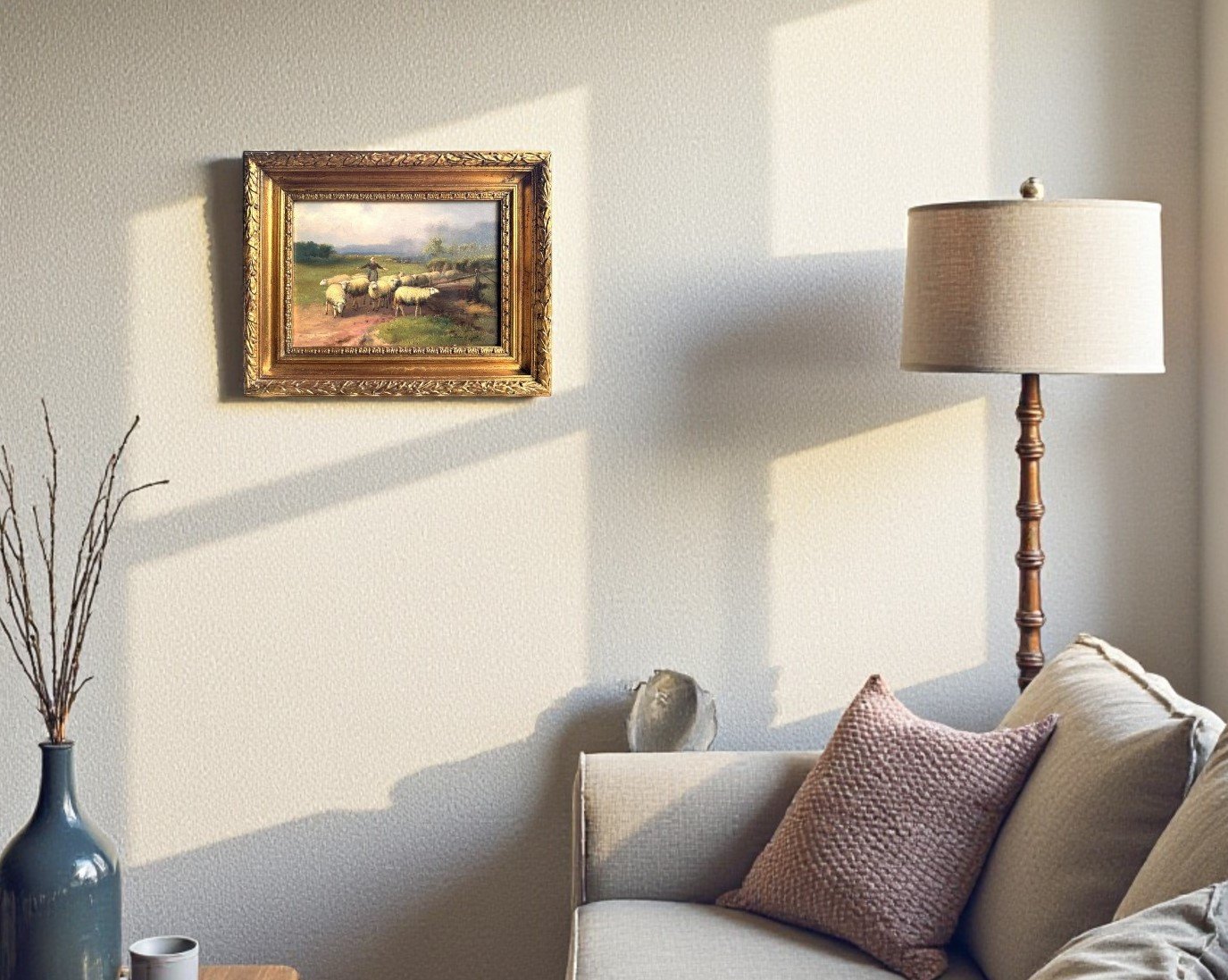 Step into a tranquil pastoral scene with this charming vintage oil painting, perfect for adding a touch of classic European rustic elegance to your home or gallery wall. This piece captures a shepherd guiding a flock of sheep along a country path, beautifully rendered with a soft, naturalistic palette. The composition evokes a sense of timeless rural life and calm.