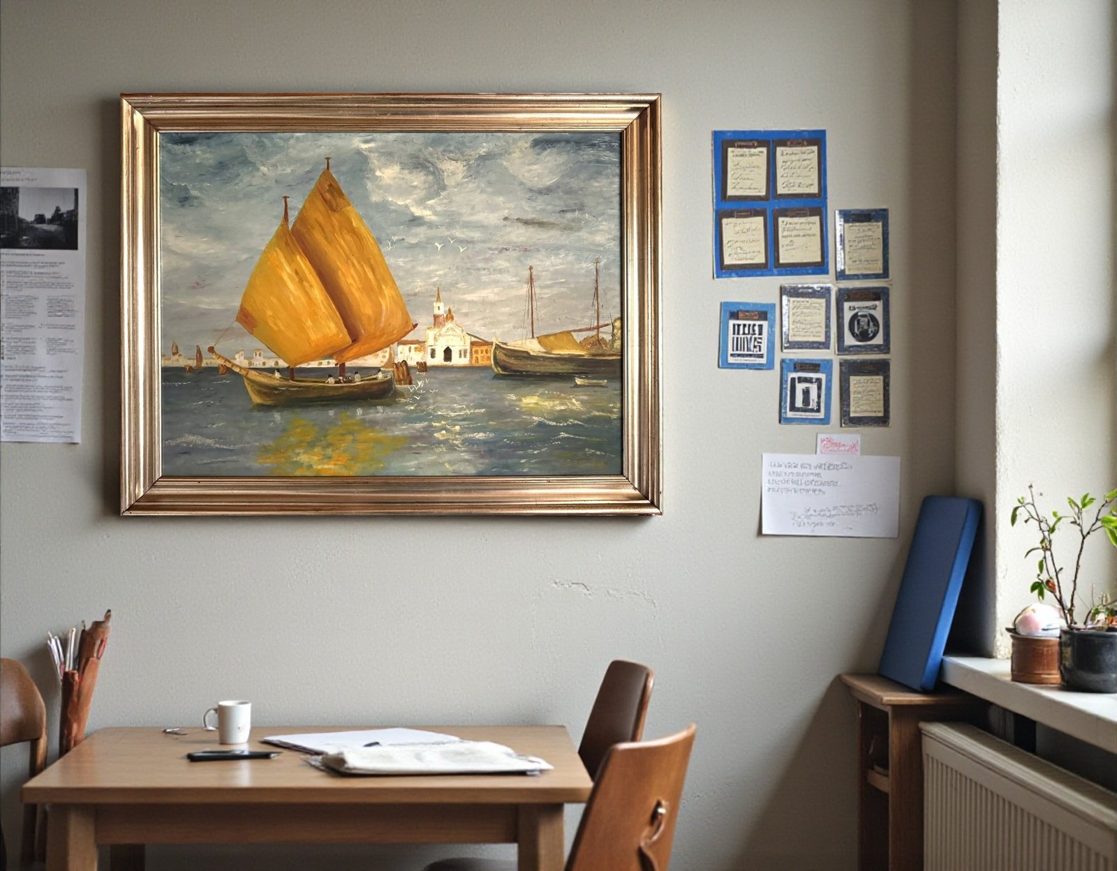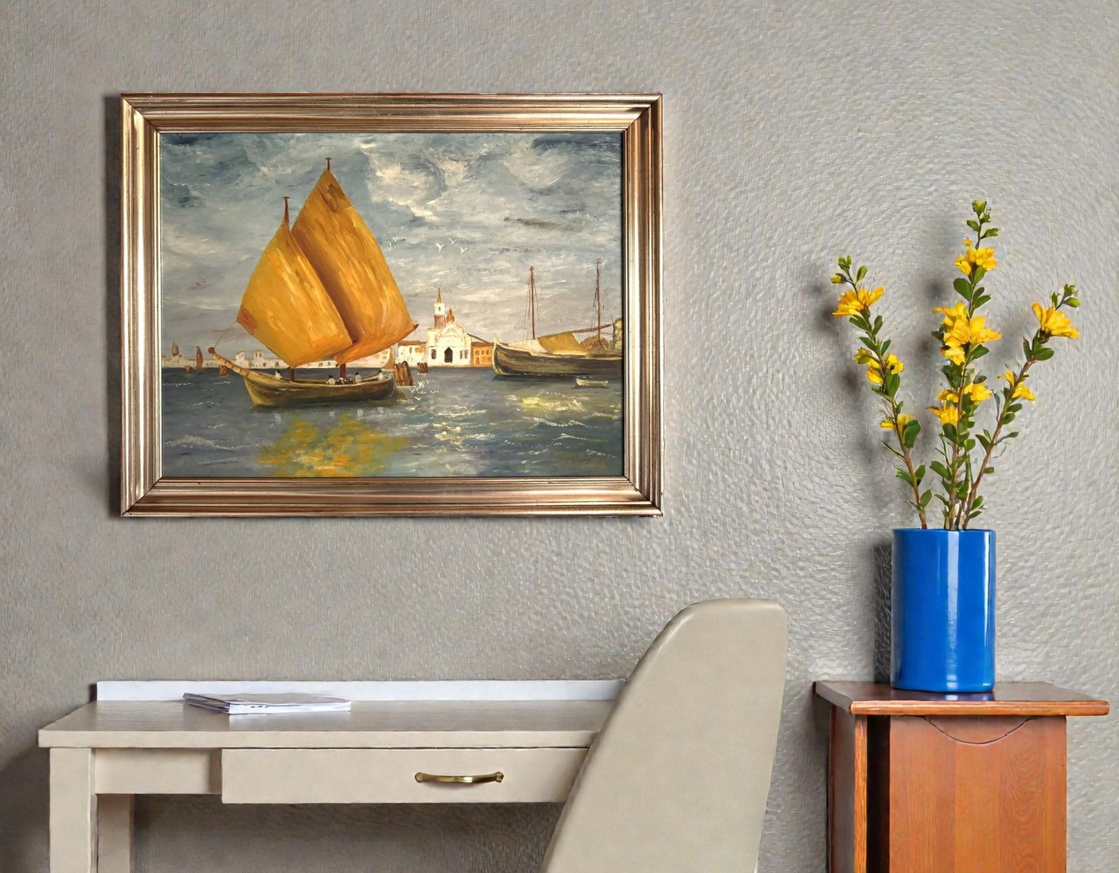 This beautiful, large-framed oil painting depicts a classic Venetian marina scene with sailing boats, inspired by traditional Italian maritime art. The painting based on the work of Gulielmo Ciardi (1842-1917) The Marina of San Giorgio Maggiore, an Island of Venice.