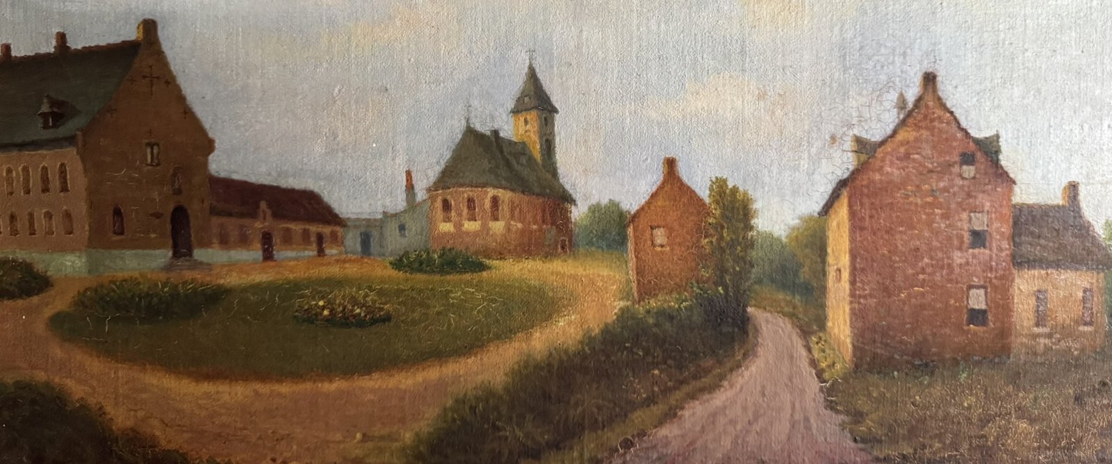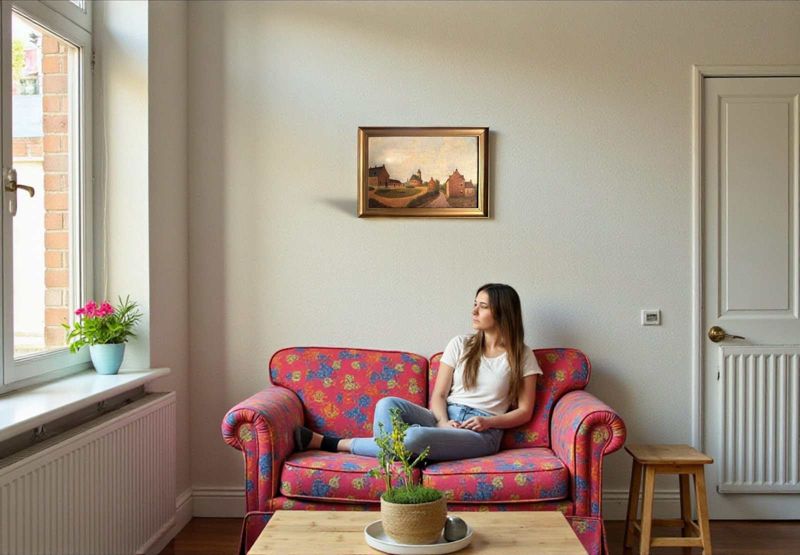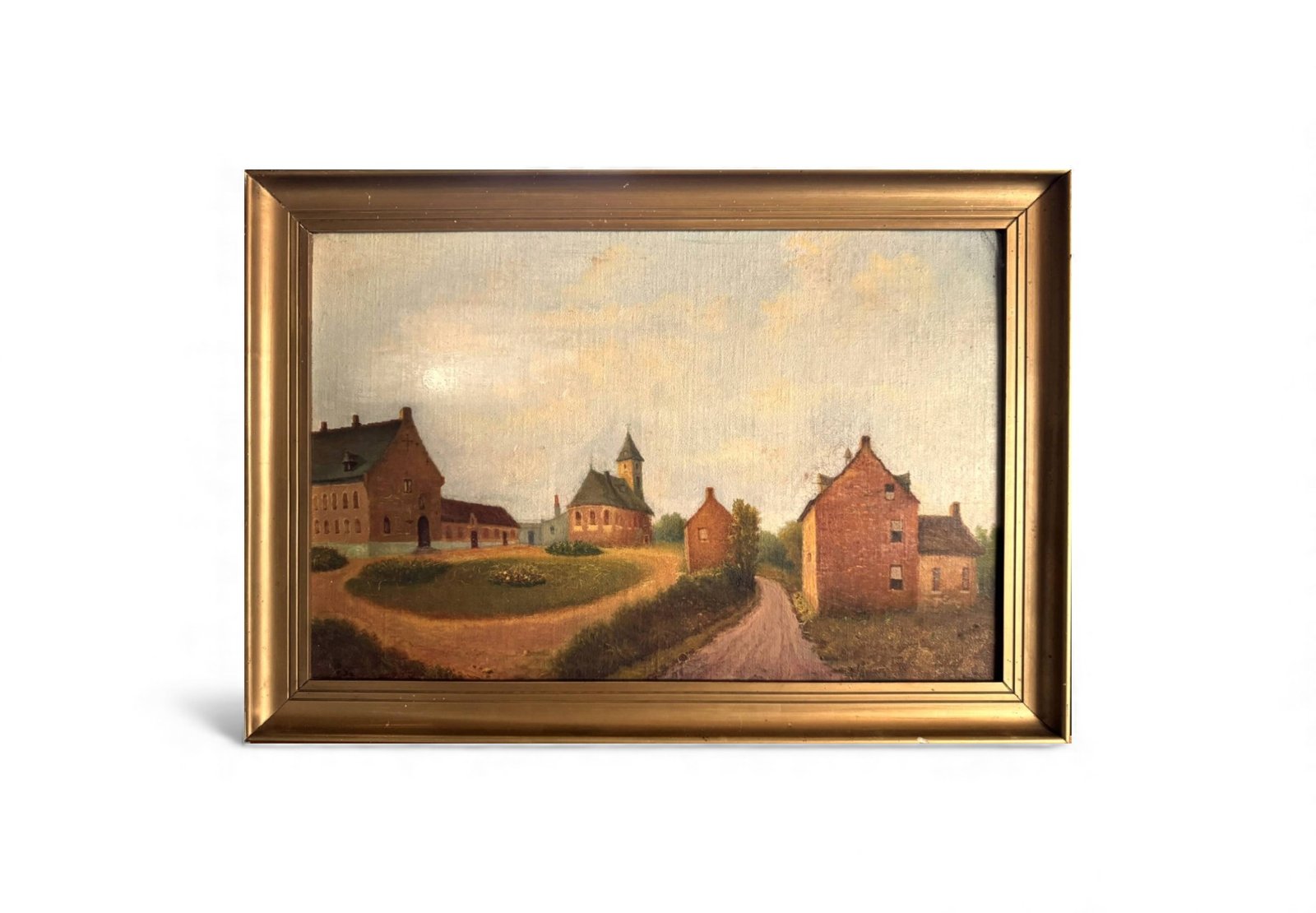 Step into the warmth and charm of early 20th-century European village life with this beautiful antique oil painting. Captures a serene rural scene featuring classic brick buildings, a winding path, and a soft, peaceful sky. The gentle colors and subtle texture give this artwork a wonderfully nostalgic atmosphere that feels both historic and inviting.