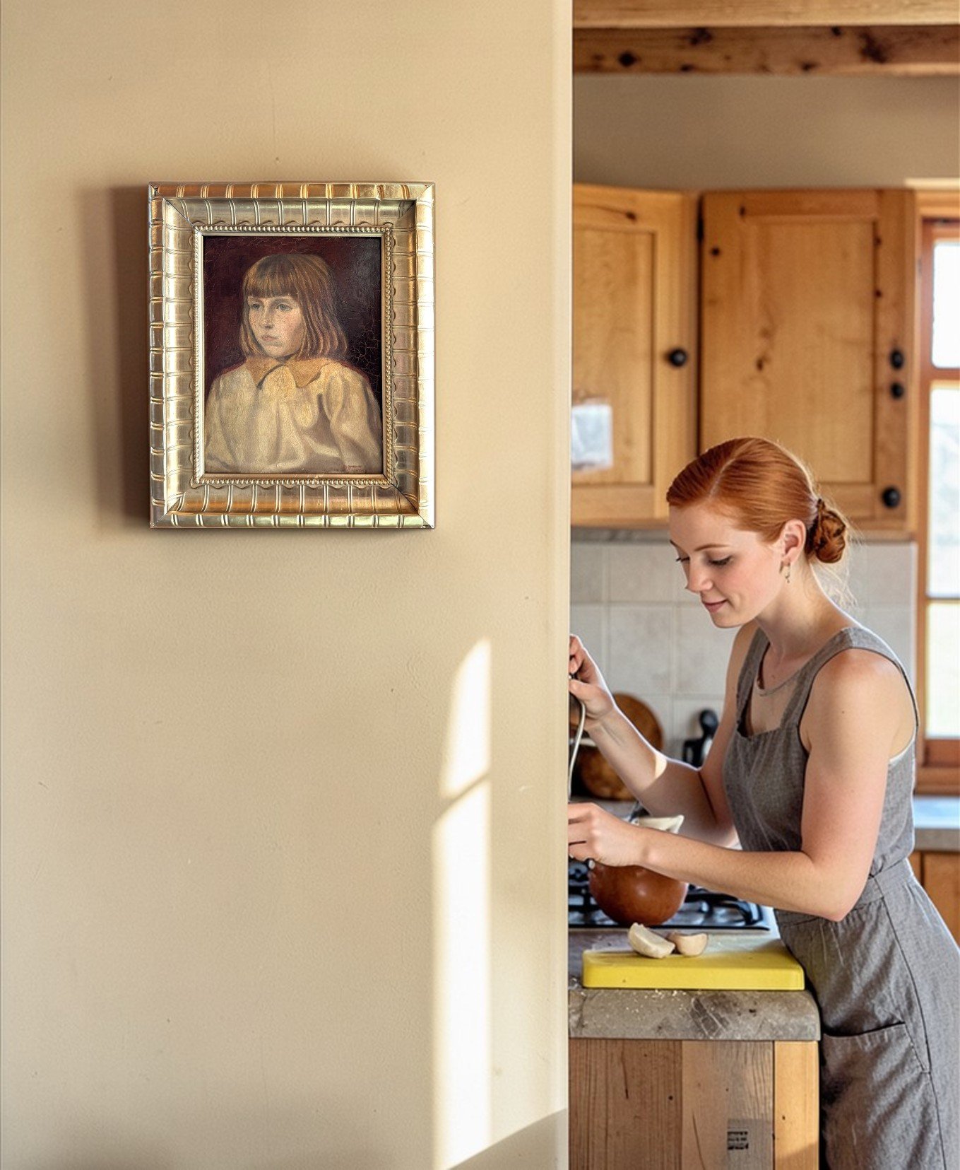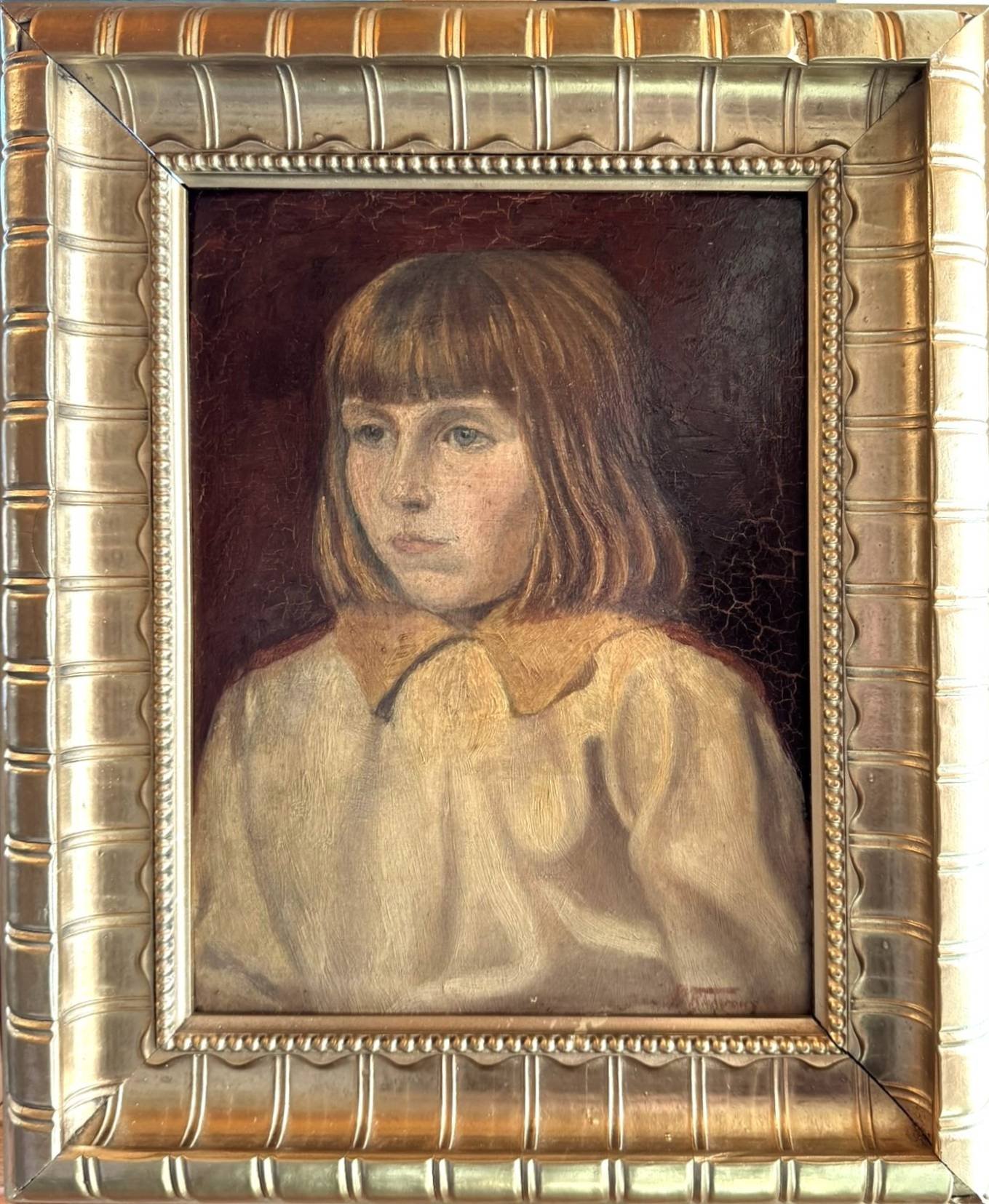 The portrait reflects the softness and intimacy characteristic of Victorian-era portraiture. The warm, muted background contrasts gently with the delicate facial features and natural tones of the girl’s attire. The subtle brushwork and aged patina give the painting authentic antique charm that only time can create.