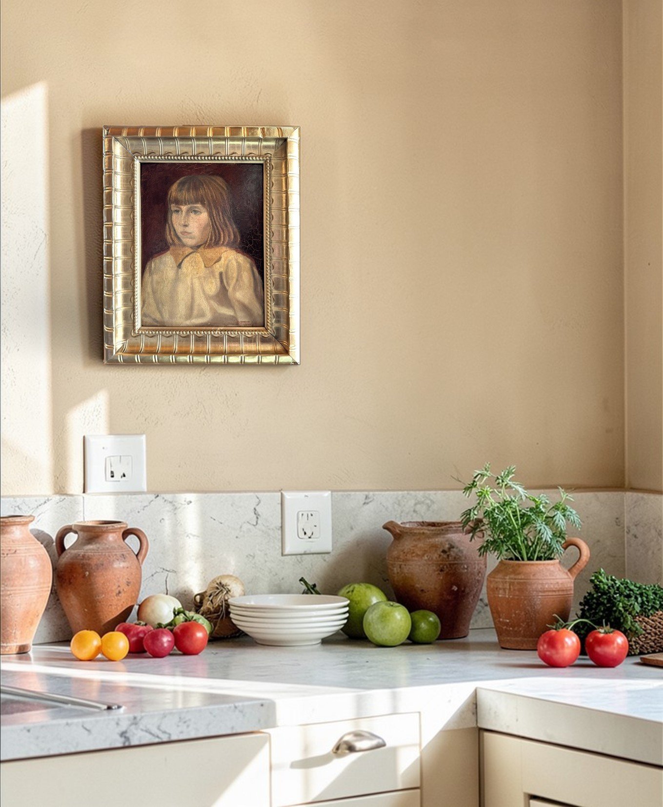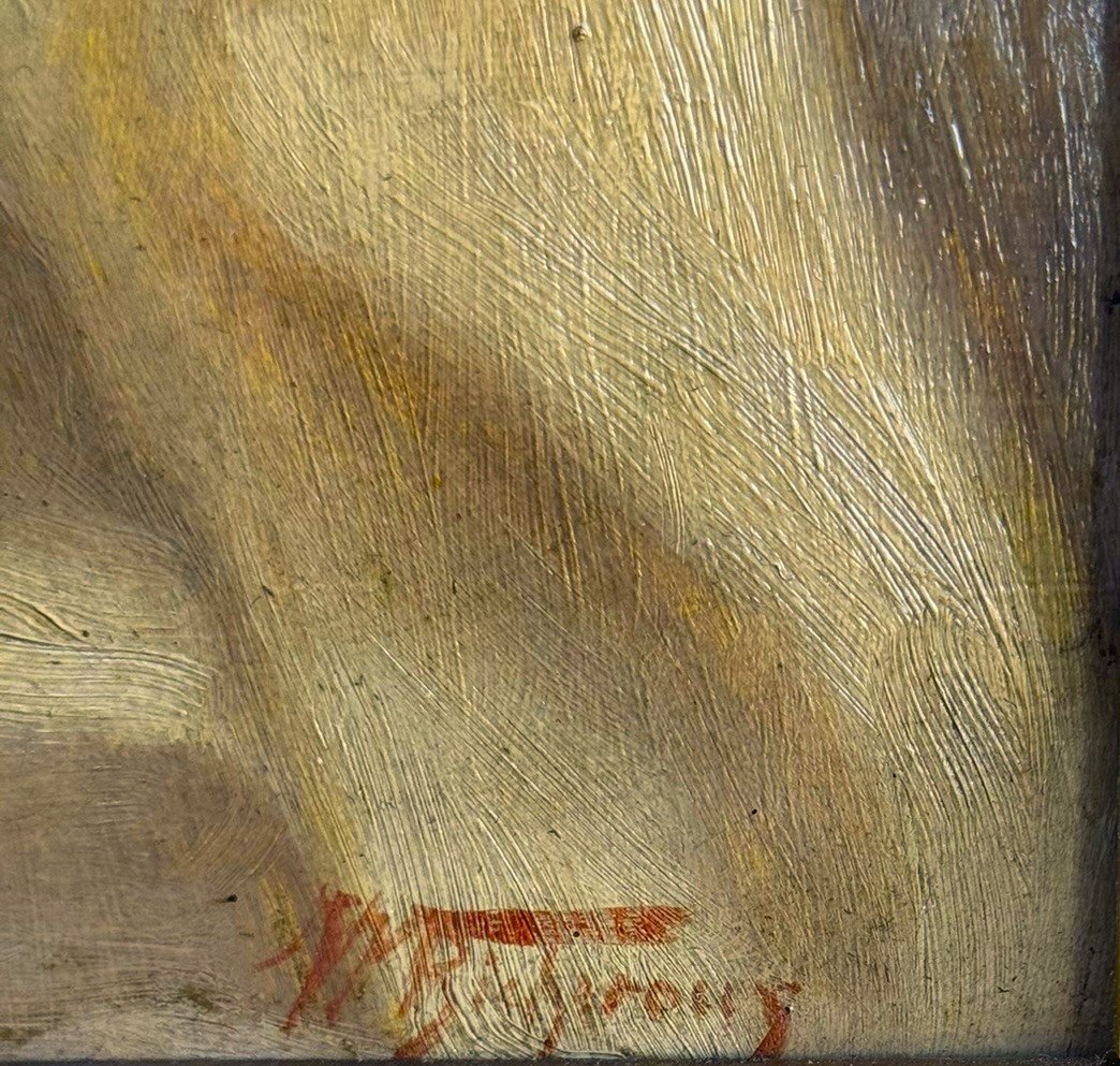 This is an antique painting titled “Young Girl.” The work is signed, although unfortunately the signature is illegible to us. It is a late 19th-century piece, beautifully capturing the quiet, contemplative expression of a young child.