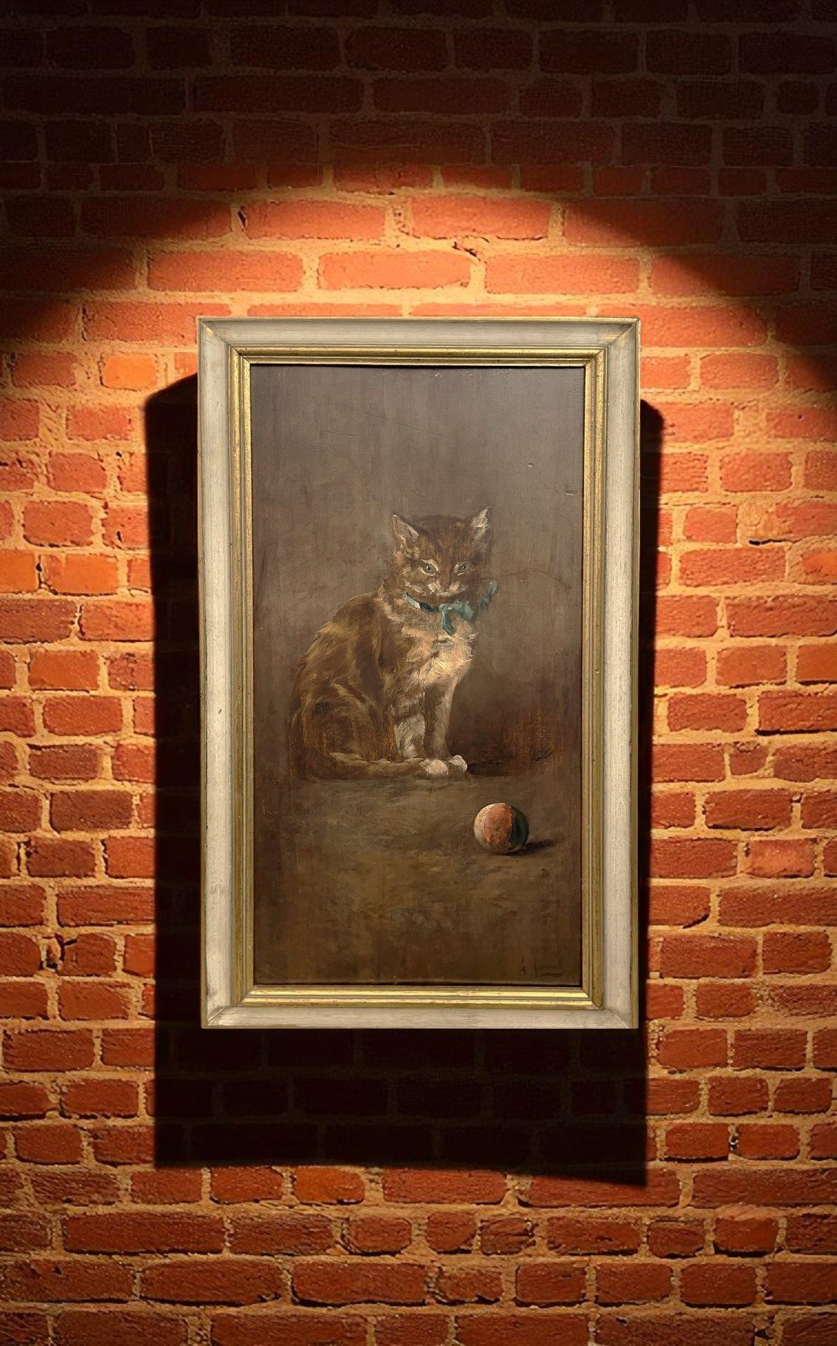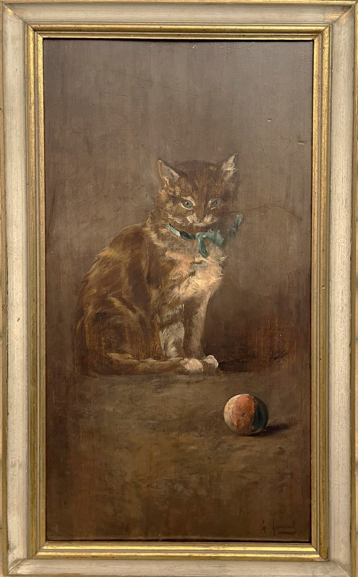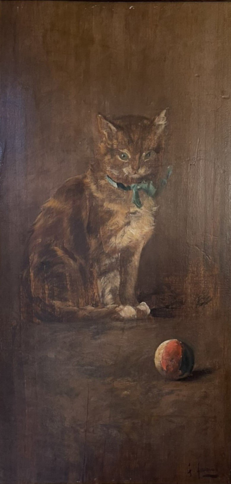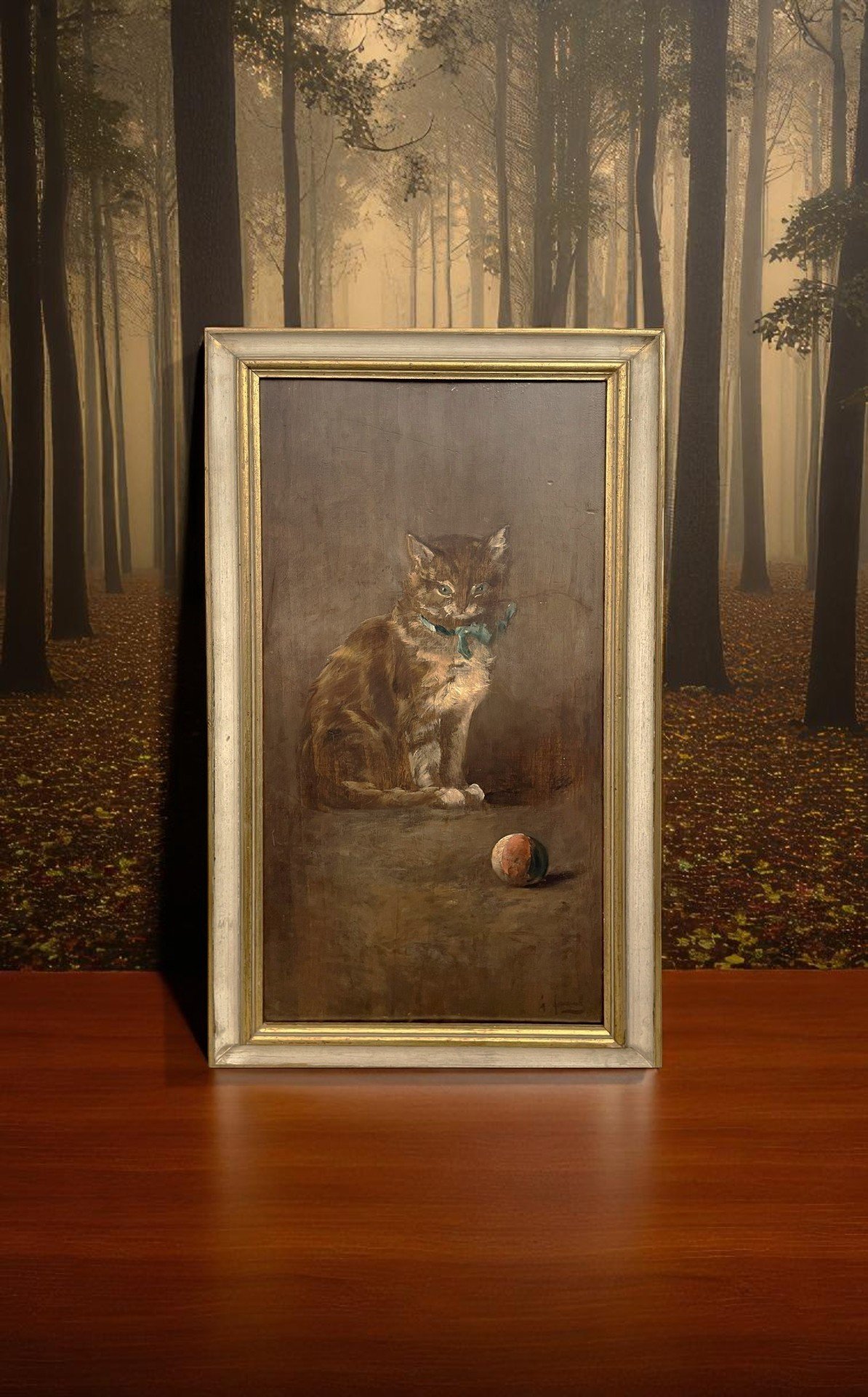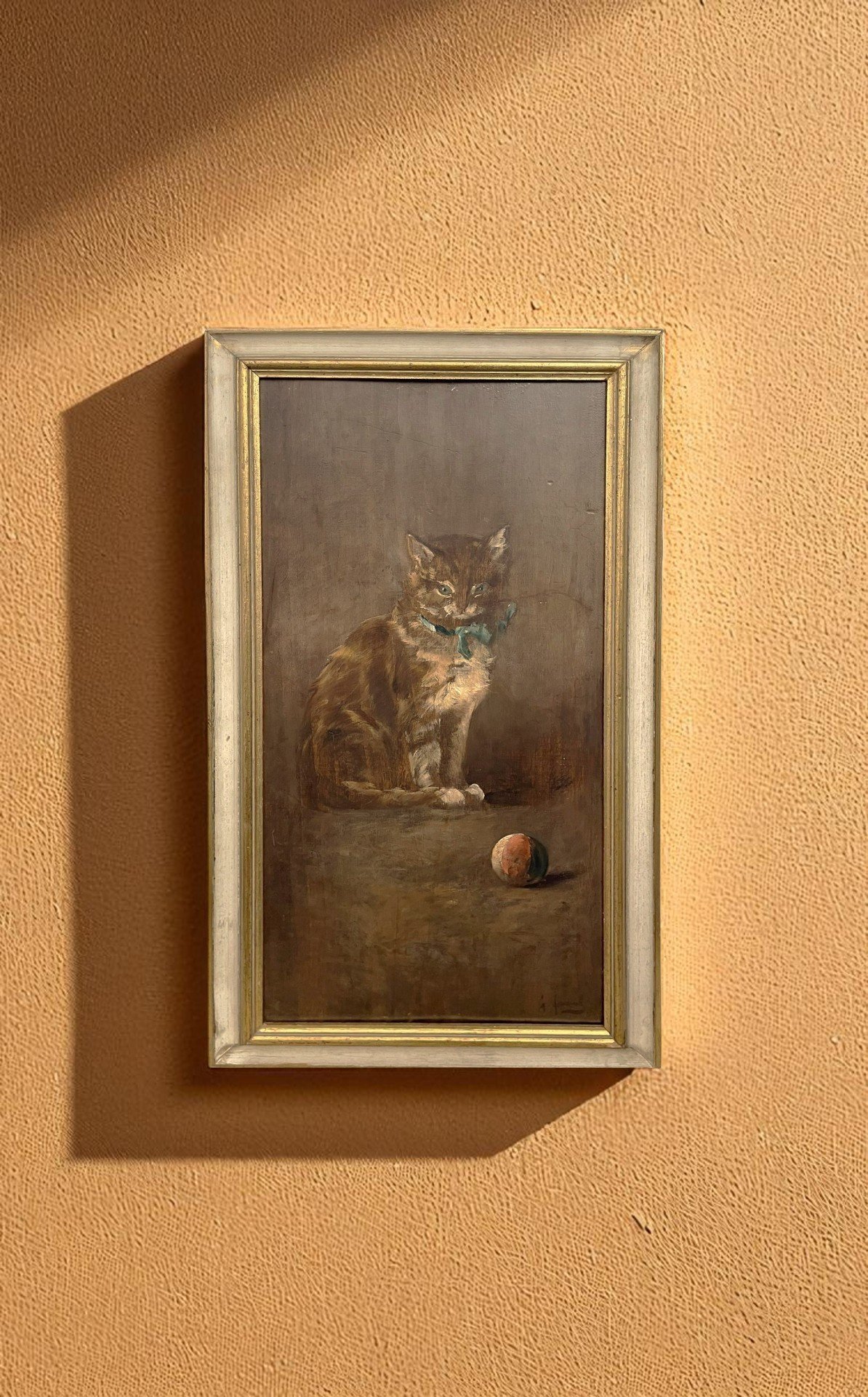 Playing Cat with Ball, Original Oil on Wood, Vintage painting