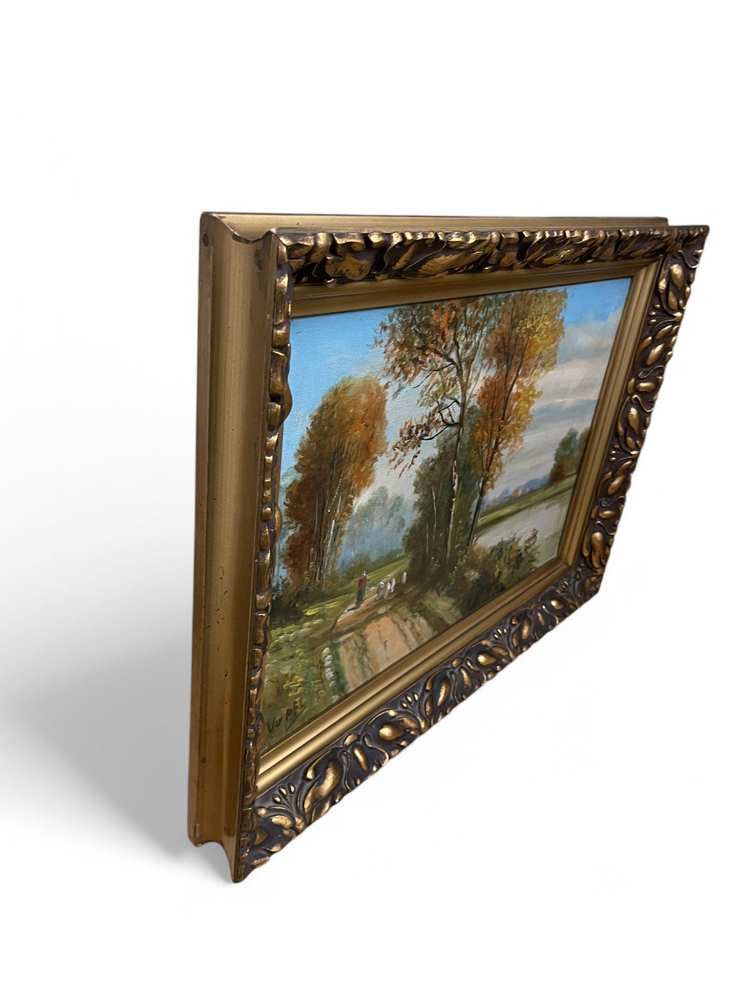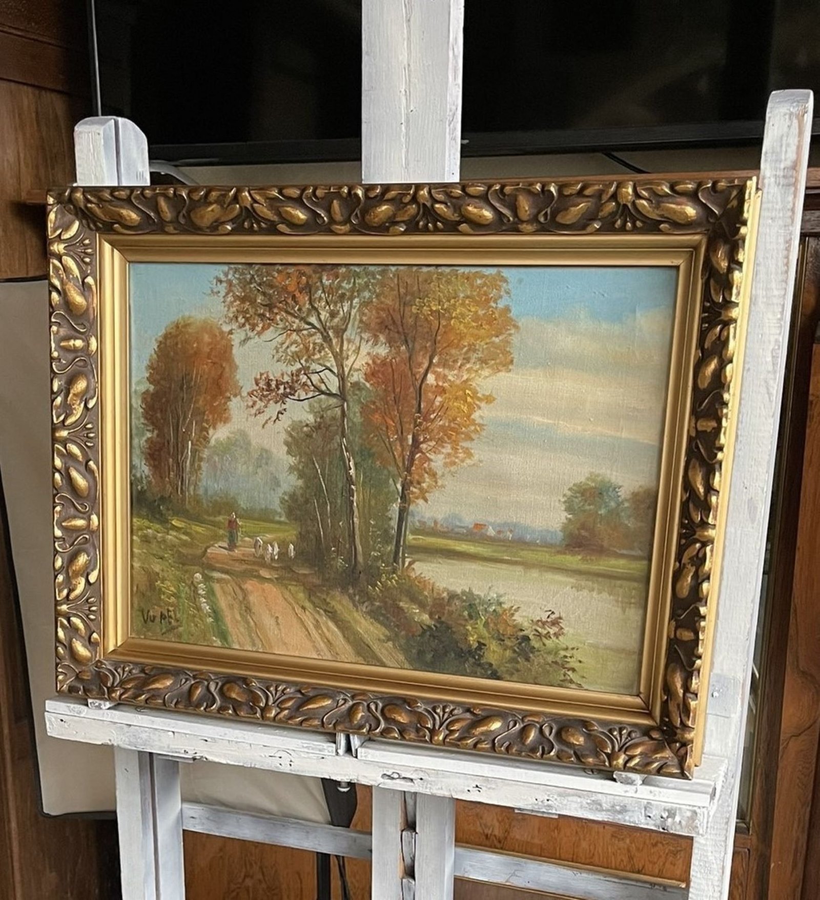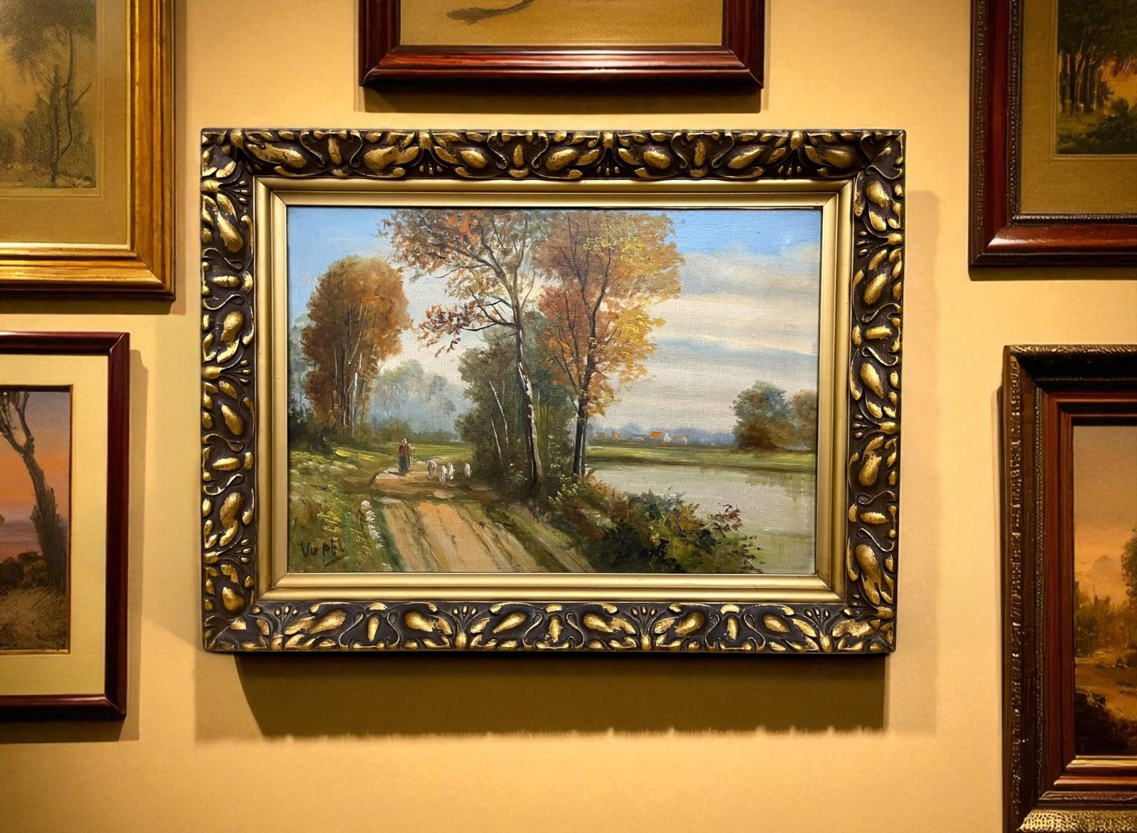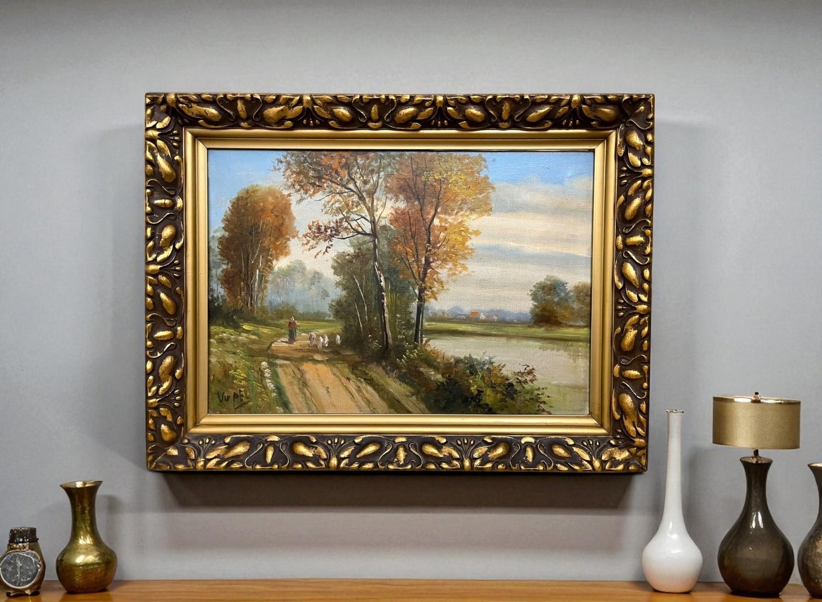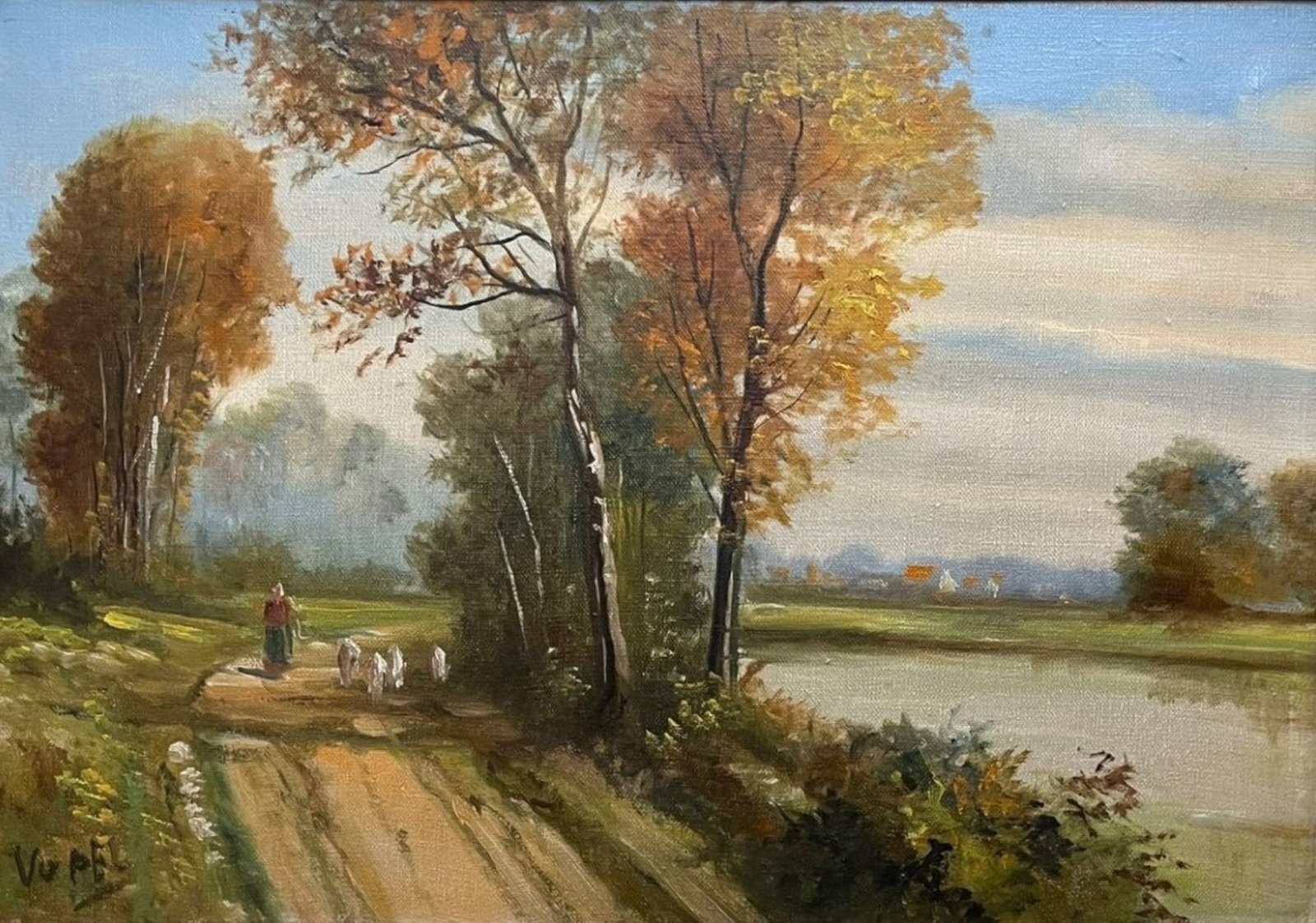 The painting was created around the 1940s. It shows a shepherdess bringing about four sheep back to a place.