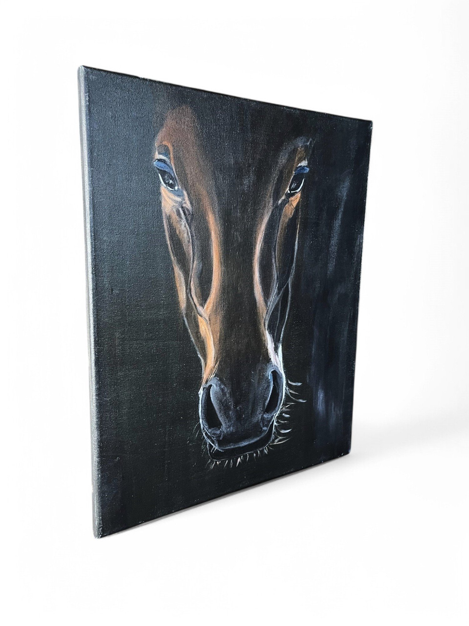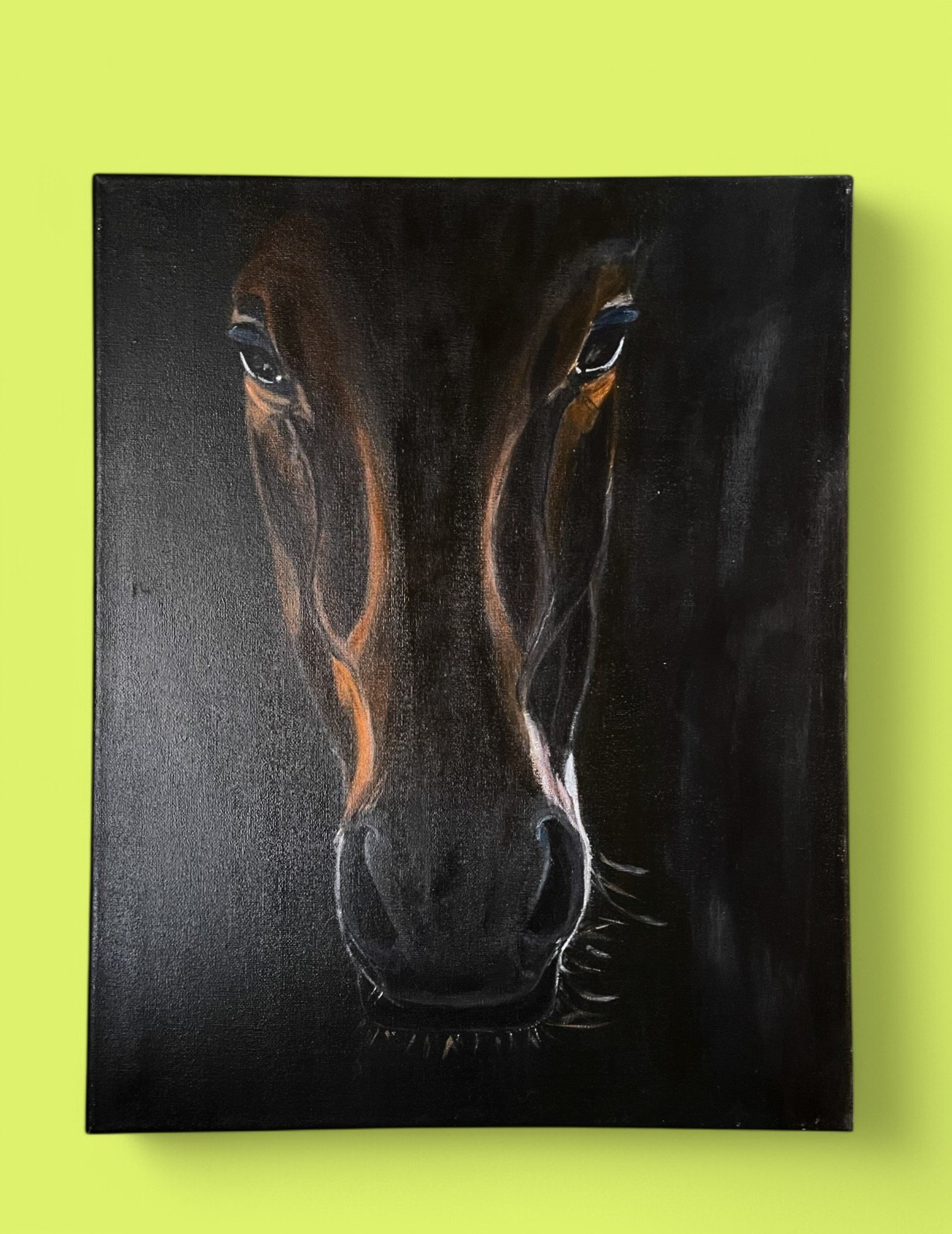 A vintage painting of a front-facing horse head from the 90s, beautifully painted and very decorative.