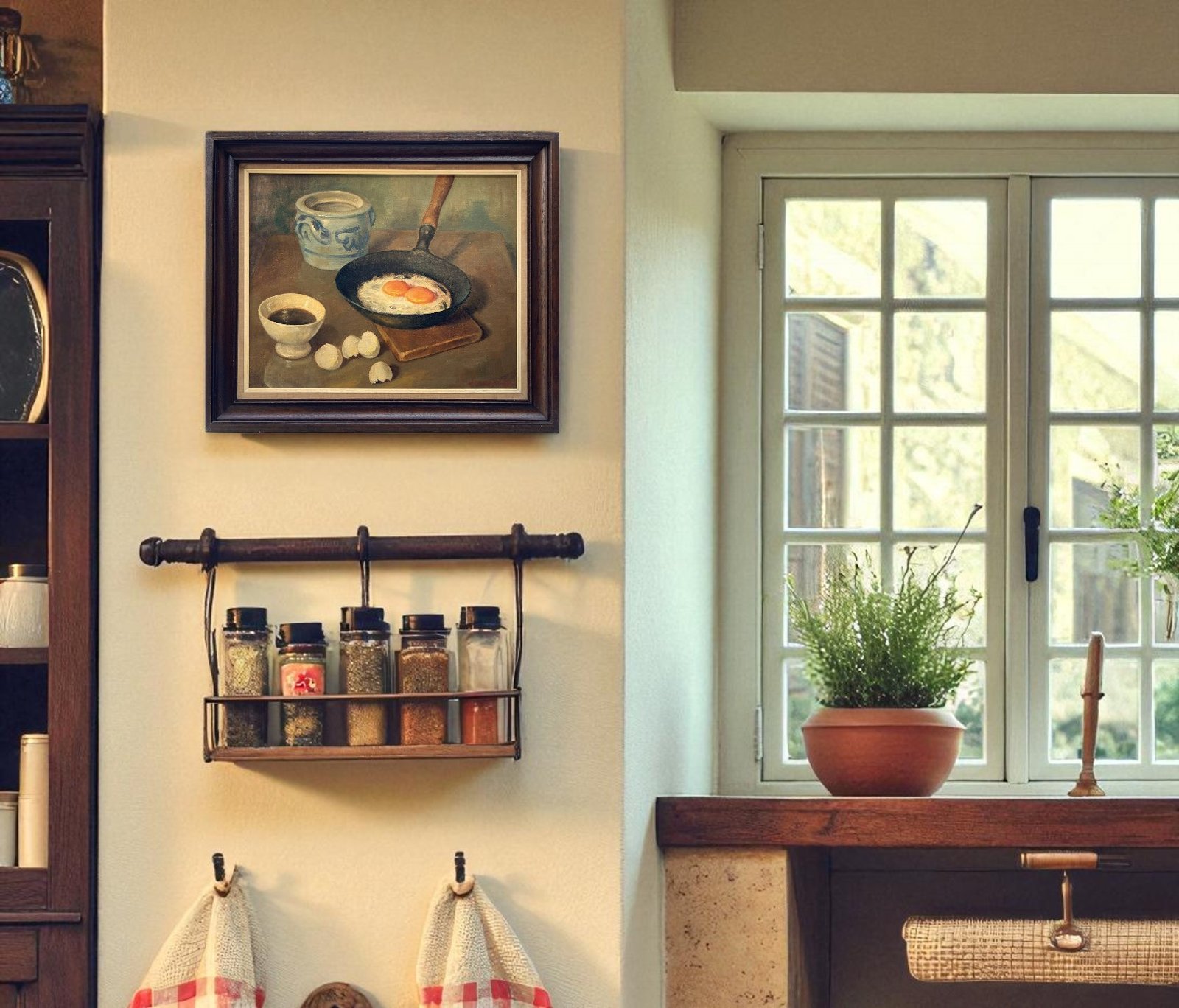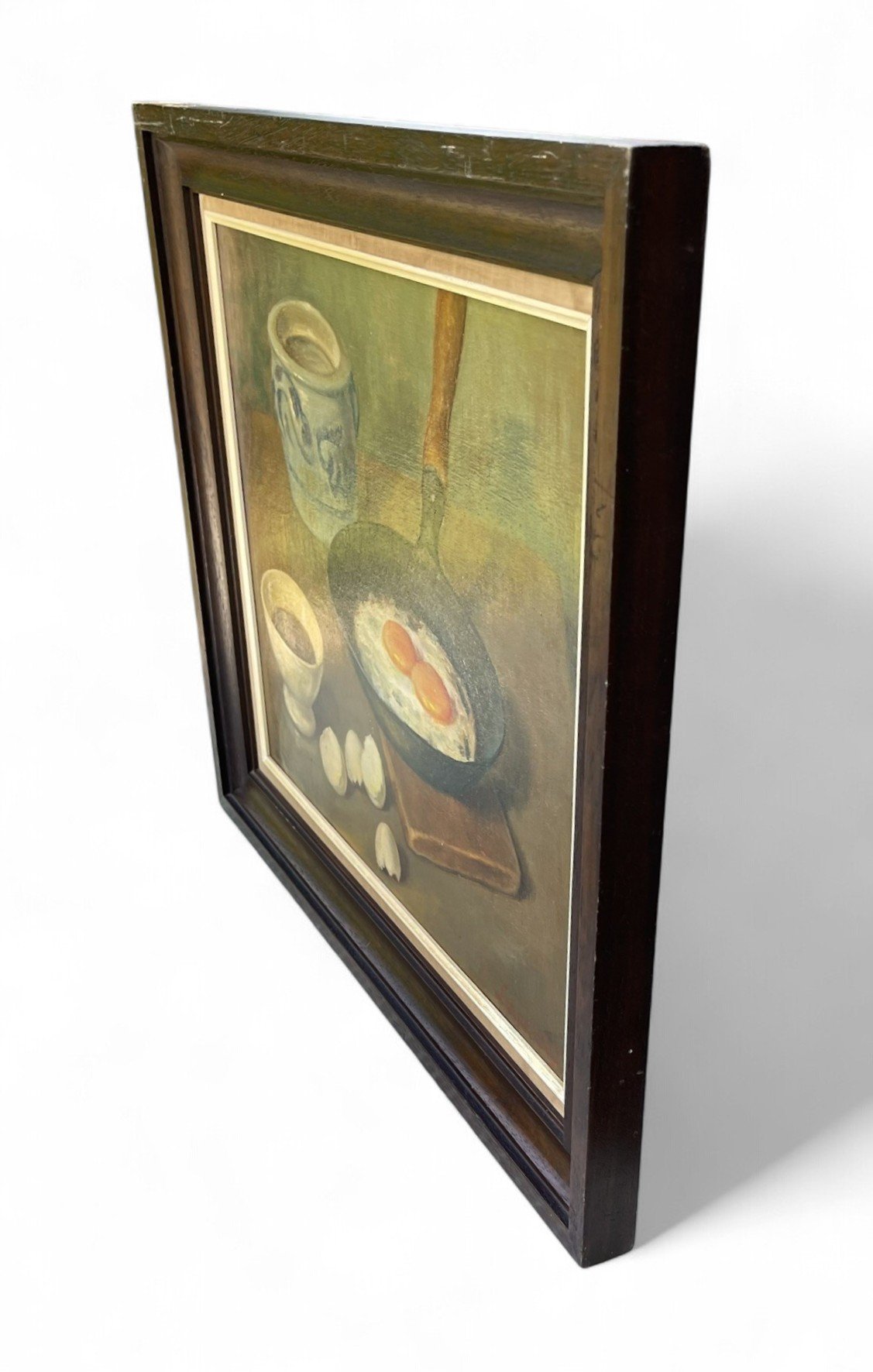 This painting is an original oil on canvas, mounted on a panel. A typical still life from the kitchen world. Something truly perfect to hang in your kitchen. The painting was created around the 1950s. All colors in this artwork are subjective and may vary on your monitor. It is signed by the artist in the lower right corner. The painting is in good condition. It comes in a beautiful wooden frame.