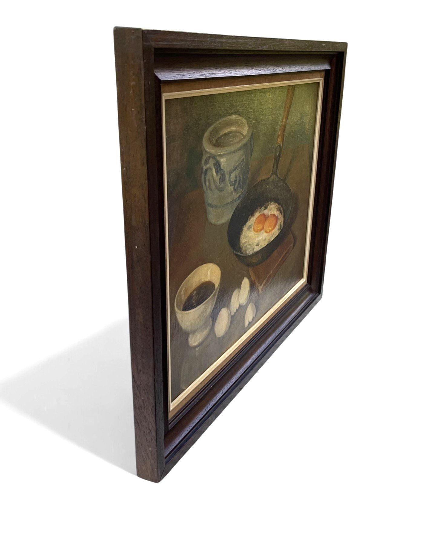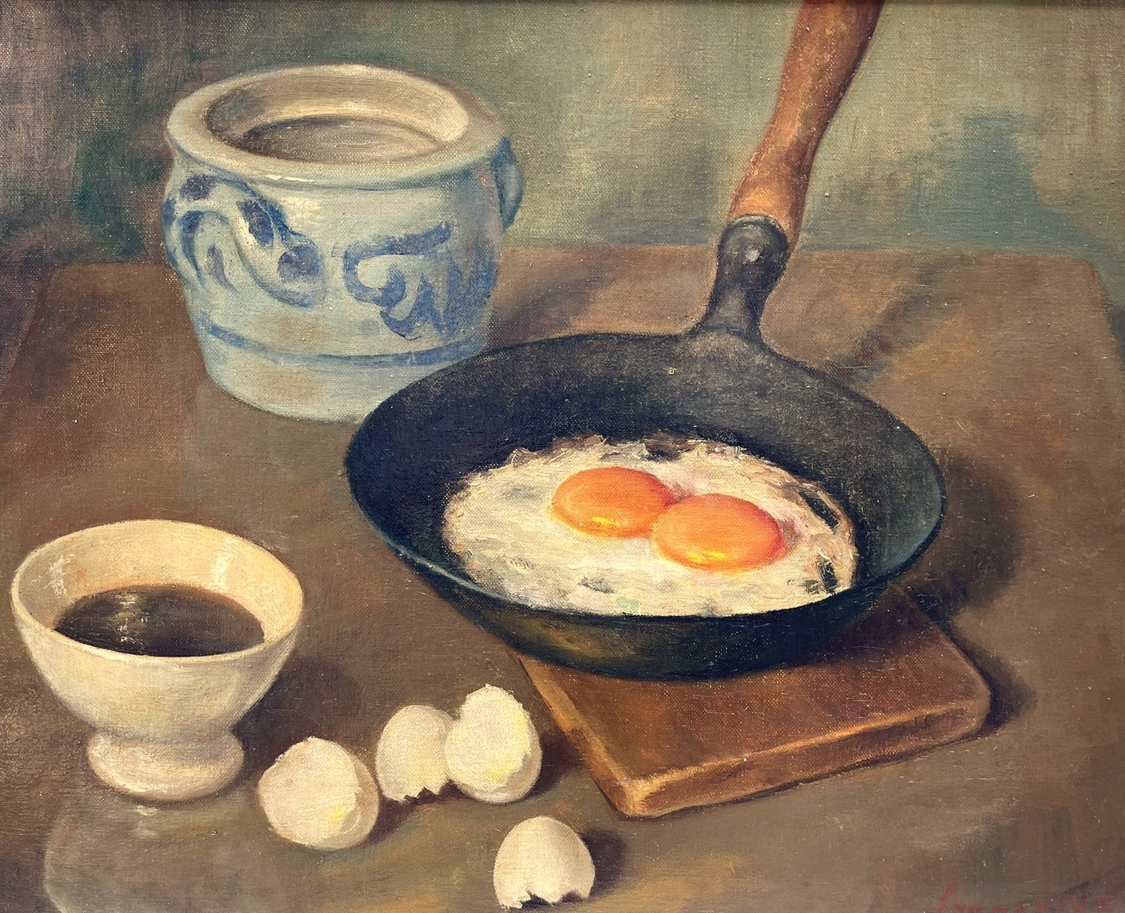 Vintage Still Life Painting, Fried Egg in a Pan with a Cup of Coffee, Signed