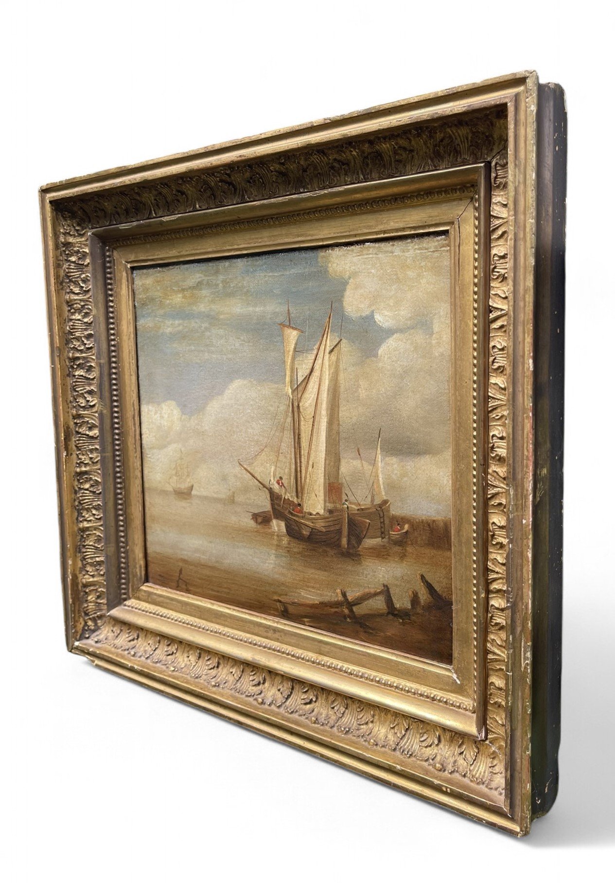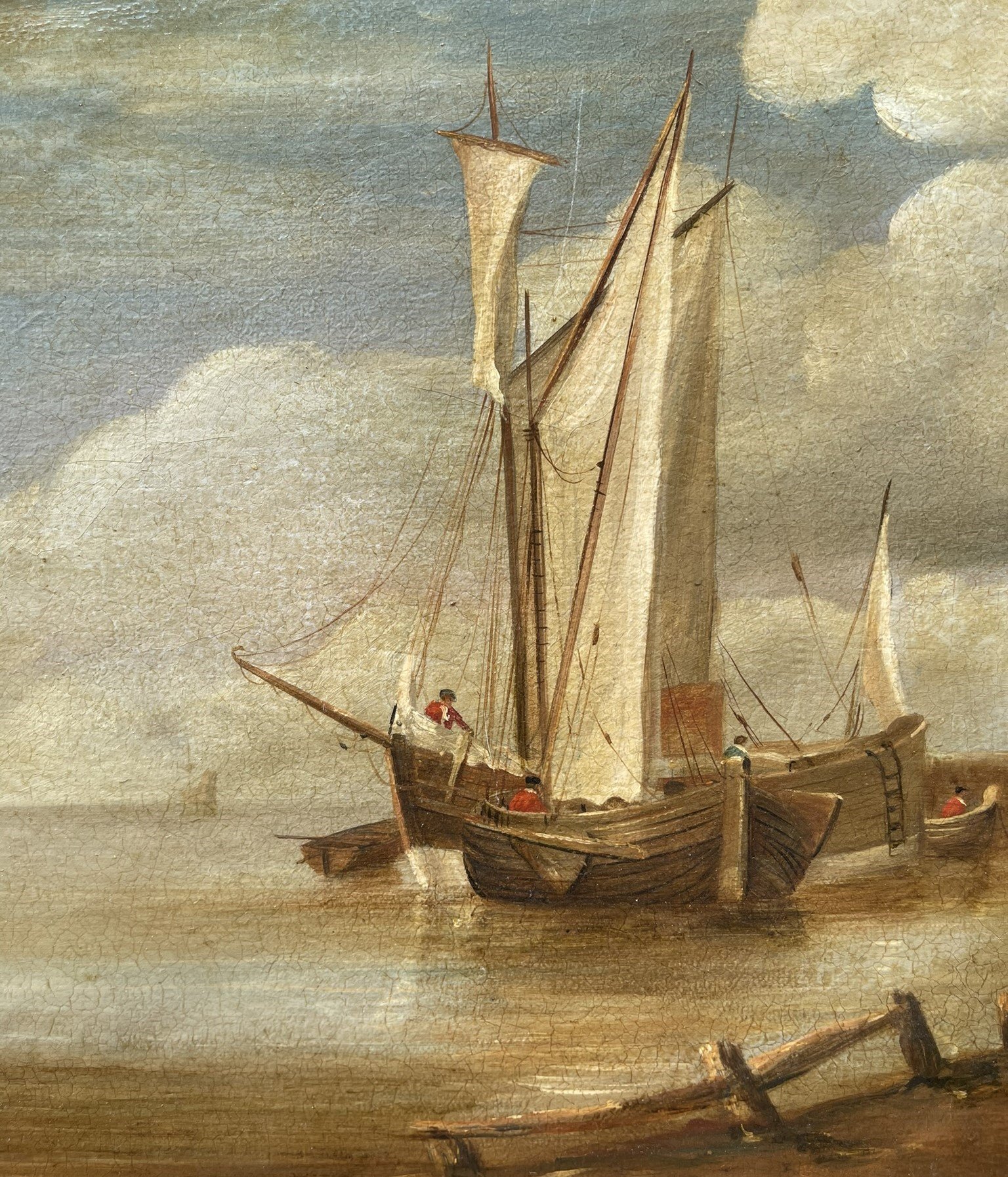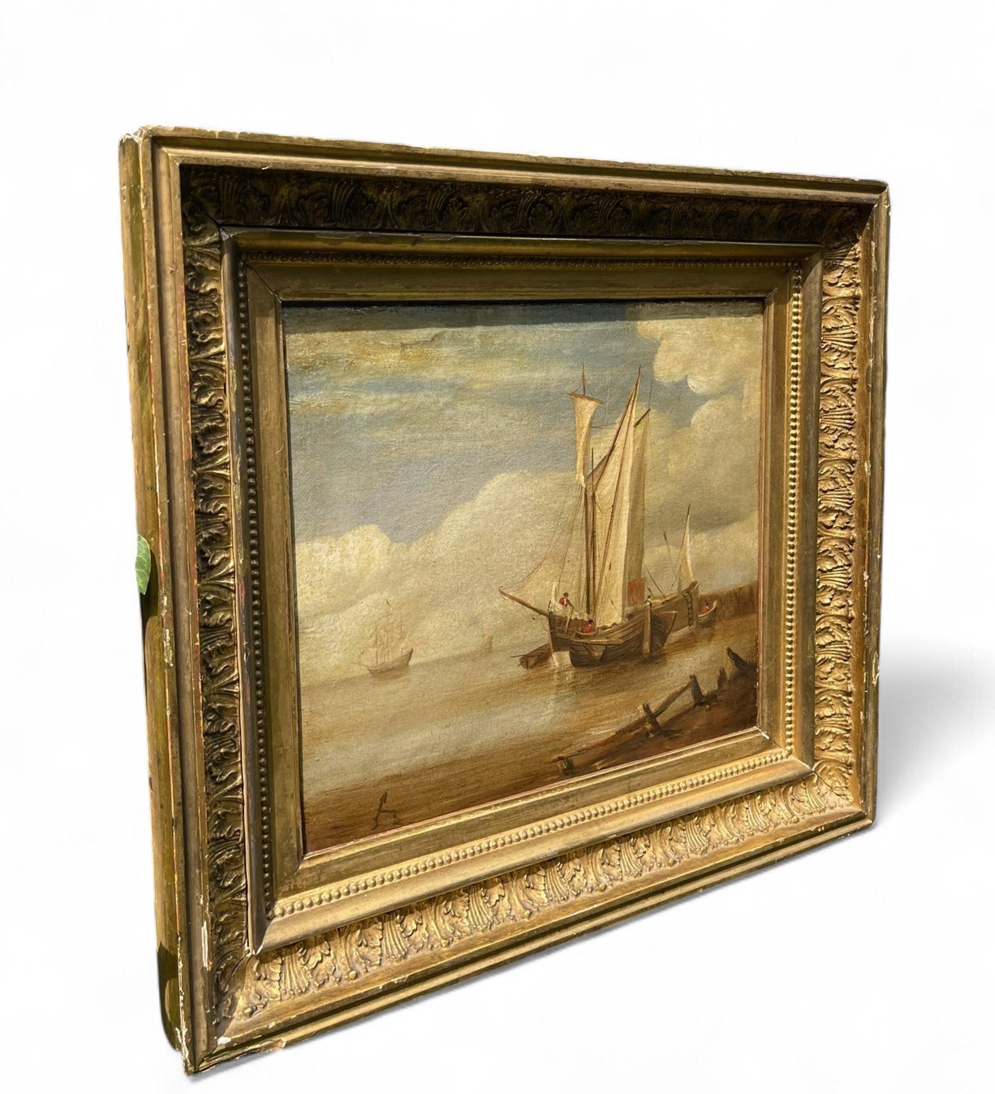 This classic maritime oil painting depicts a tranquil coastal scene with various sailing ships anchored on calm waters. The focal point is a detailed ship with high sails, peacefully situated near the shore. A sailor can be seen on board, adding a lively and realistic character to the piece. In the background, more ships fade into a mysterious horizon, enhancing the depth and atmosphere of the scene. Thick cumulus clouds dominate the sky, reflecting the calm weather typical of 18th or 19th-century maritime art.