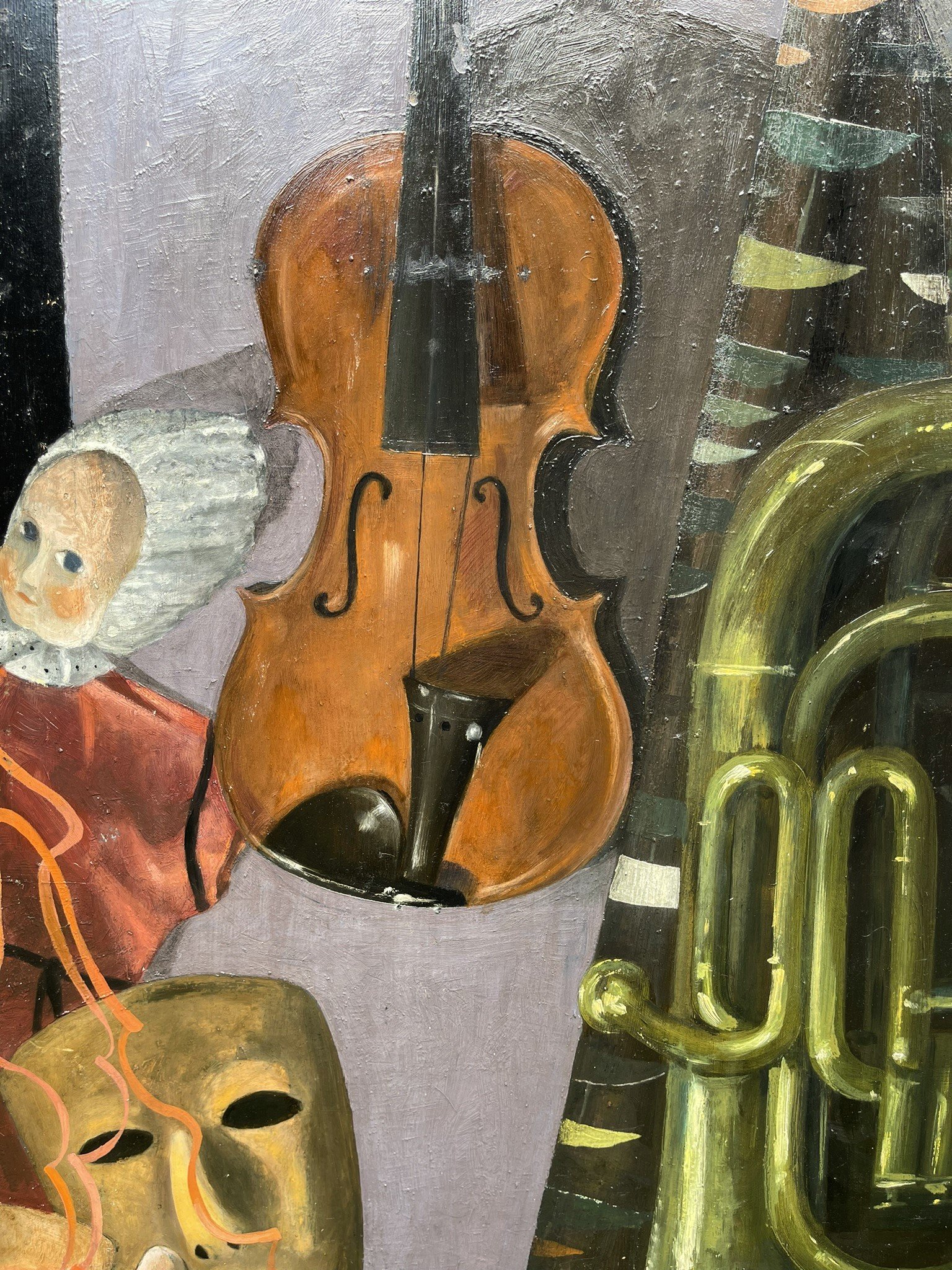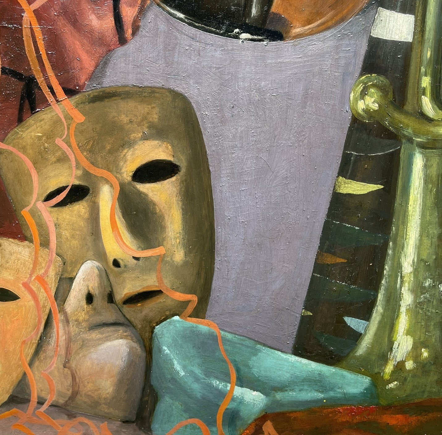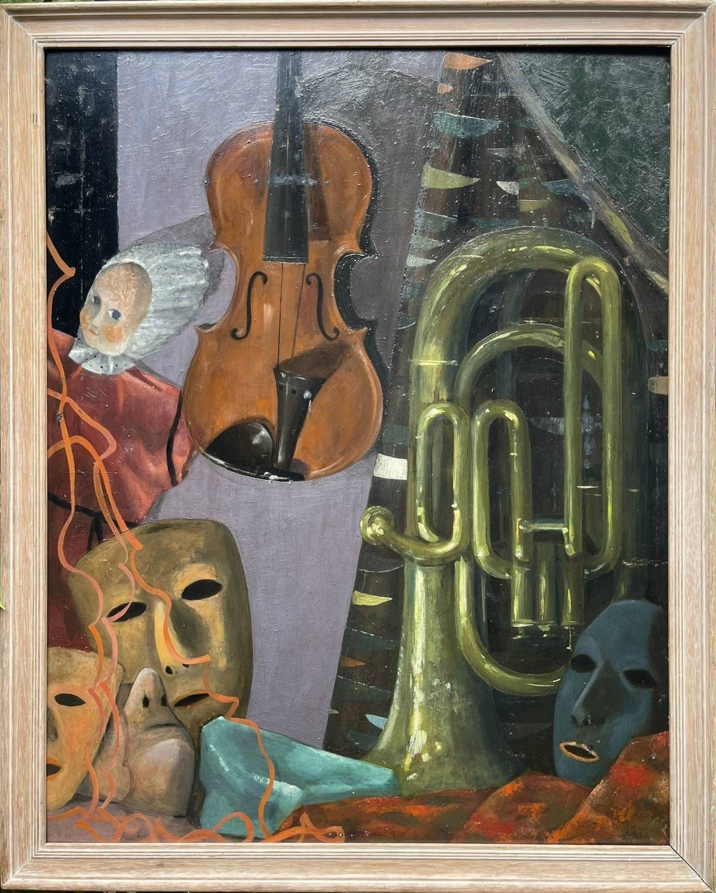 The painting is a richly detailed still life with a theatrical and musical theme. It features a variety of objects layered in a dramatic composition, including: