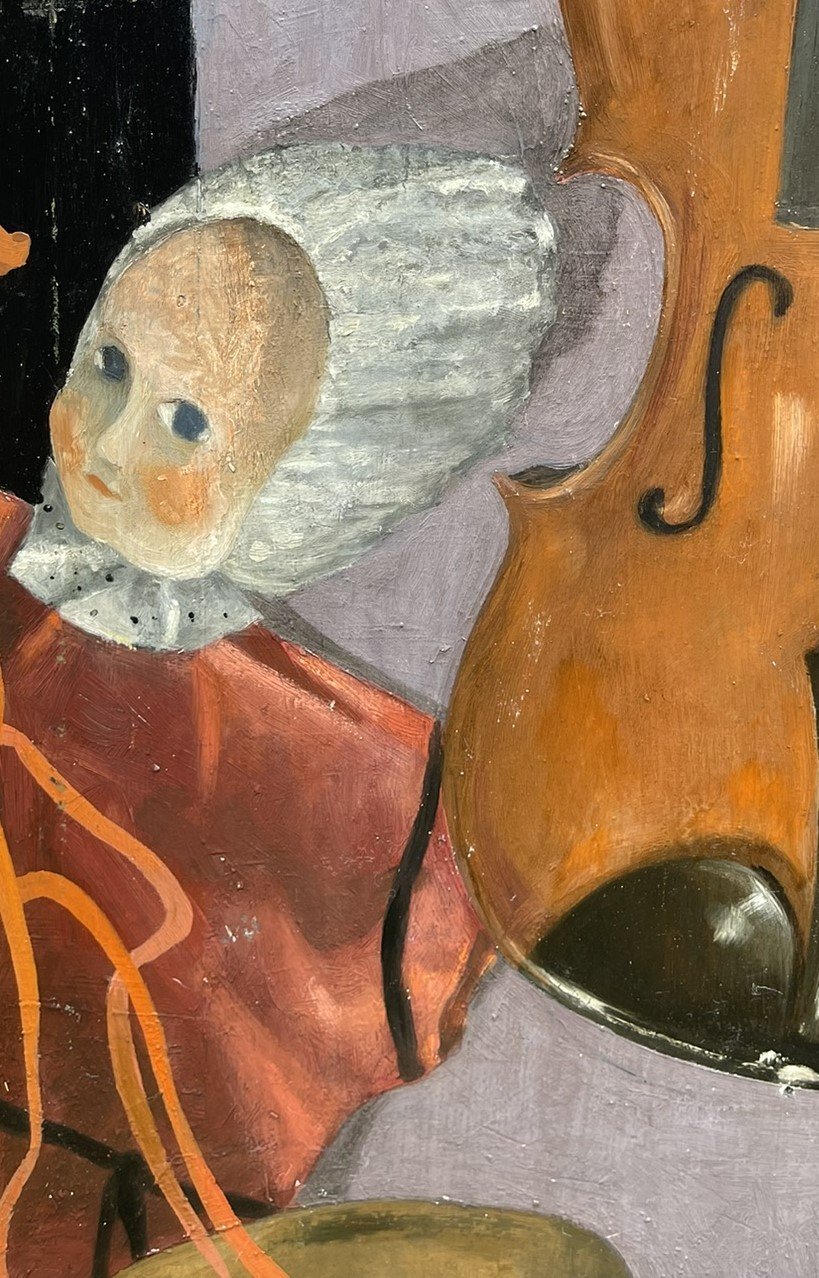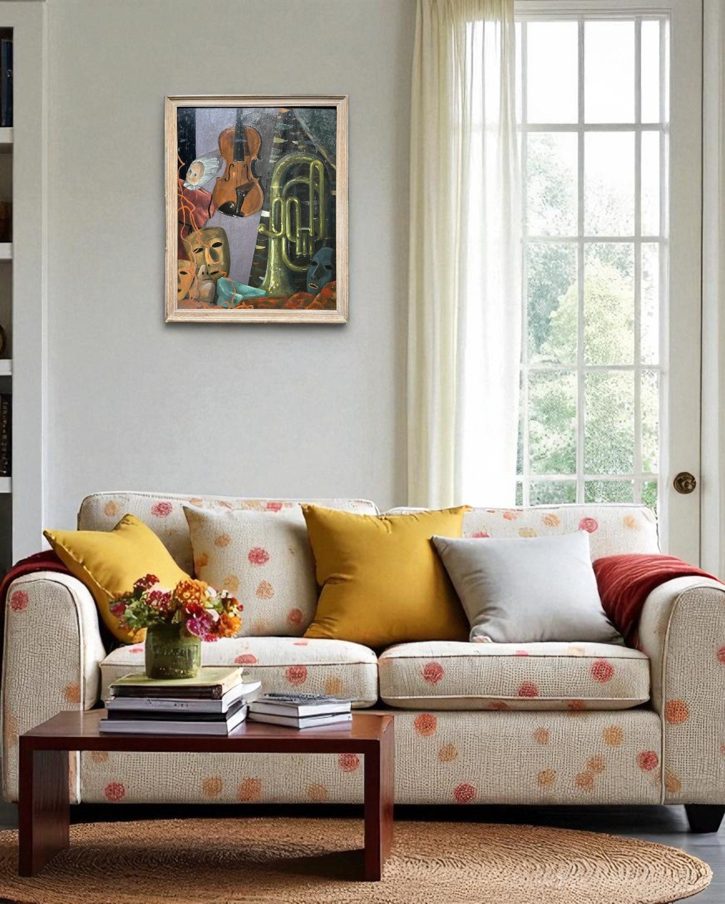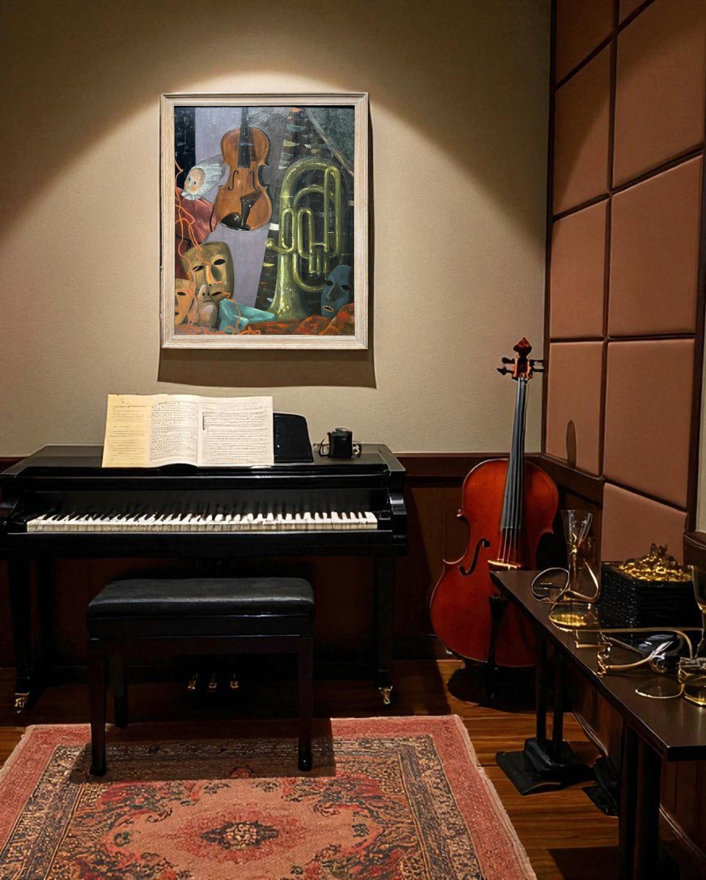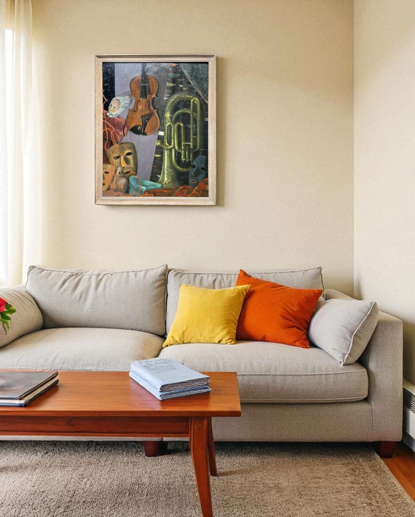 The painting is a richly detailed still life with a theatrical and musical theme. It features a variety of objects layered in a dramatic composition, including: