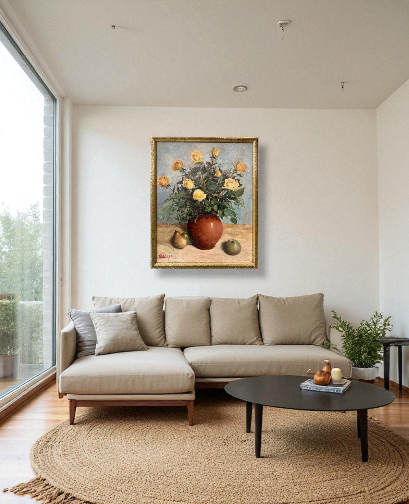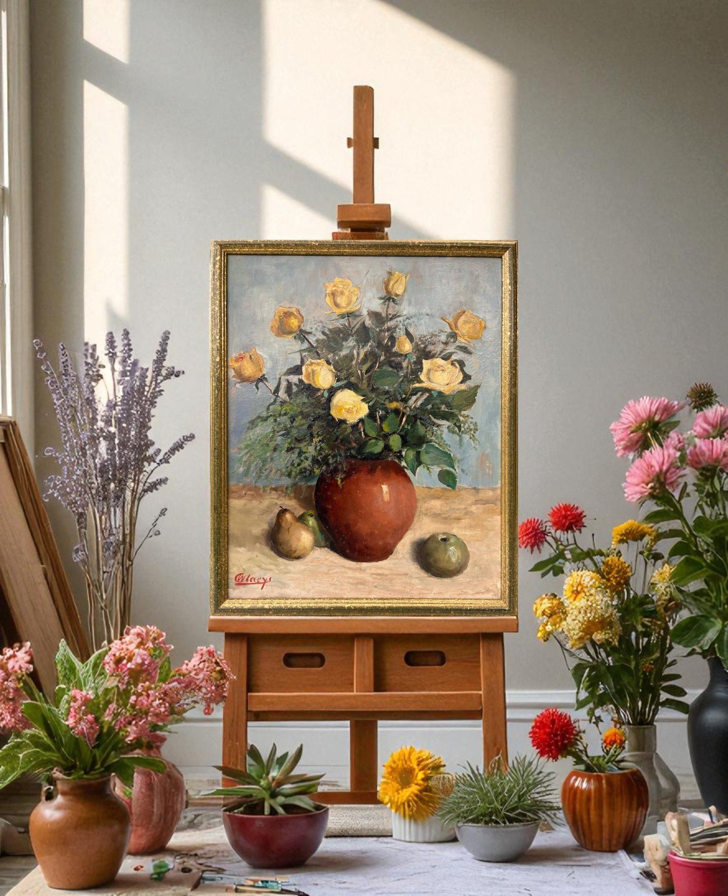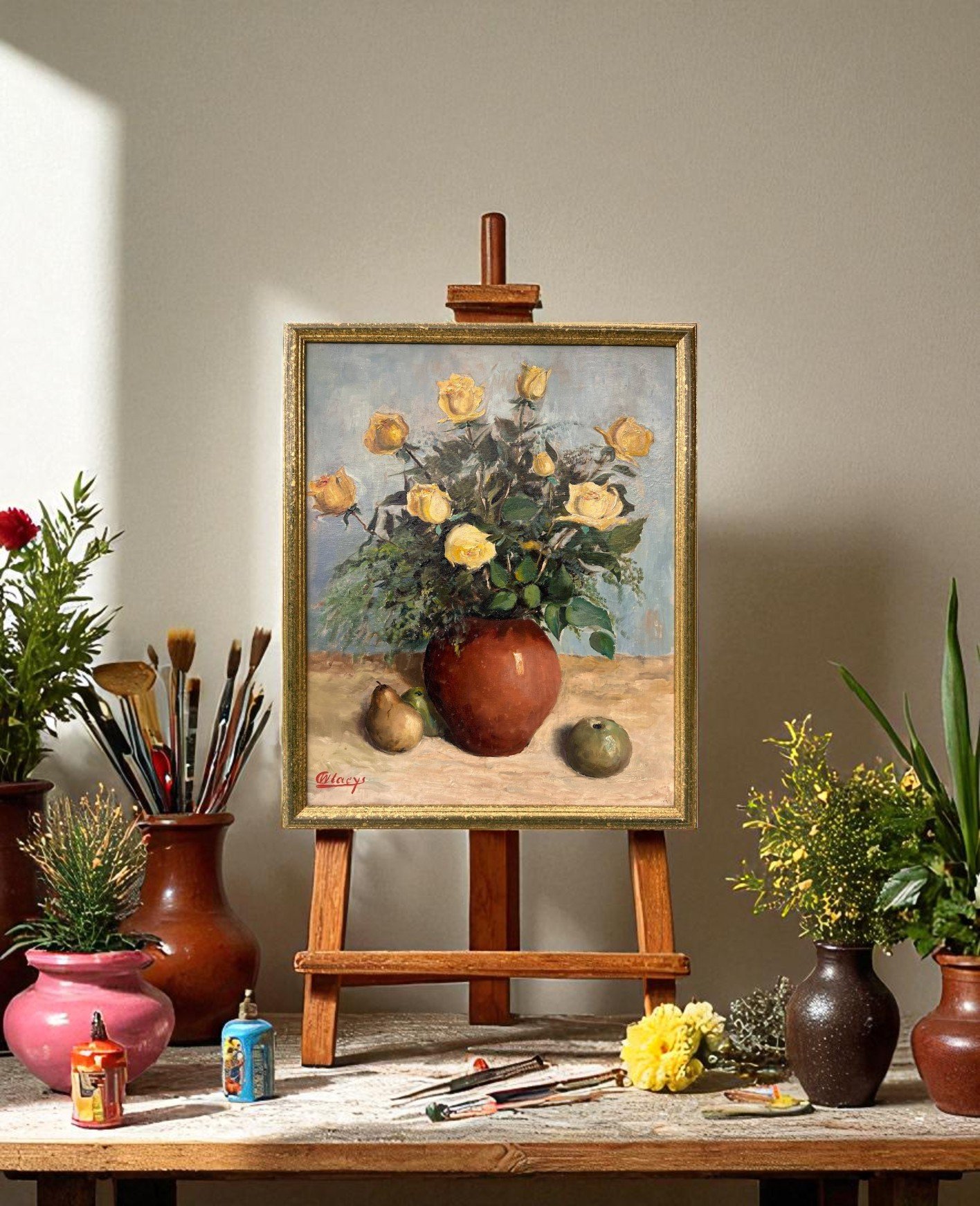 This charming oil painting from around the 1970s captures the timeless beauty of flowers and fruit. The composition is centered around a rustic, reddish-brown vase filled with lush yellow roses, surrounded by delicate greenery. A pear and a green apple lie casually at the base, contributing to the classic still life ambiance.