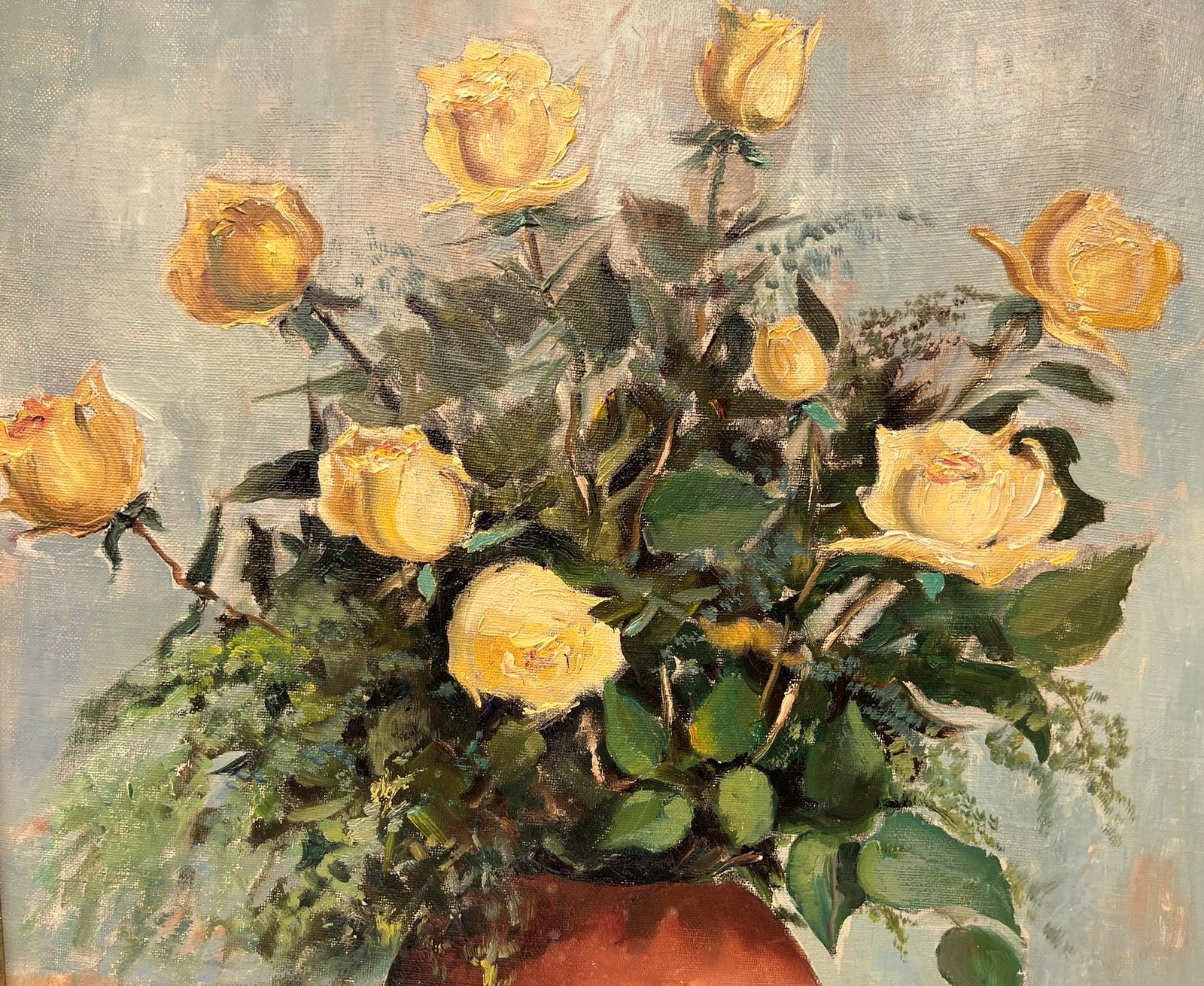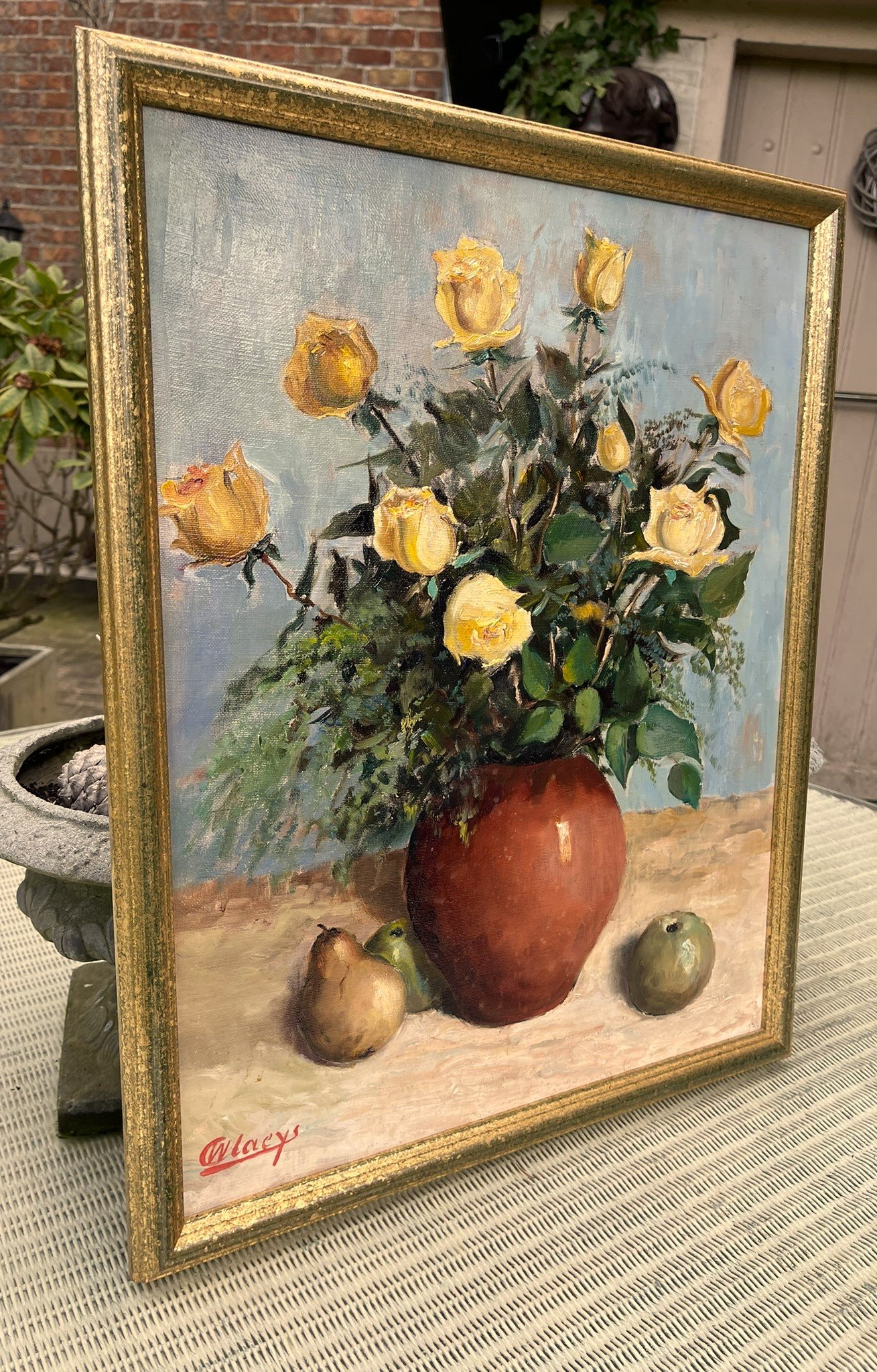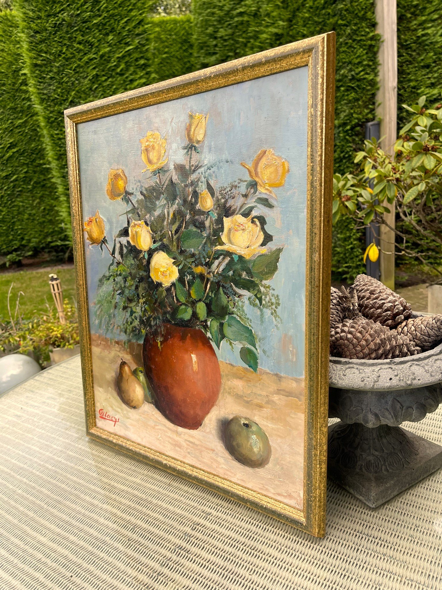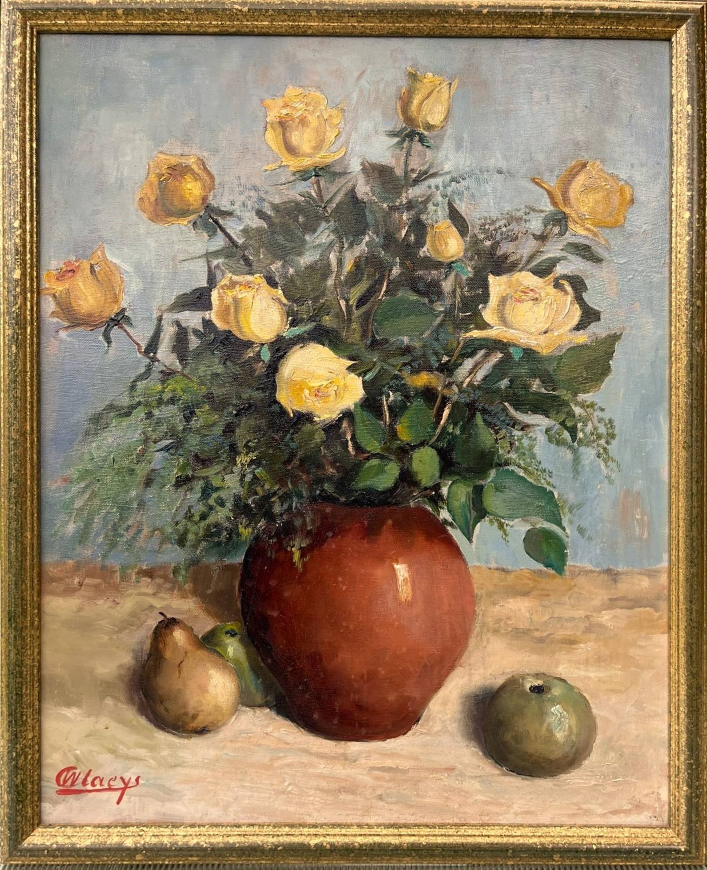 This charming oil painting from around the 1970s captures the timeless beauty of flowers and fruit. The composition is centered around a rustic, reddish-brown vase filled with lush yellow roses, surrounded by delicate greenery. A pear and a green apple lie casually at the base, contributing to the classic still life ambiance.