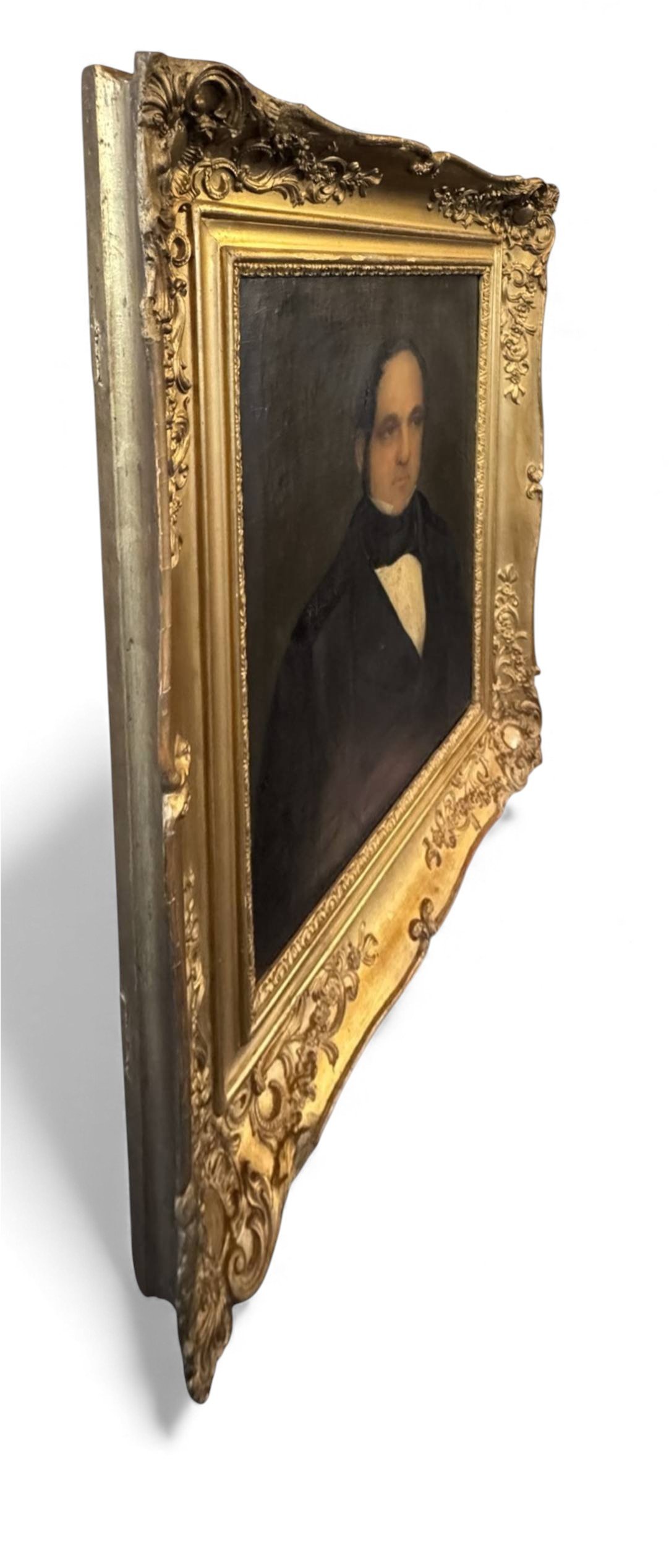 The painting is in good condition considering its age (mid-19th century). An old restoration was previously performed on the canvas on the man's hair; however, when the painting is hung, this restoration is barely visible. There is some craquelure present here and there, which is consistent with the age of the piece. The frame has undergone small repairs in the past but remains in good appearance and presents very well.