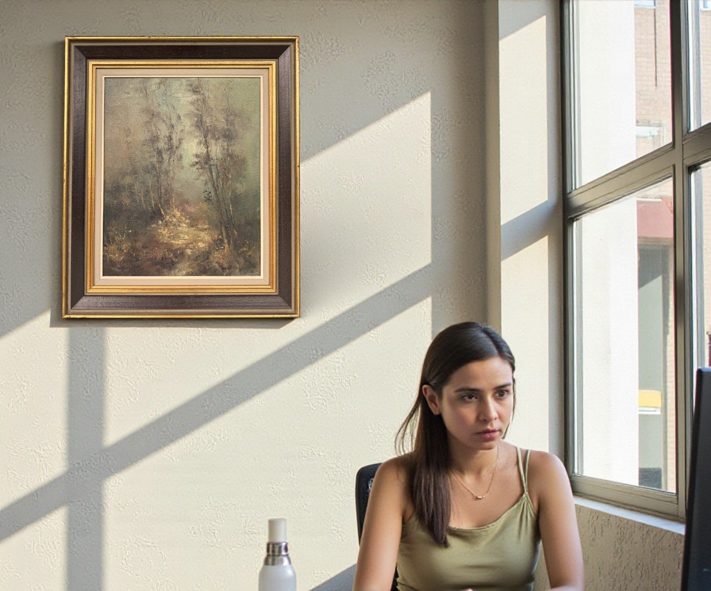 Misty Wood is a poetic vintage oil painting signed and dated 1975, capturing a quiet woodland scene softened by mist and filtered light. With its muted earth tones, layered brushwork, and dreamy atmosphere, this artwork evokes calm, nostalgia, and timeless elegance. A beautiful statement piece for lovers of vintage décor, nature-inspired interiors, and classic landscape art.