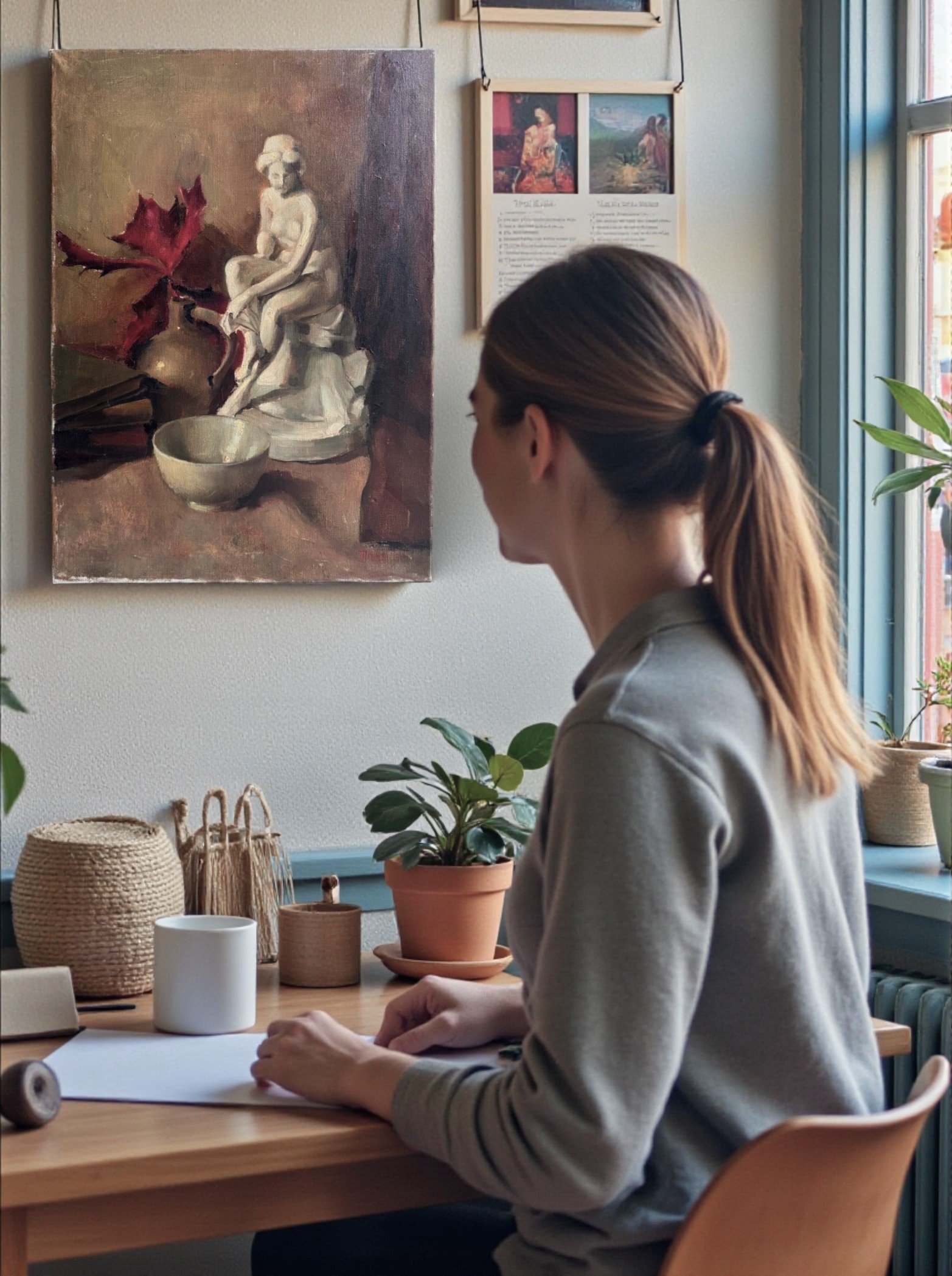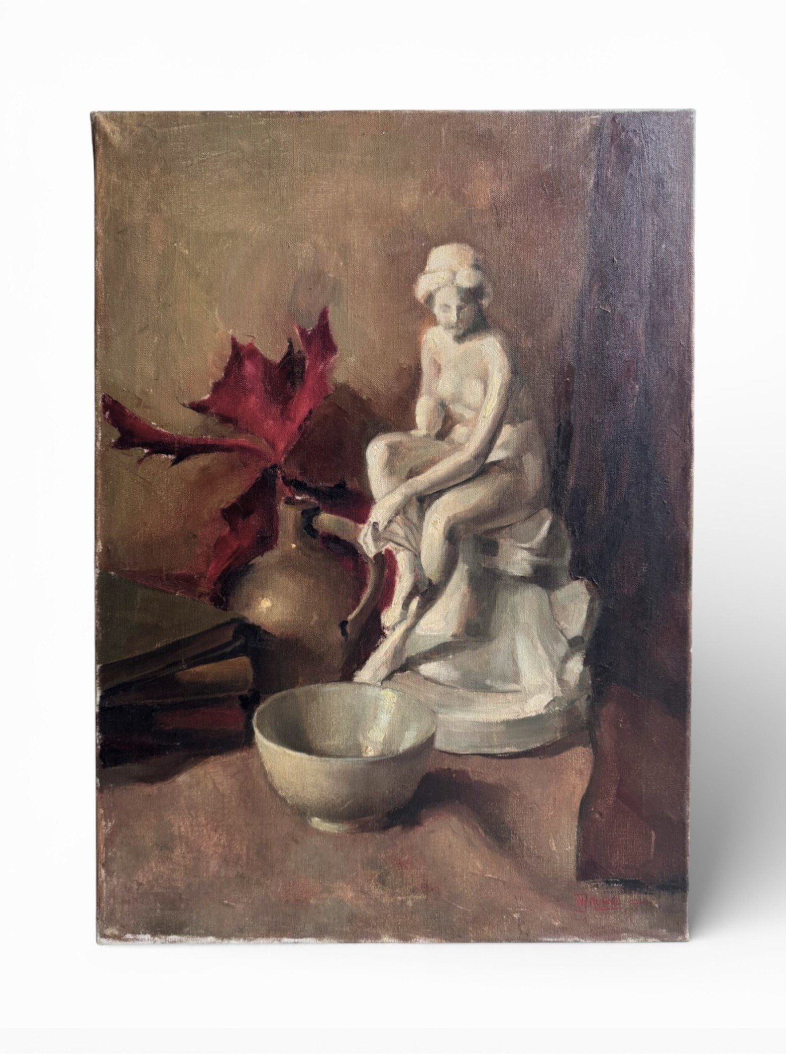 is an atmospheric mid-century still life that blends classical elegance with quiet introspection. This original oil on canvas depicts a serene classical figurine seated beside a simple bowl and books, set against a muted, painterly background with warm earthy tones and deep accents of red.