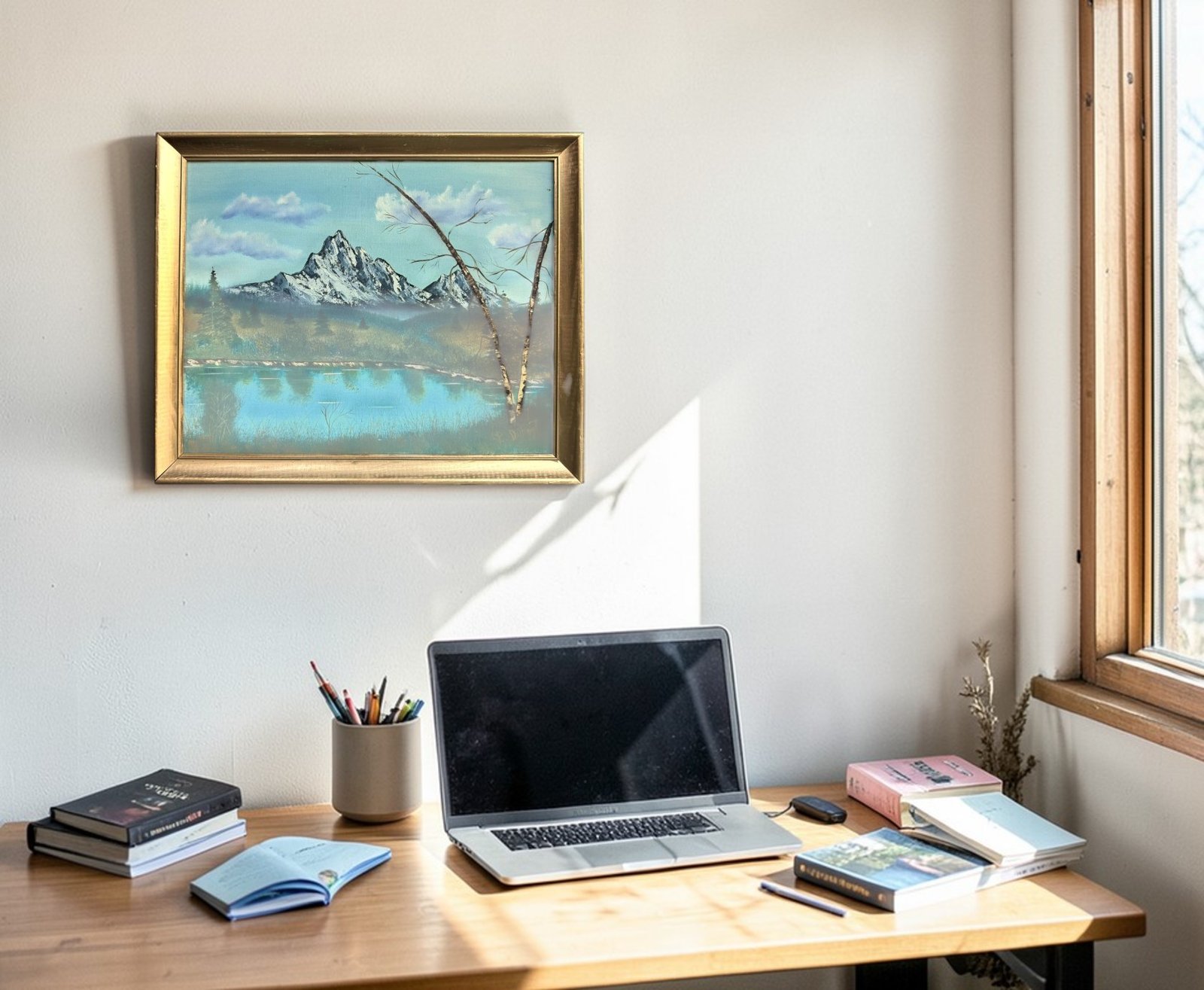 The reflection in the lake adds depth and serenity to the scene, while the slender trees in the foreground give the artwork a natural sense of balance and perspective. The painting has a charming vintage aesthetic that fits perfectly in rustic, cabin, lodge, or mid-century interiors.