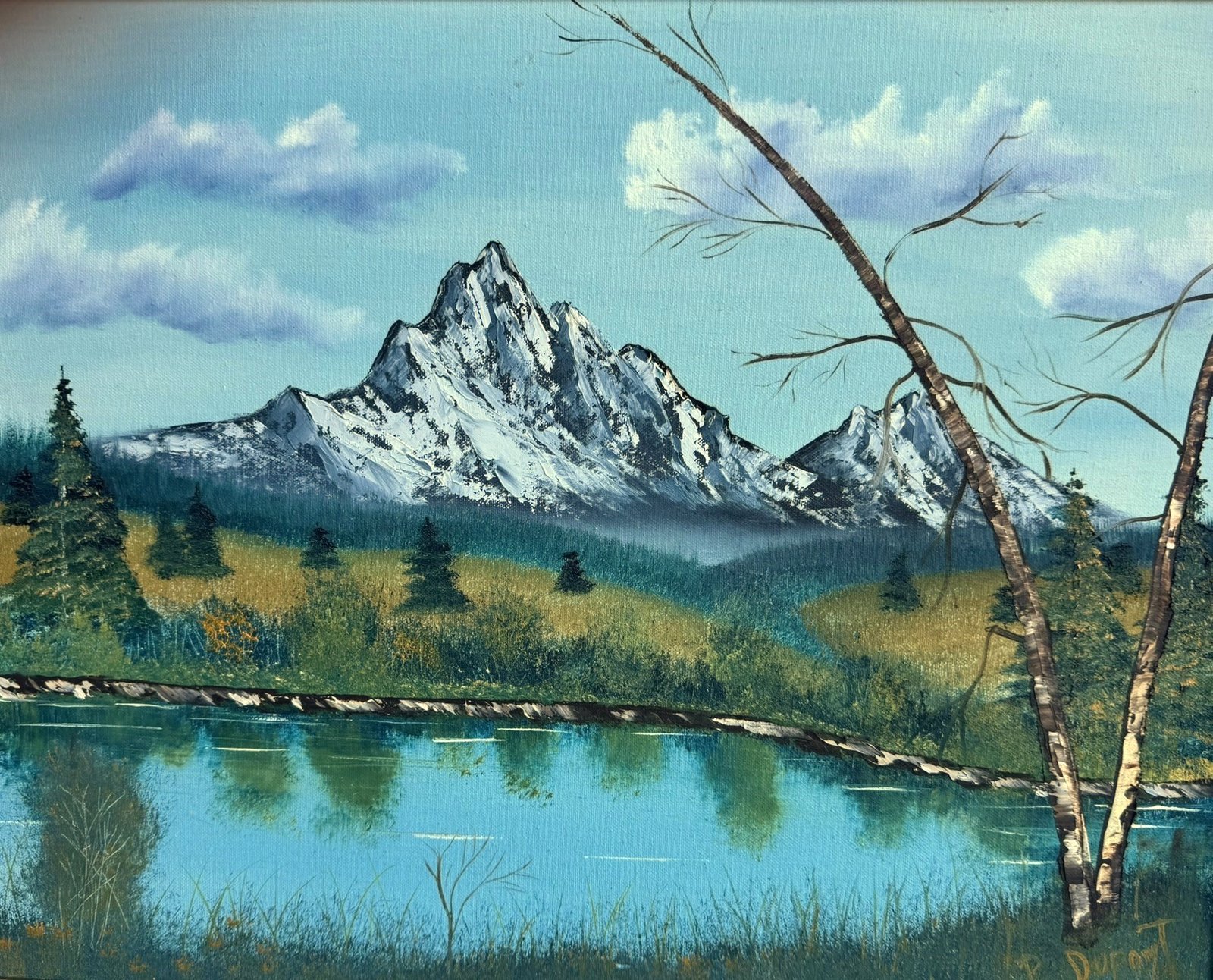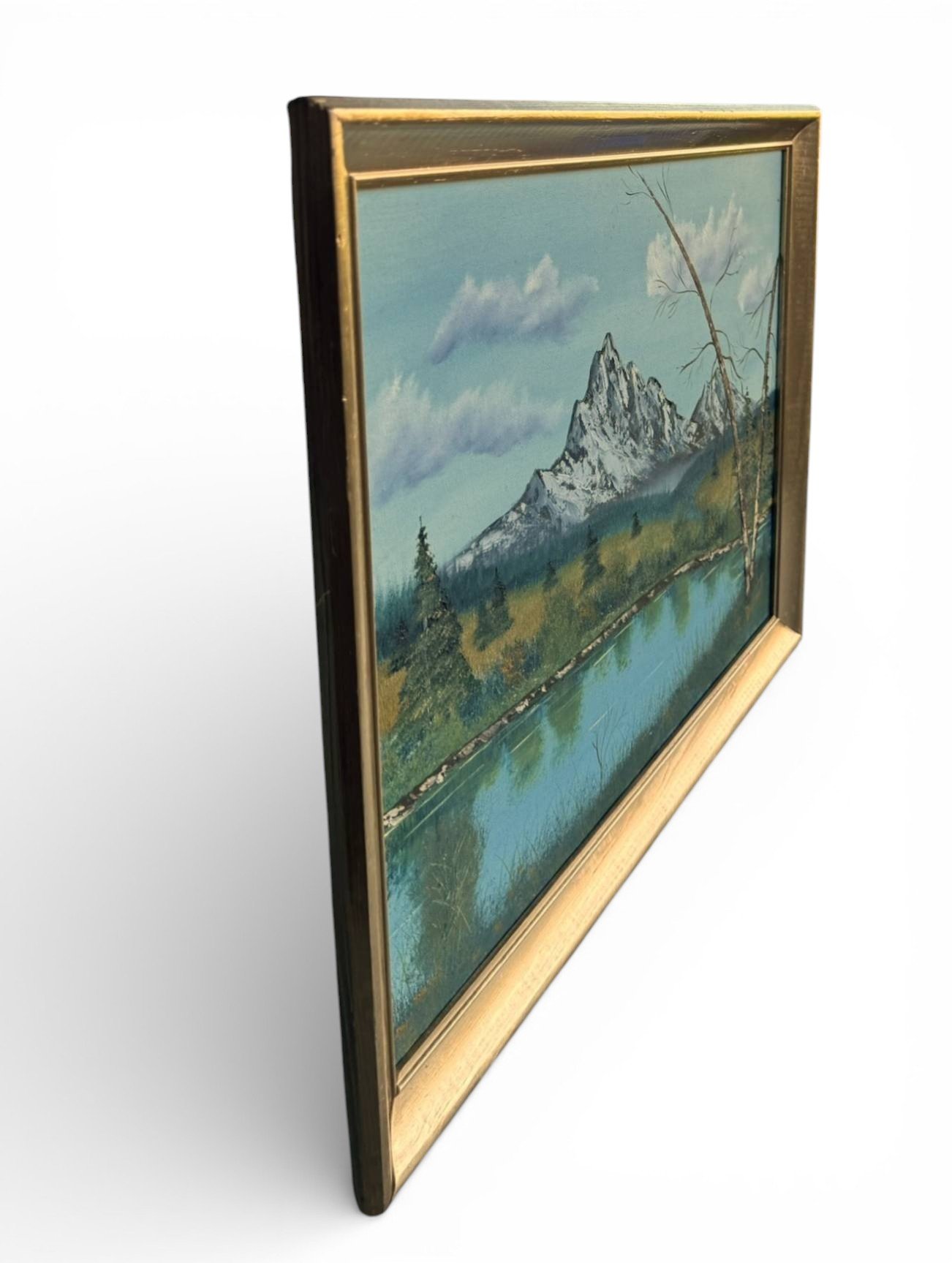 This beautiful vintage landscape painting from the 1970s captures a tranquil mountain scene with snow-covered peaks rising above a calm lake. Soft clouds drift across the sky while evergreen trees and meadow grasses frame the water, creating a peaceful and atmospheric composition.