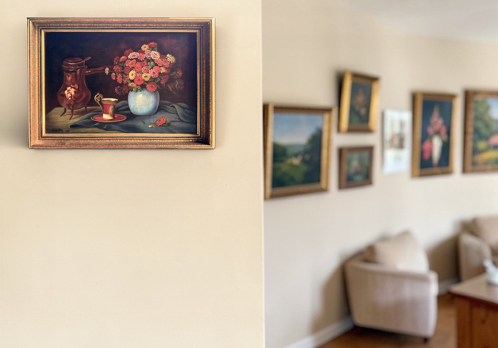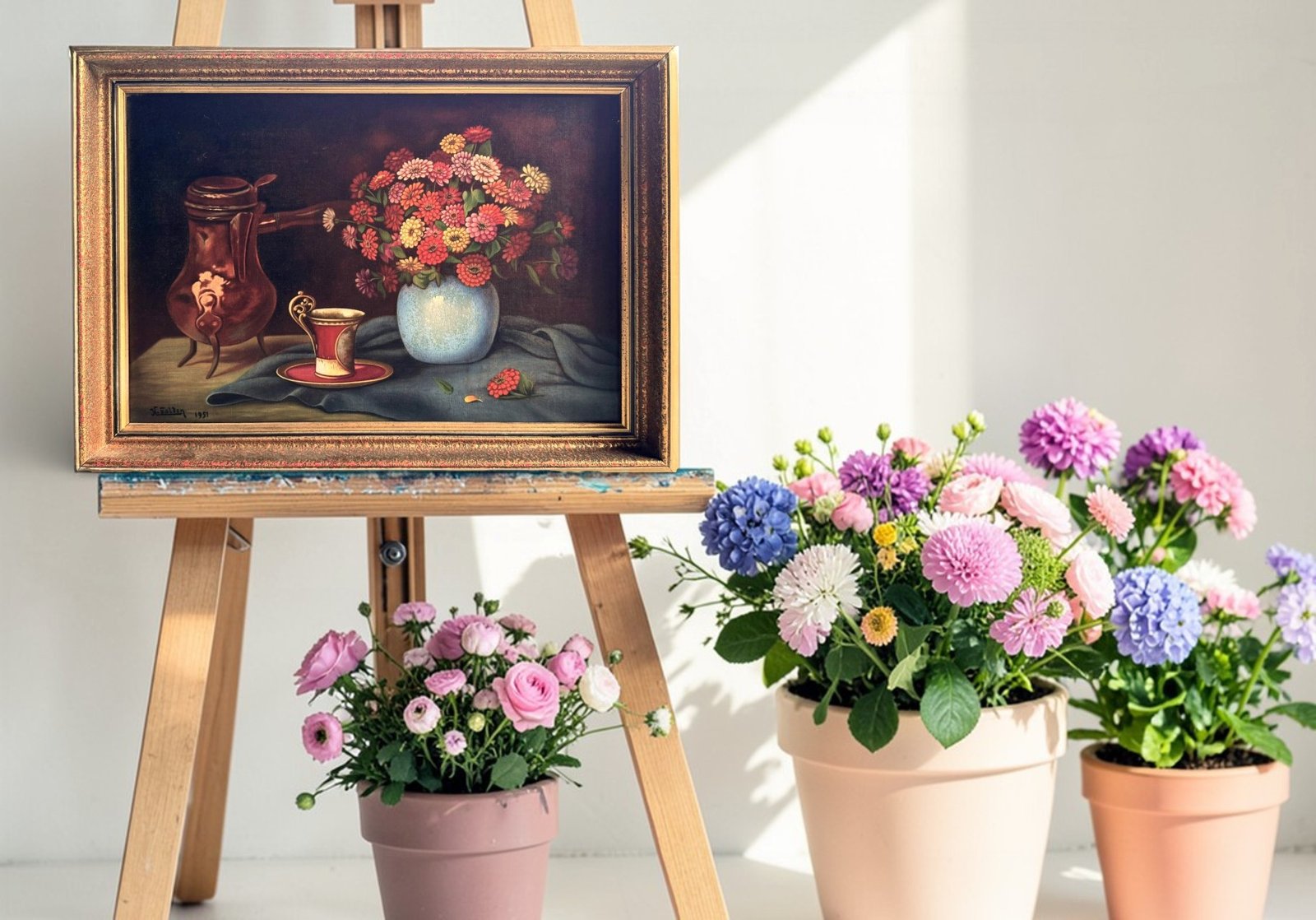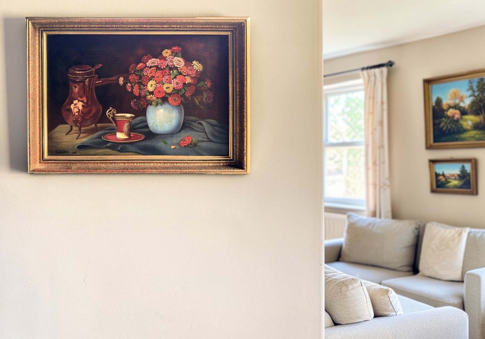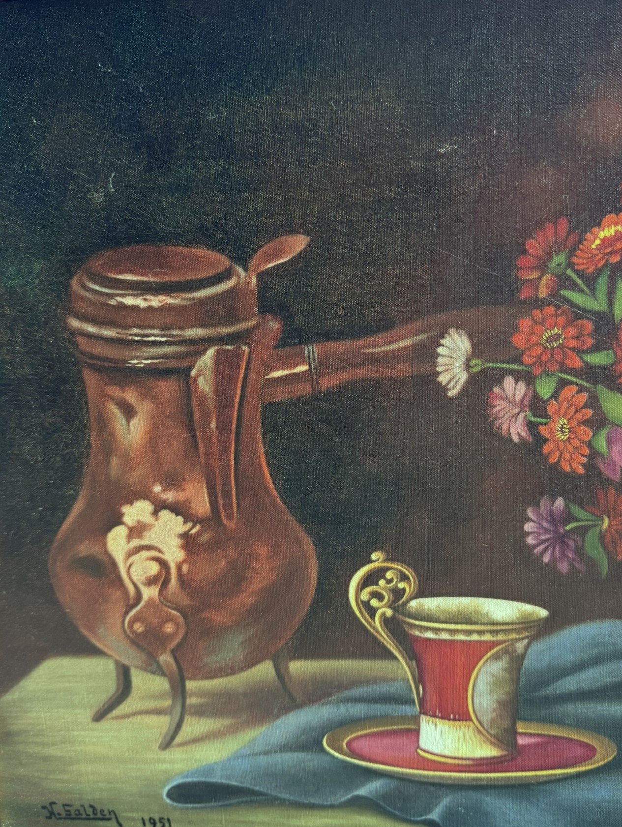 This charming mid-century still life painting from 1951 captures a warm and inviting scene: a vibrant bouquet of flowers arranged in a vase beside an elegant cup and a copper jug. The composition combines rich colors, soft lighting, and classic still-life balance, creating a timeless decorative piece perfect for traditional, vintage, or eclectic interiors.