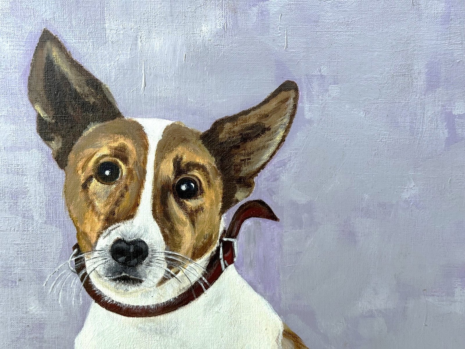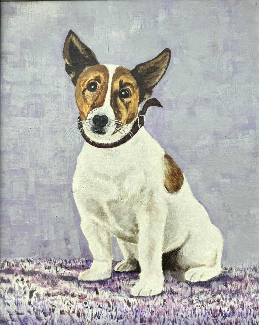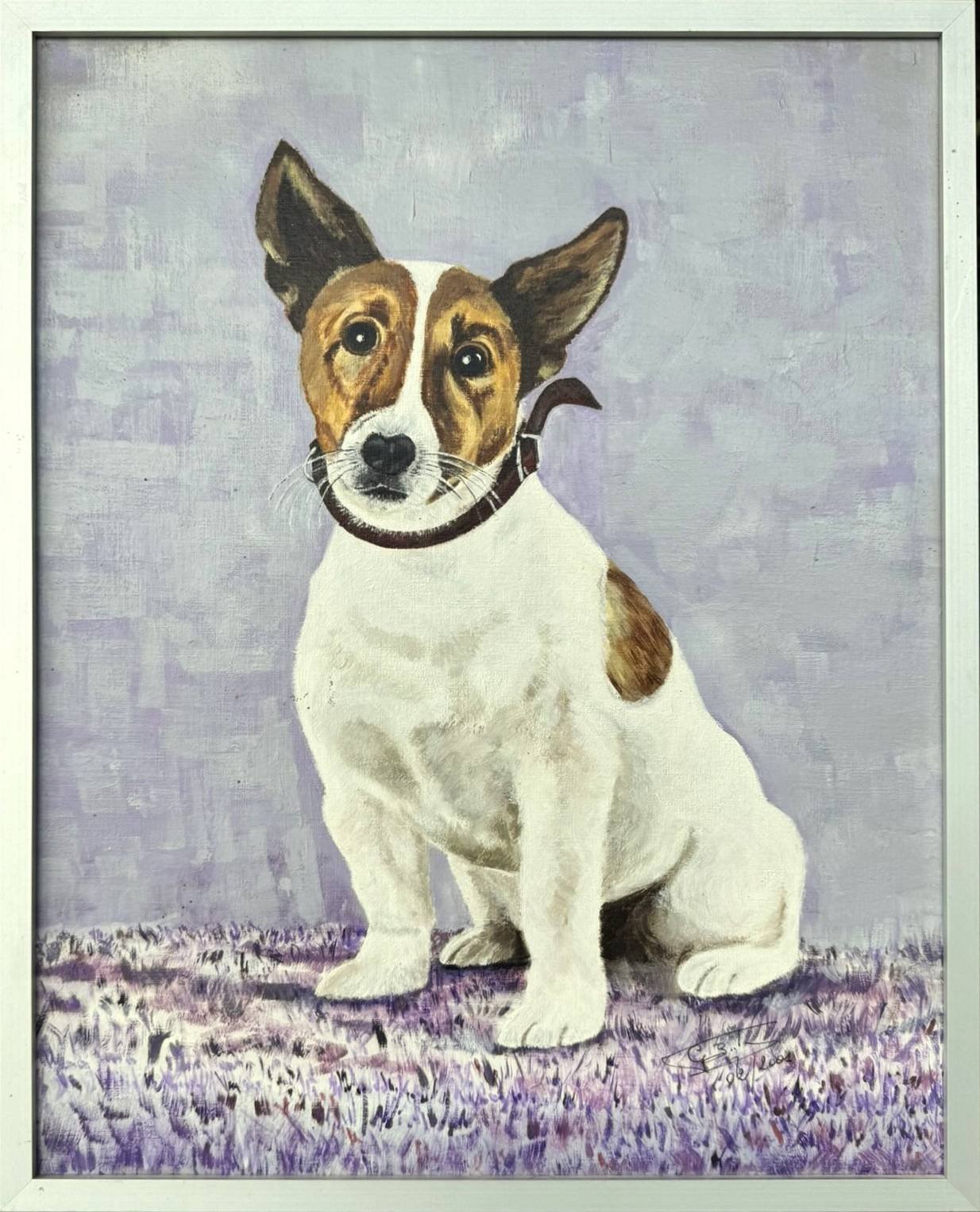 Vintage painting a Jack Russell Terrier signed and dated 2001. It’s an oil on canvas laid down on board. The soft lavender background beautifully contrasts with the dog’s white and brown coat, creating a calm yet eye-catching composition that fits effortlessly into both modern and traditional interiors.