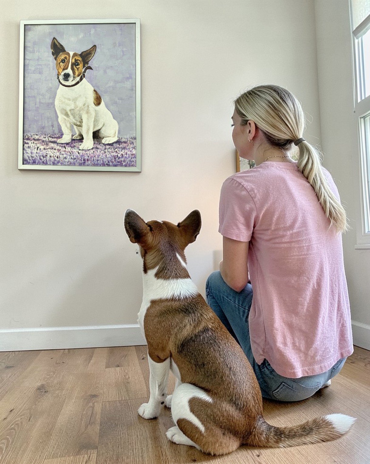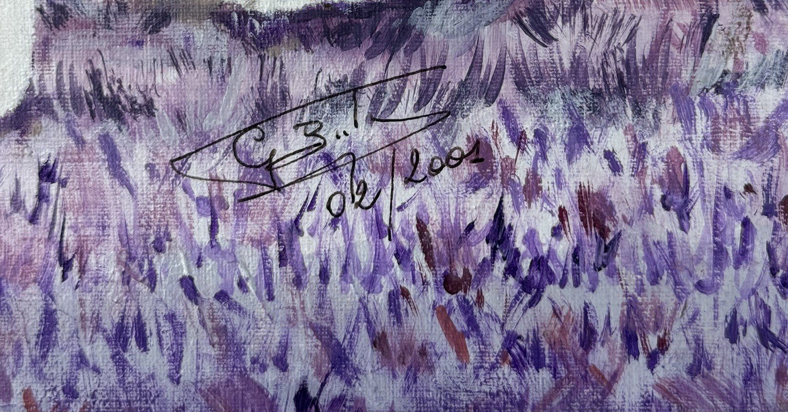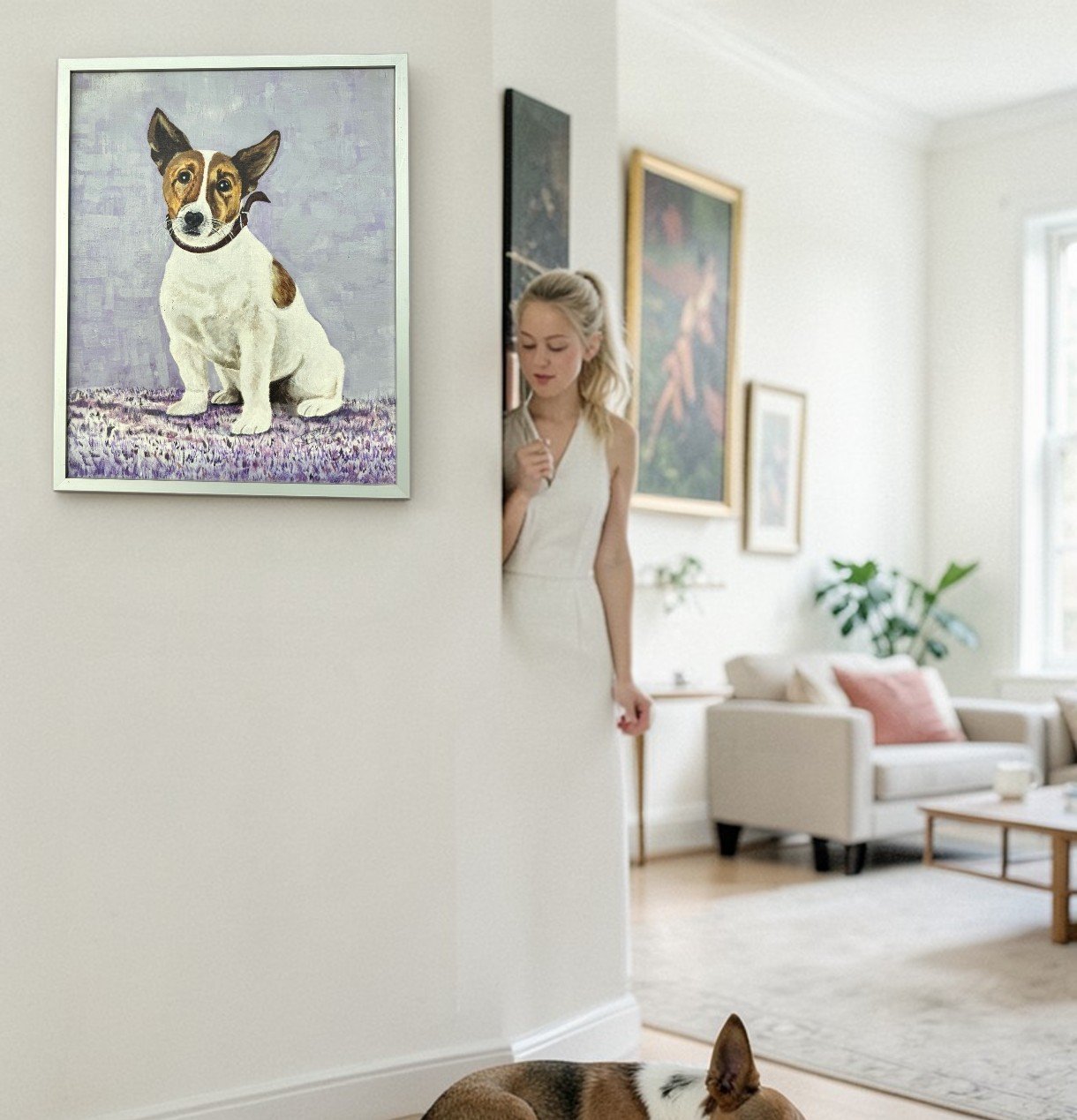 Vintage painting a Jack Russell Terrier signed and dated 2001. It’s an oil on canvas laid down on board. The soft lavender background beautifully contrasts with the dog’s white and brown coat, creating a calm yet eye-catching composition that fits effortlessly into both modern and traditional interiors.