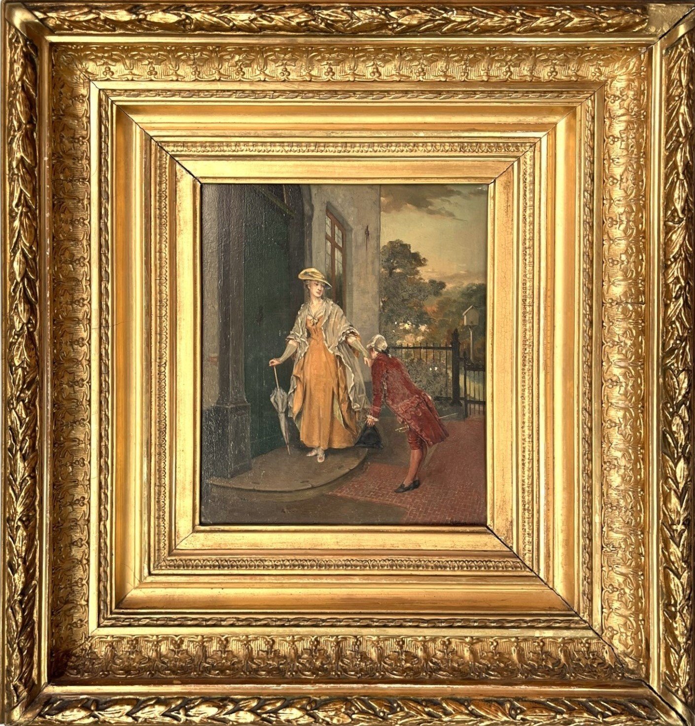 Antique Painting, Gallant Scene at the Doorstep, signed and dated