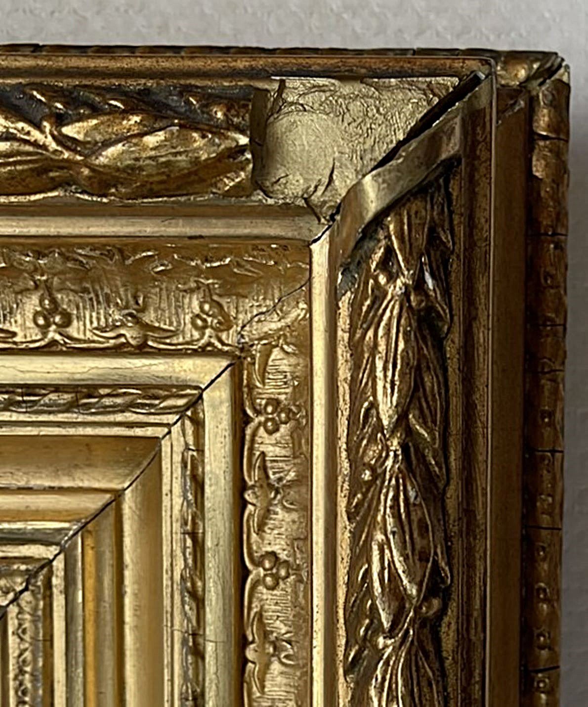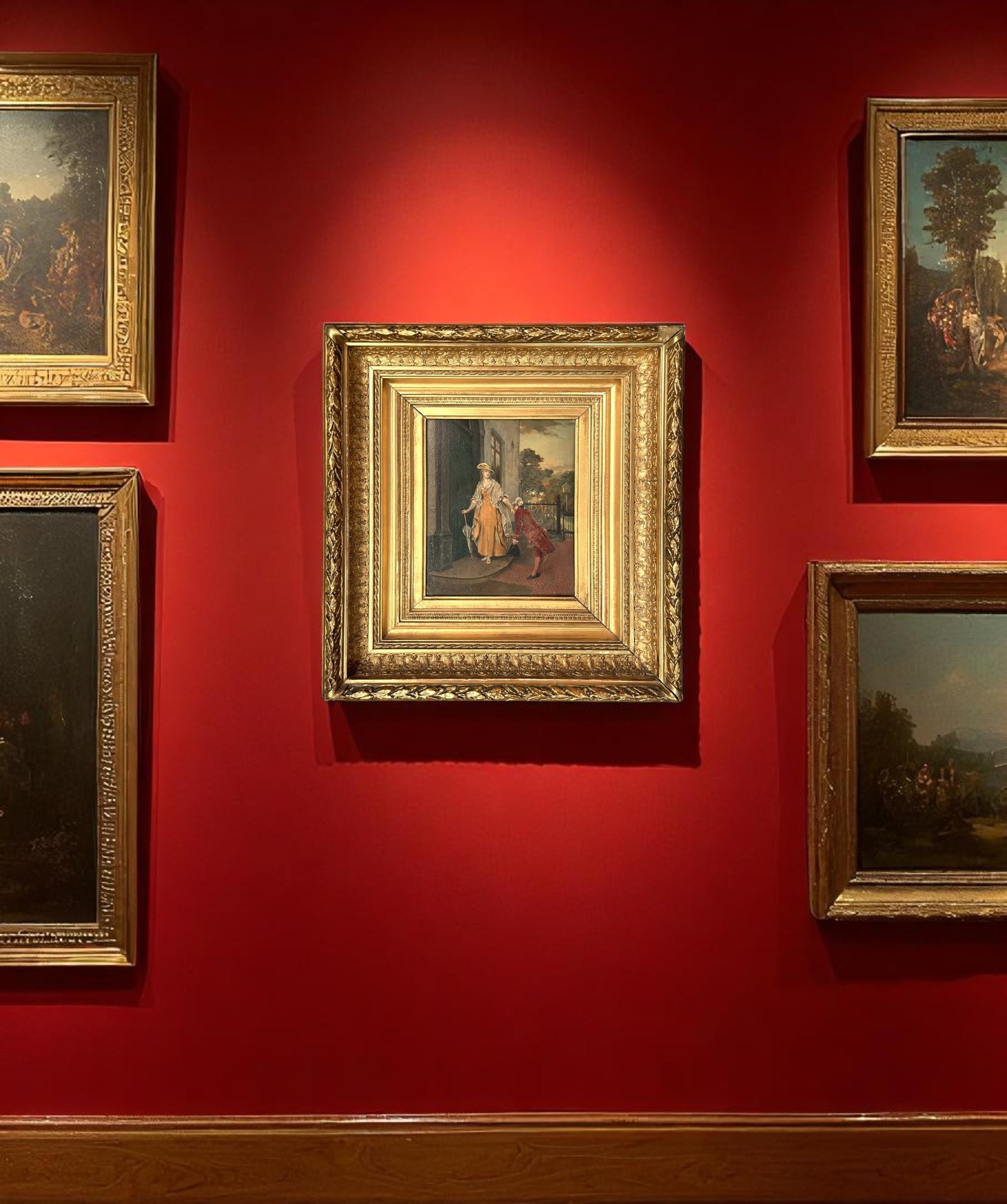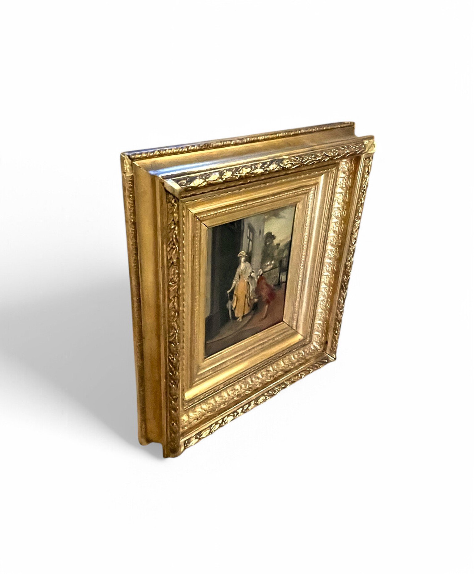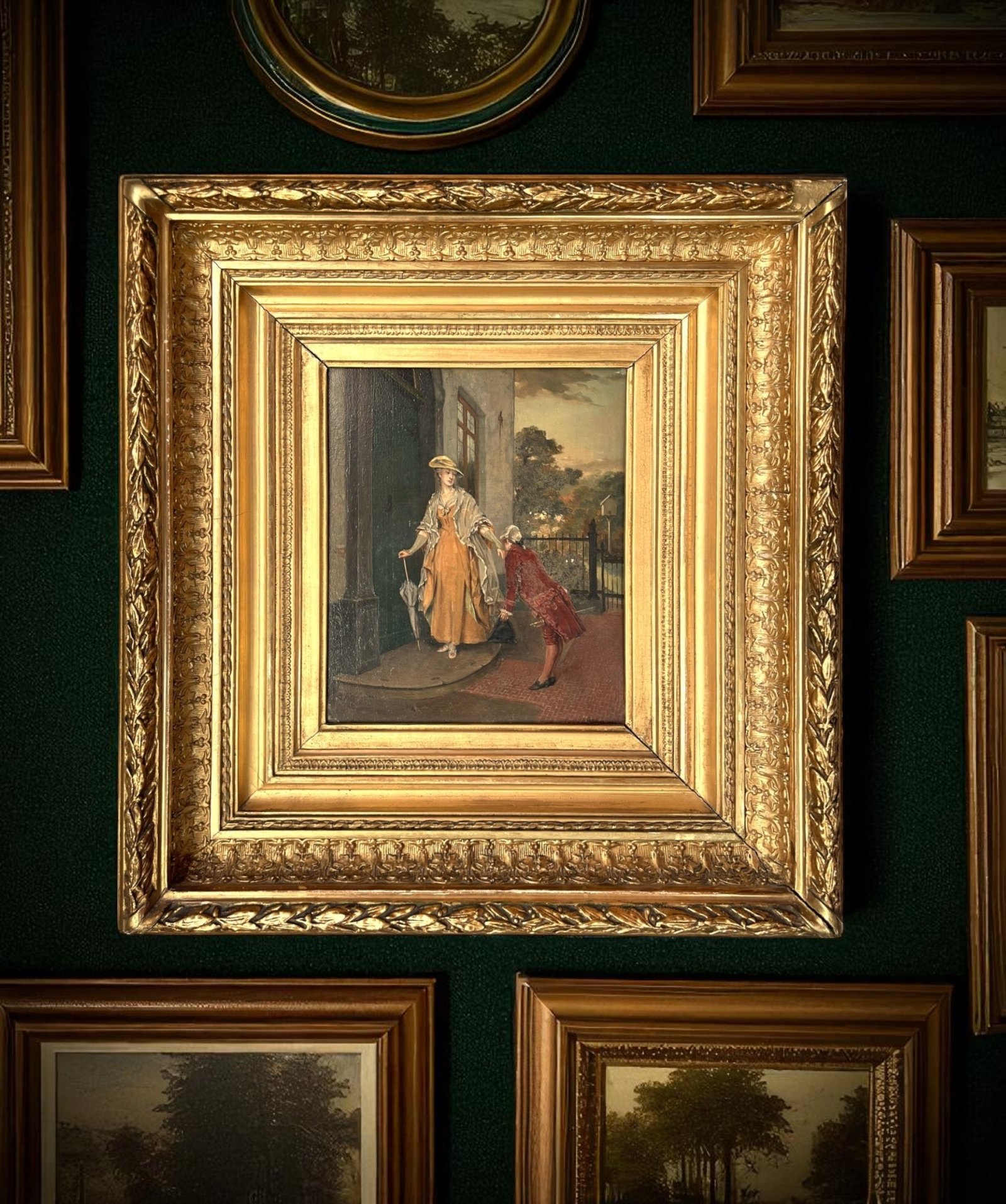 This exquisite painting is an original oil on wood. It's a beautifully decorative representation of gallantry towards ladies from "higher circles" in the 19th century. In the scene, the man is even depicted as more minor than the lady he's escorting at the doorstep, clearly showing that this lady was a person from a highly esteemed circle at the time. A magnificent late 19th-century painting with a social touch, signed and dated 1886, is in relatively good condition considering its age and beautiful original frame. On the contrary, there is some little discoloration on the man's jacket as you can see in the photo. The red pigment in the oil paint has given up after 140 years... It's an antique painting, you know, these imperfections have to be included. The frame has minor damage to the upper right corner as you can see in the image. Here and there, some minuscule chalk flakes have been touched up with gold-colored paint, including the corner damage. It certainly doesn't detract from the beauty of the artwork as a whole, considering the age. All colors in this artwork are subjective and may vary on your monitor.