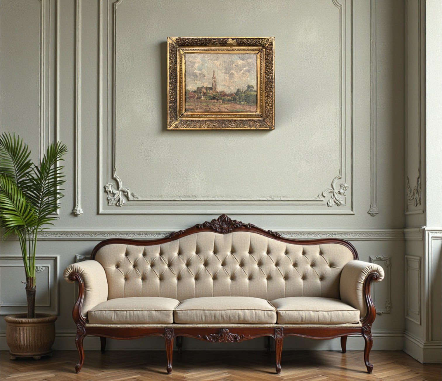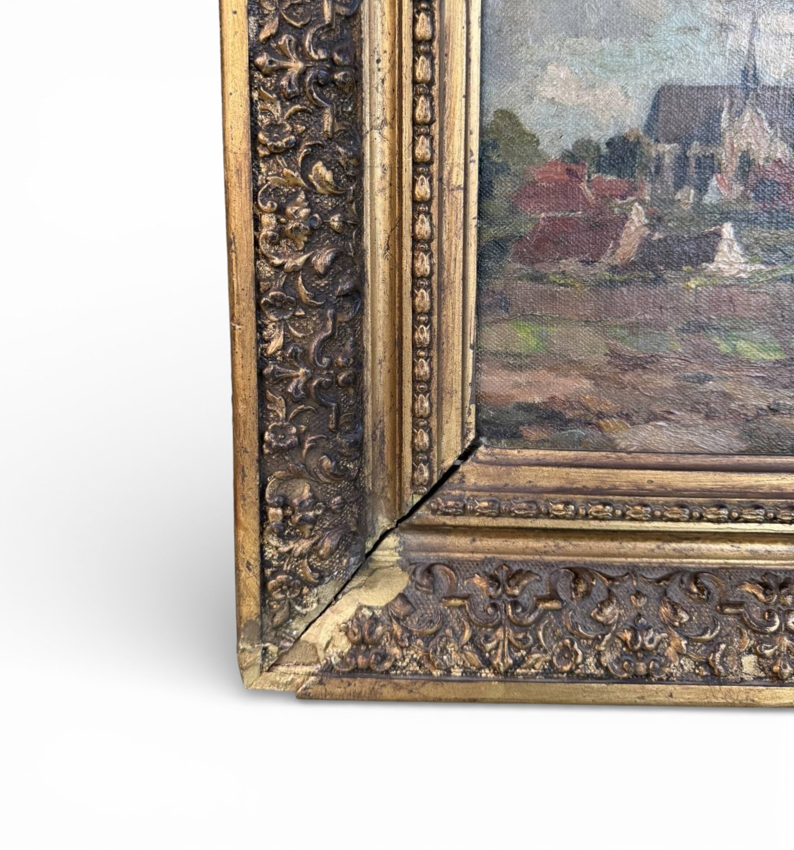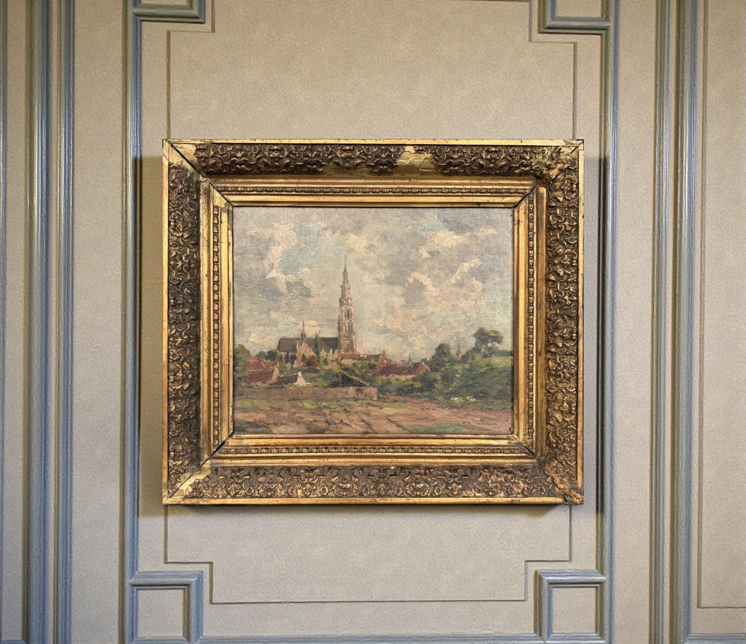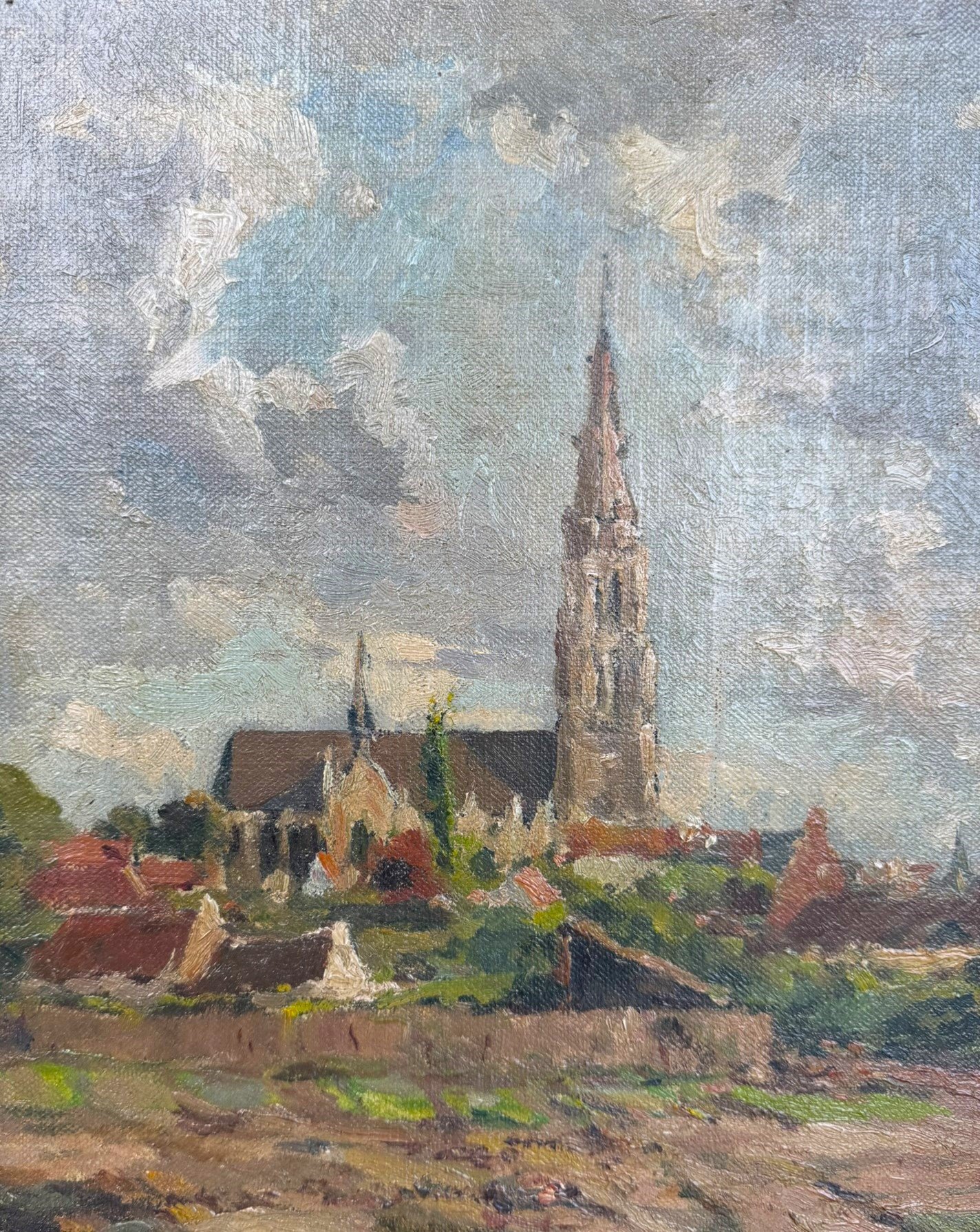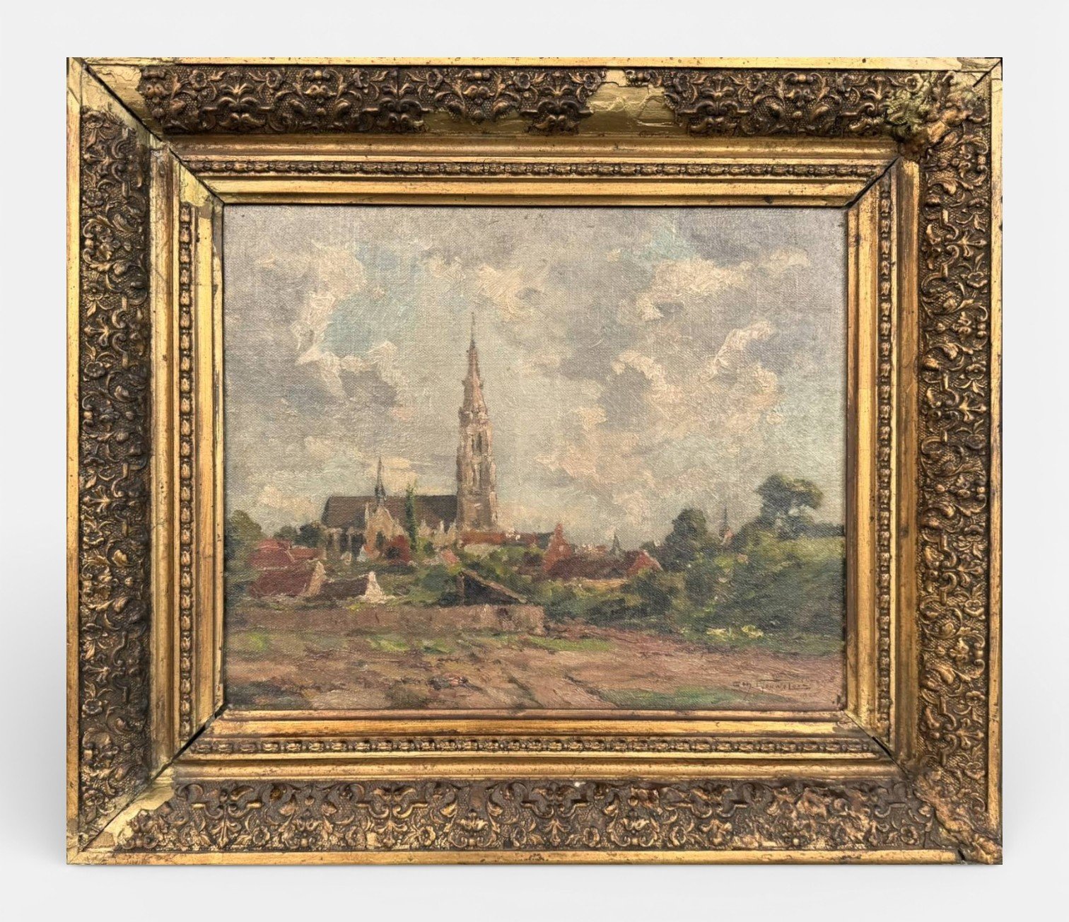 This beautiful original oil painting presents a serene European townscape dominated by a striking church tower rising above a rural landscape. Painted with expressive brushwork and a refined color palette, the artwork captures the tranquil atmosphere of early 20th-century Europe.
