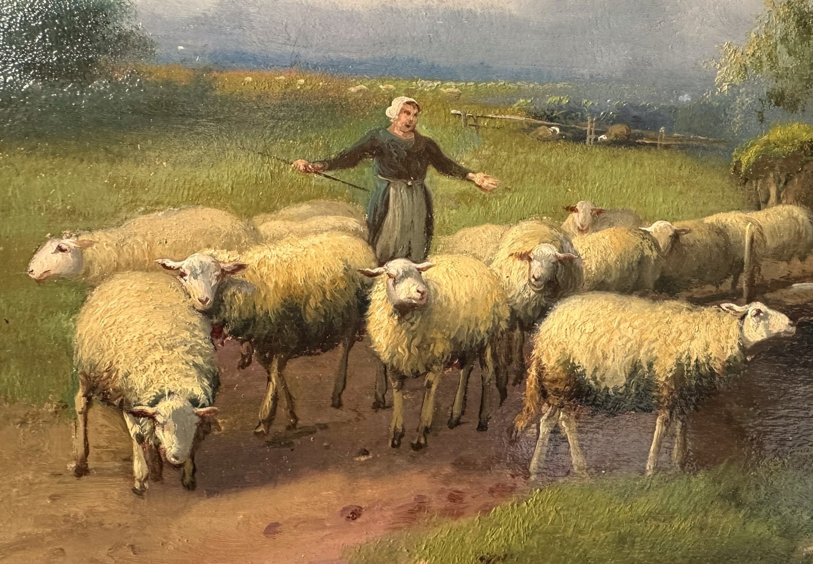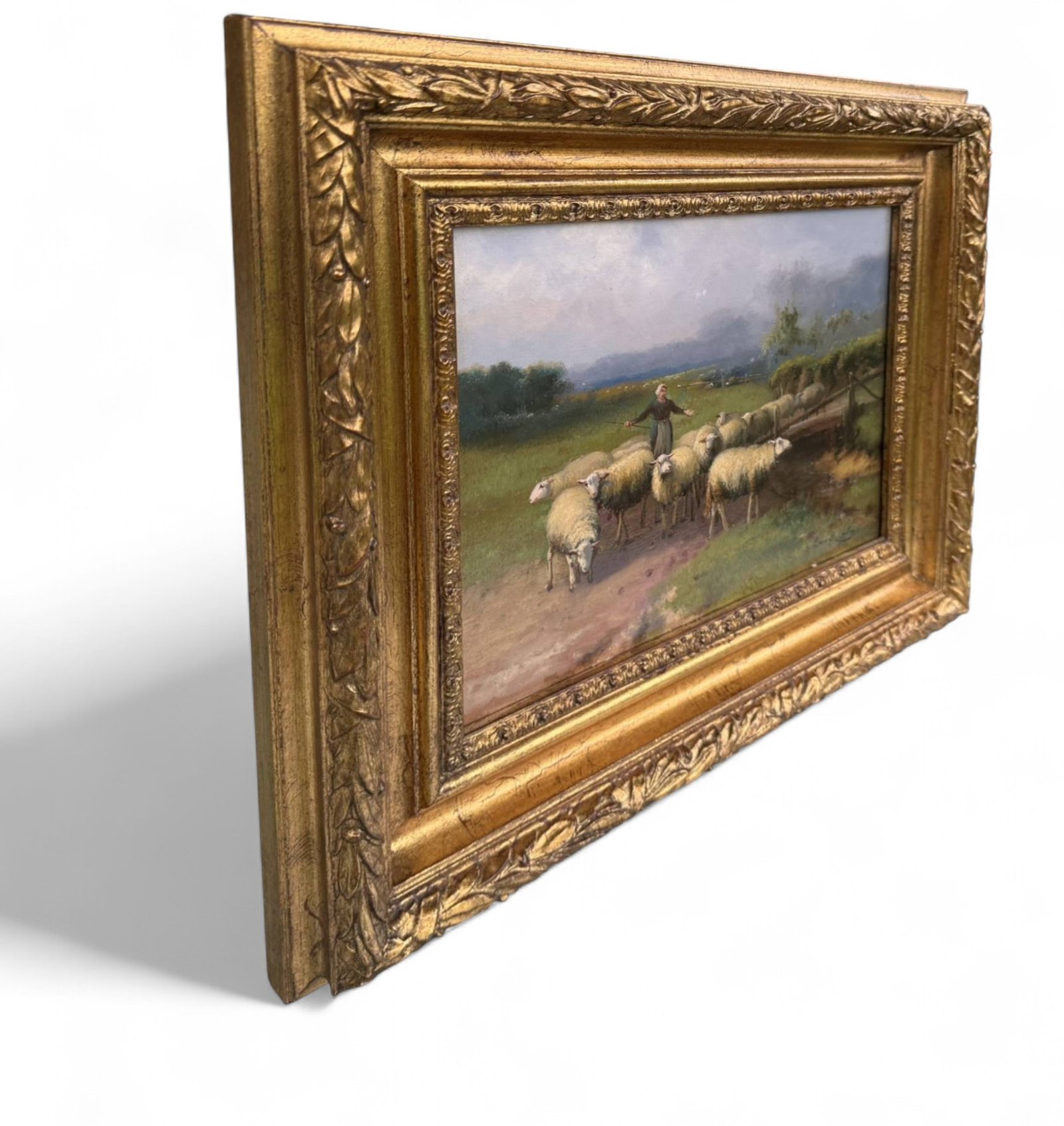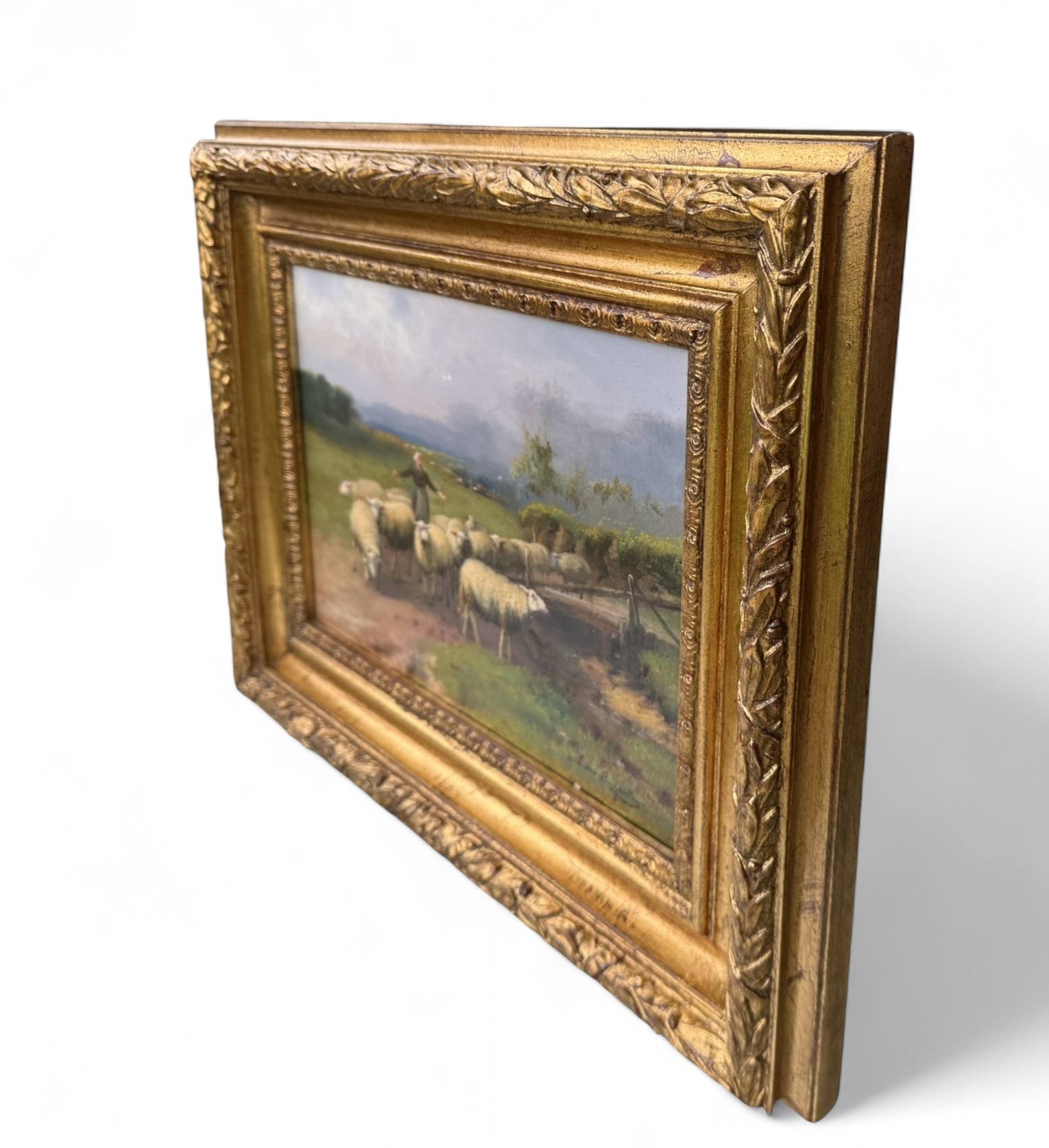 Step into a tranquil pastoral scene with this charming vintage oil painting, perfect for adding a touch of classic European rustic elegance to your home or gallery wall. This piece captures a shepherd guiding a flock of sheep along a country path, beautifully rendered with a soft, naturalistic palette. The composition evokes a sense of timeless rural life and calm.