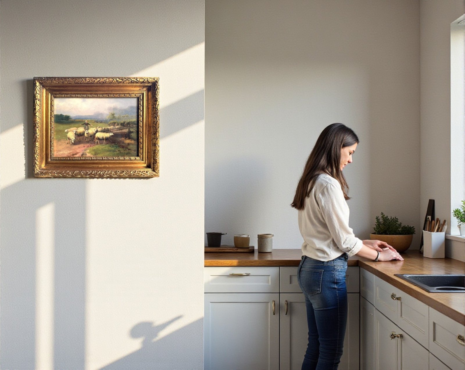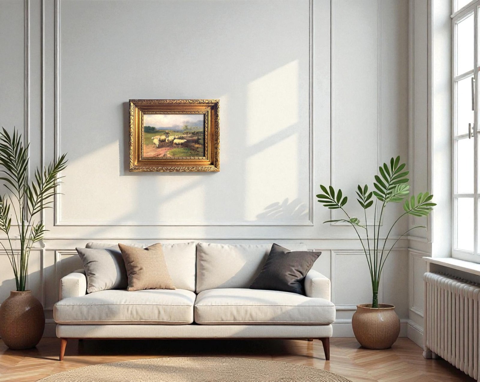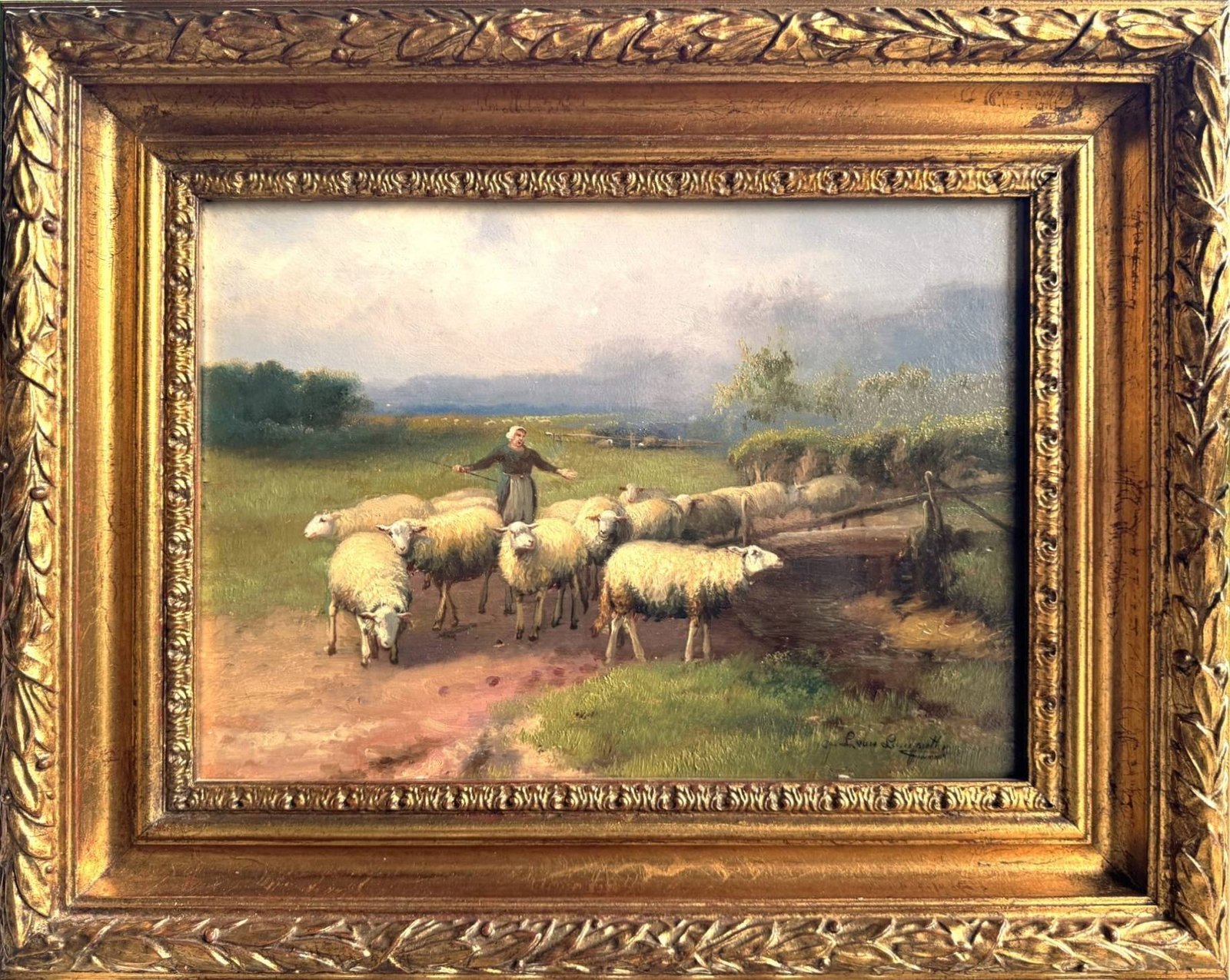 Step into a tranquil pastoral scene with this charming vintage oil painting, perfect for adding a touch of classic European rustic elegance to your home or gallery wall. This piece captures a shepherd guiding a flock of sheep along a country path, beautifully rendered with a soft, naturalistic palette. The composition evokes a sense of timeless rural life and calm.