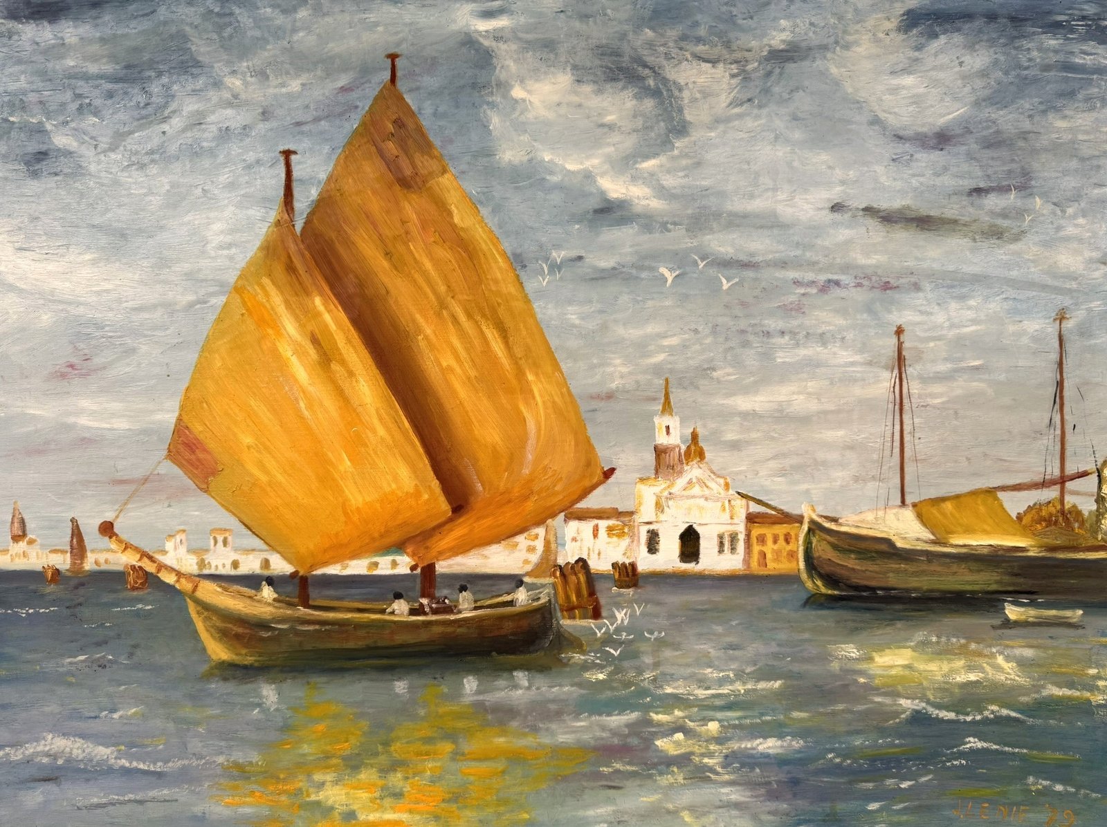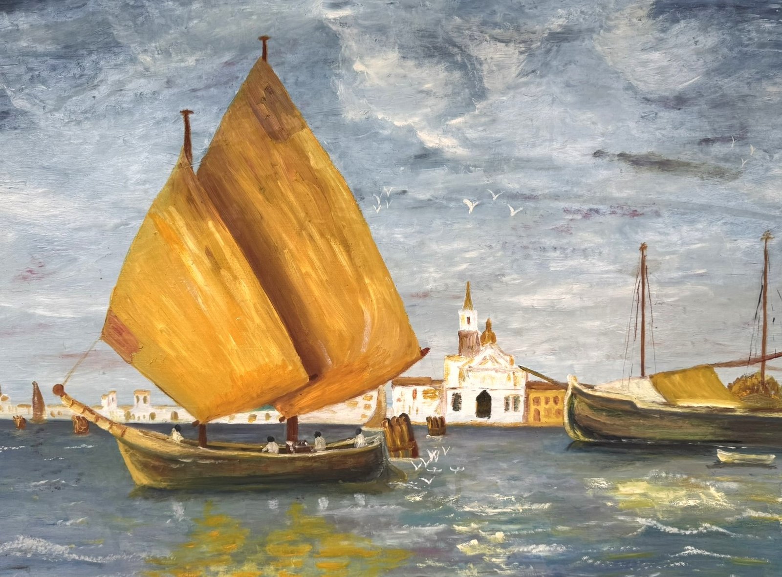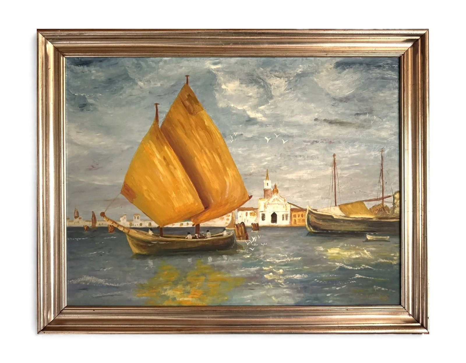 All paintings / Venetian Harbor Painting with Sailboats, signed and dated