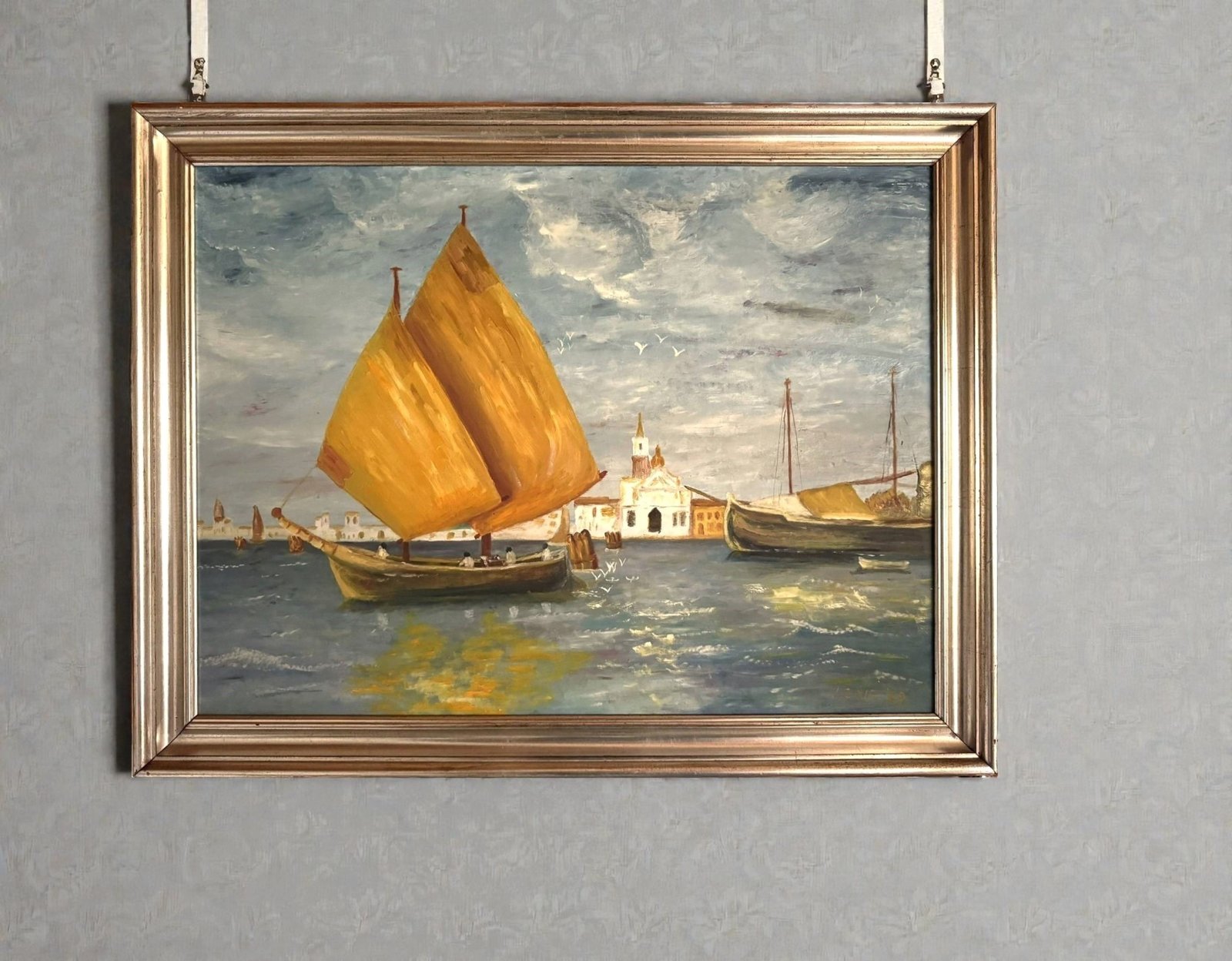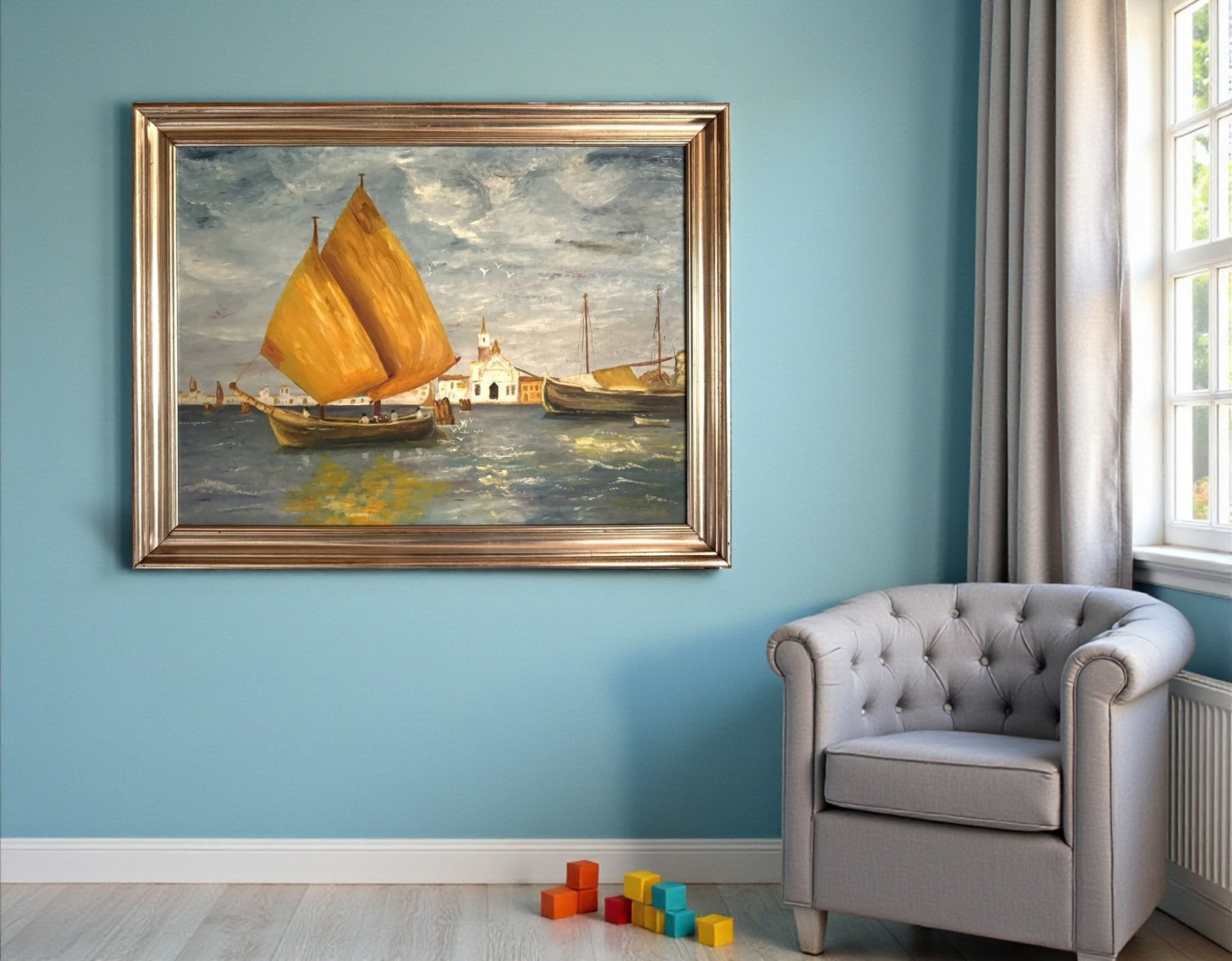 This beautiful, large-framed oil painting depicts a classic Venetian marina scene with sailing boats, inspired by traditional Italian maritime art. The painting based on the work of Gulielmo Ciardi (1842-1917) The Marina of San Giorgio Maggiore, an Island of Venice.