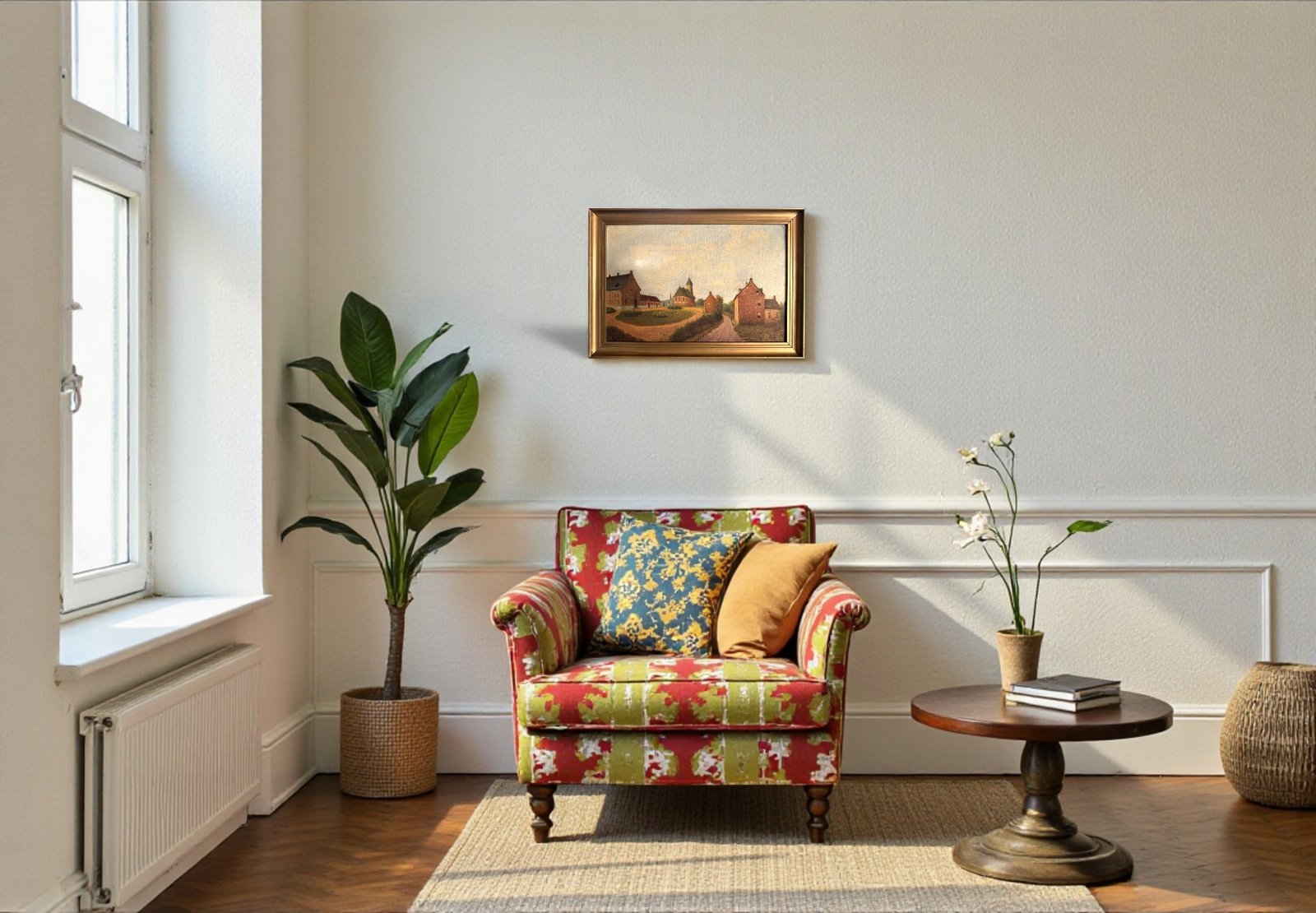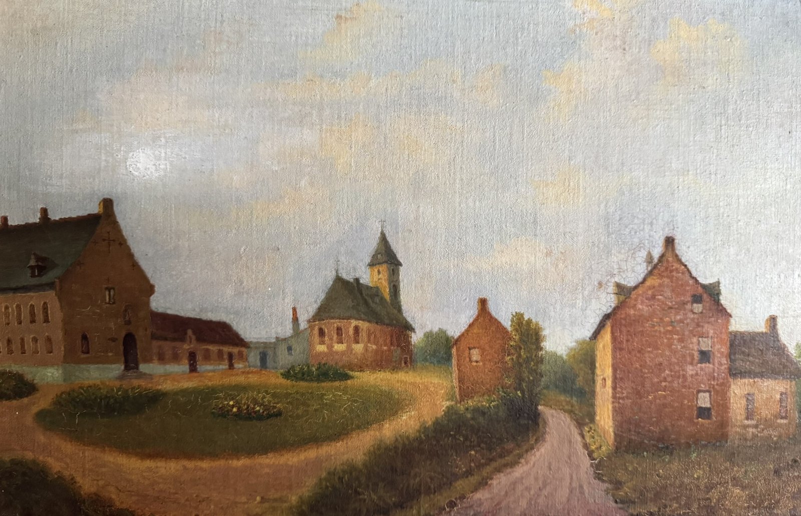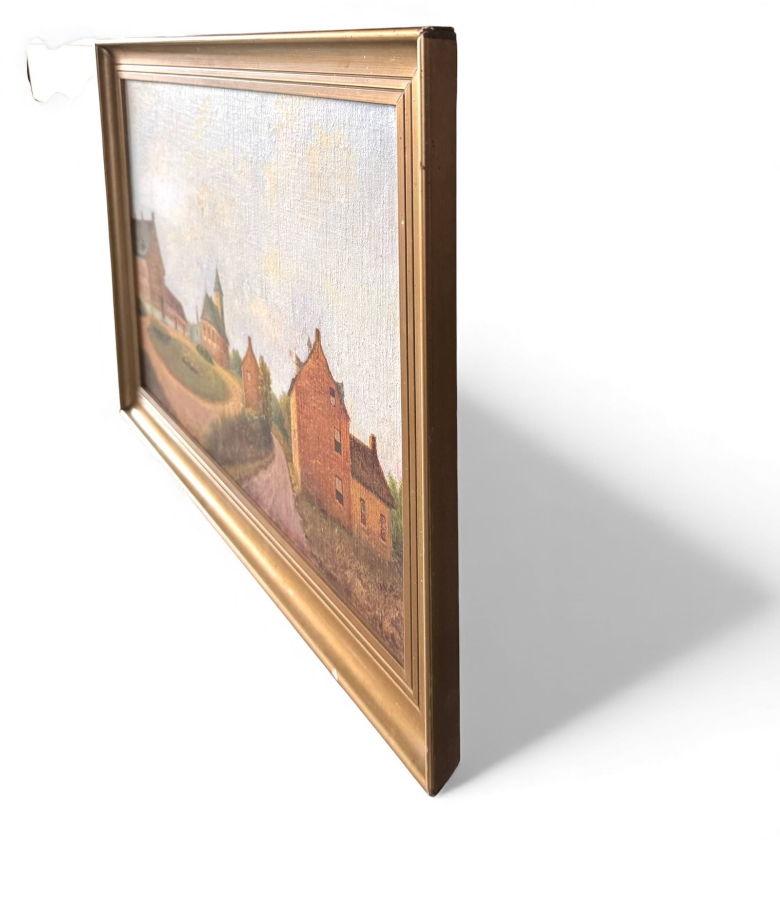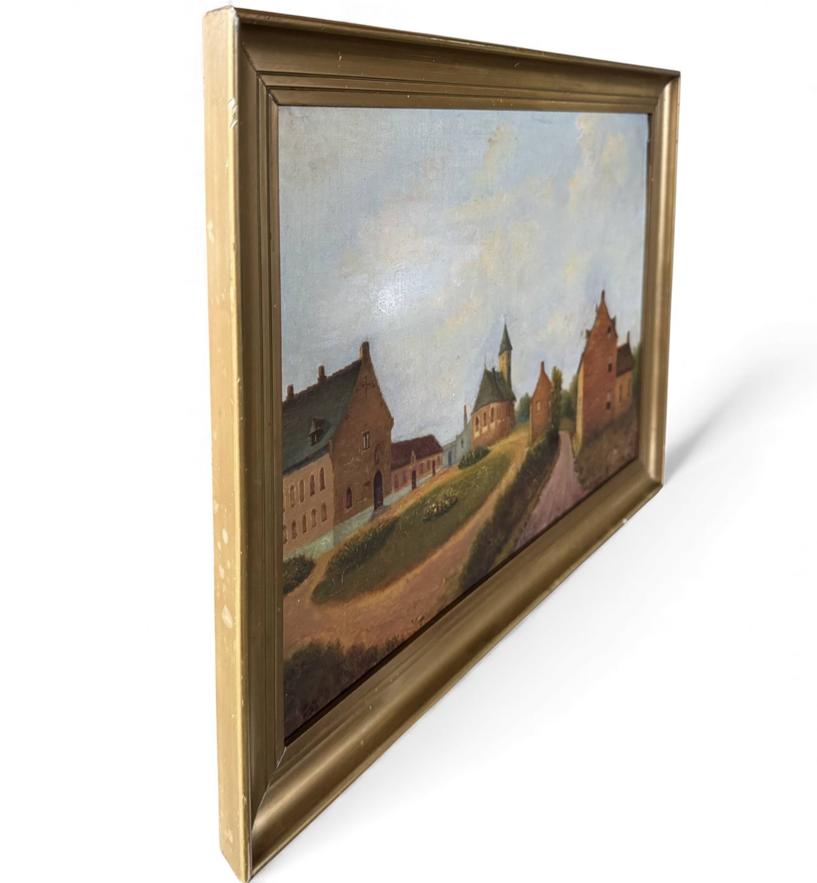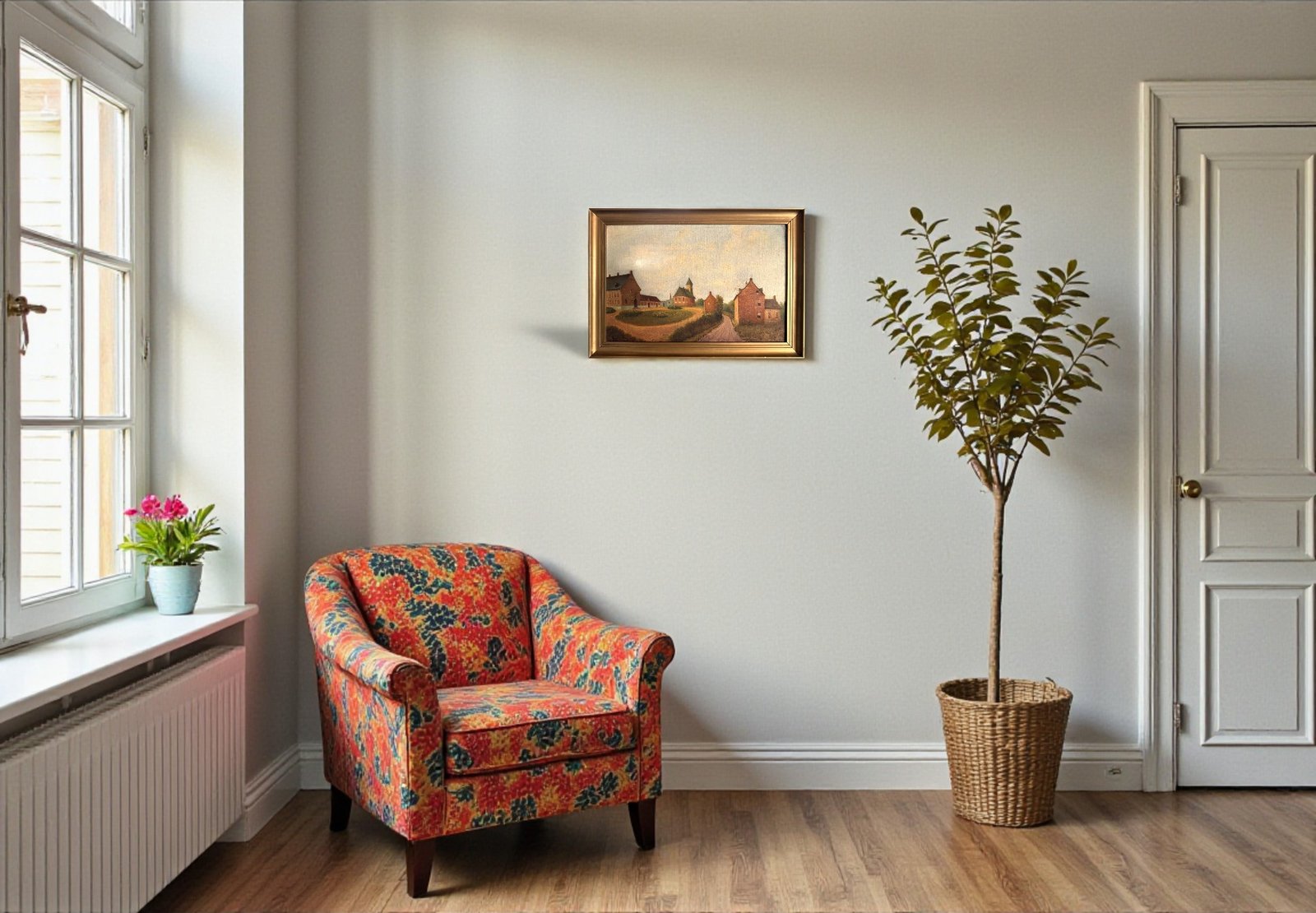 Step into the warmth and charm of early 20th-century European village life with this beautiful antique oil painting. Captures a serene rural scene featuring classic brick buildings, a winding path, and a soft, peaceful sky. The gentle colors and subtle texture give this artwork a wonderfully nostalgic atmosphere that feels both historic and inviting.