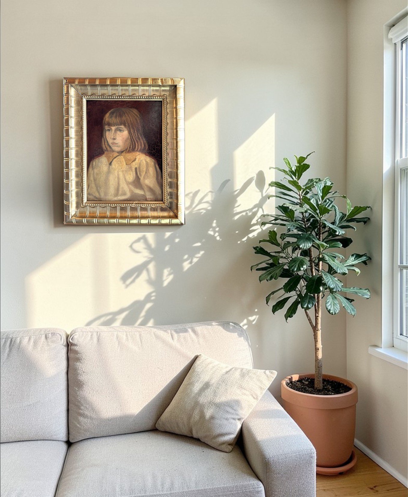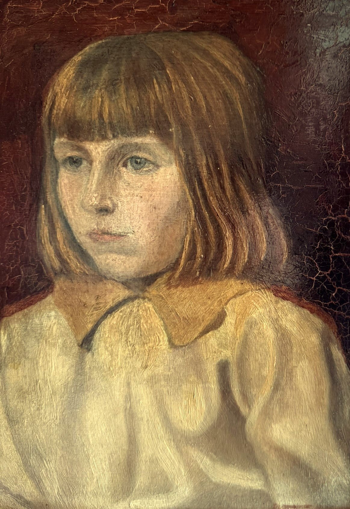 The portrait reflects the softness and intimacy characteristic of Victorian-era portraiture. The warm, muted background contrasts gently with the delicate facial features and natural tones of the girl’s attire. The subtle brushwork and aged patina give the painting authentic antique charm that only time can create.