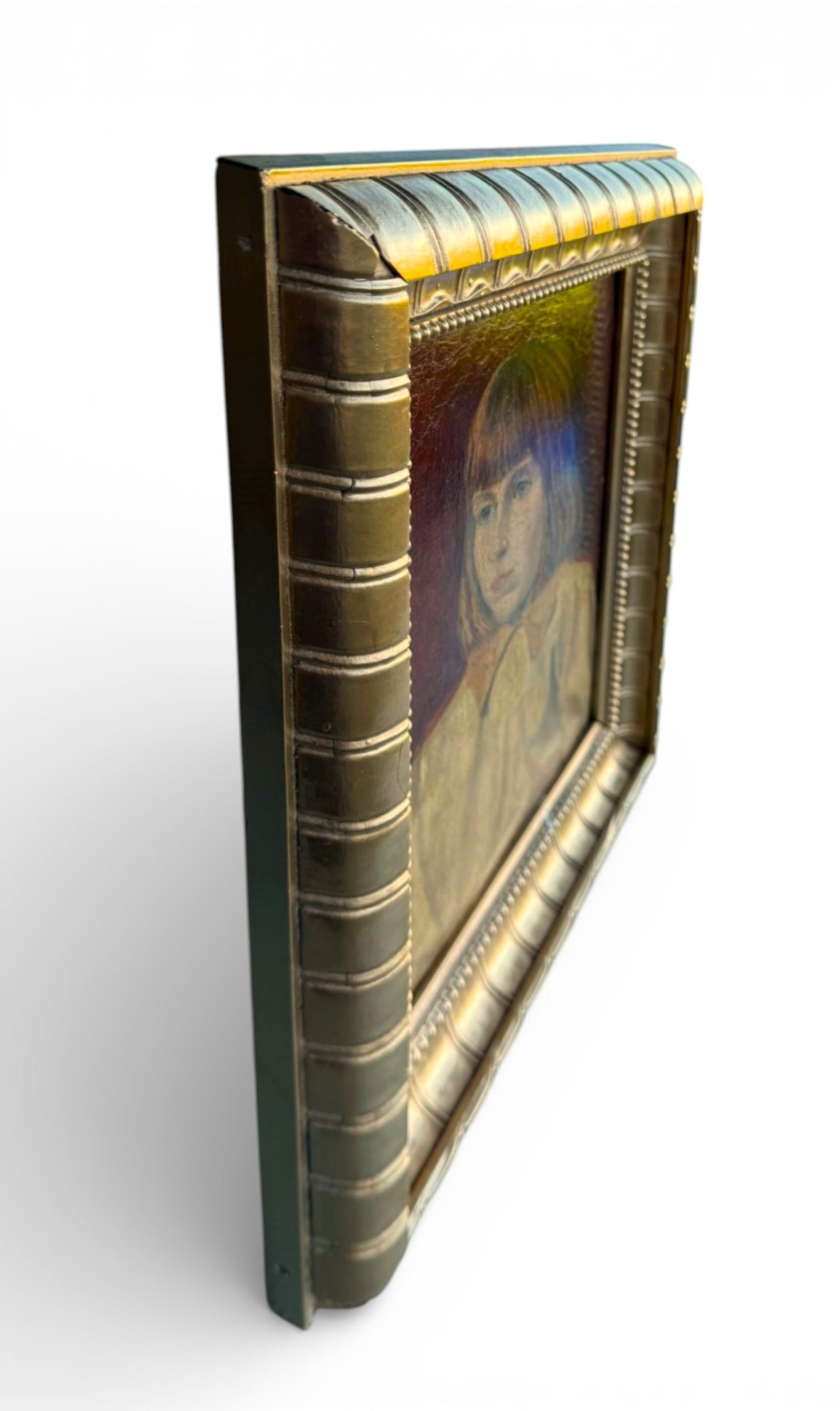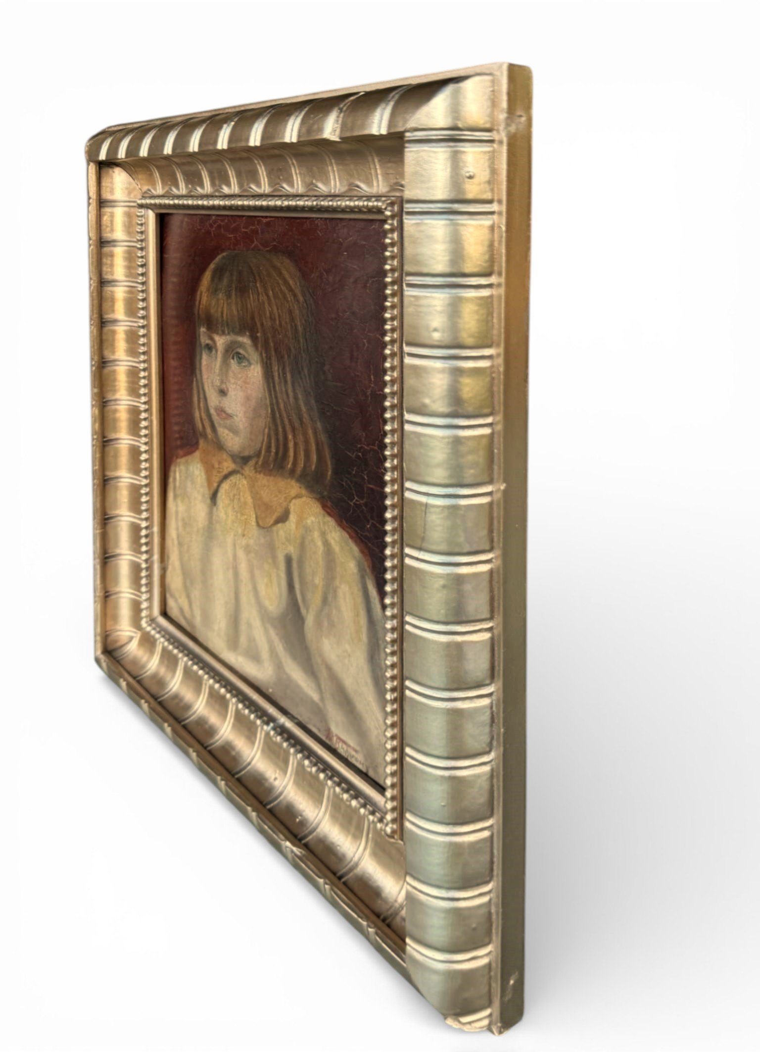 This is an antique painting titled “Young Girl.” The work is signed, although unfortunately the signature is illegible to us. It is a late 19th-century piece, beautifully capturing the quiet, contemplative expression of a young child.